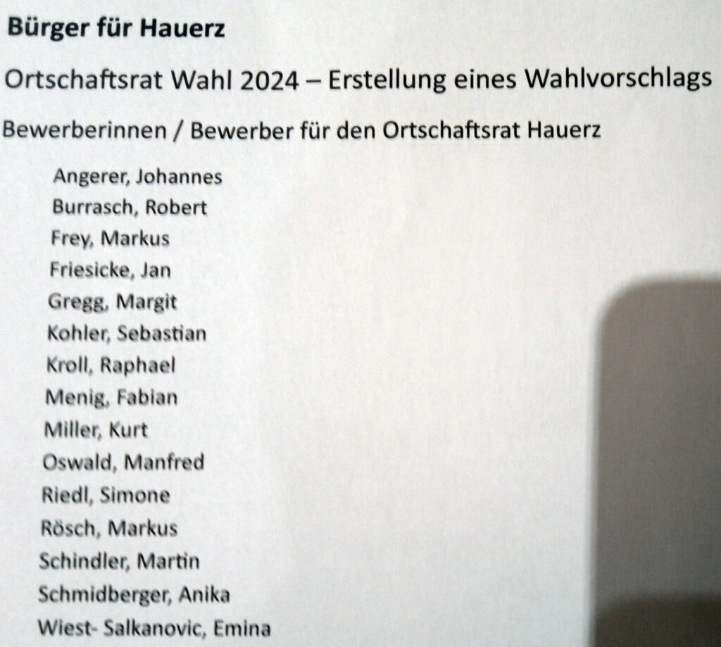Hauerz – Rund zwei Dutzend Gäste waren zum Oberen Wirt gekommen, um die Liste mit den 15 Kandidaten des Wahlvorschlags für die Ortschaftsratswahl am 9. Juni zu bestätigen. Orstvorsteher Kurt Miller hatte in fleißiger Vorarbeit 15 Kandidaten gefunden, die sich für die acht Sitze im Ortschaftsrat bewerben.