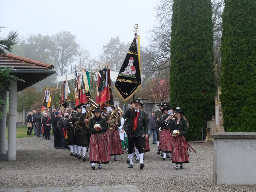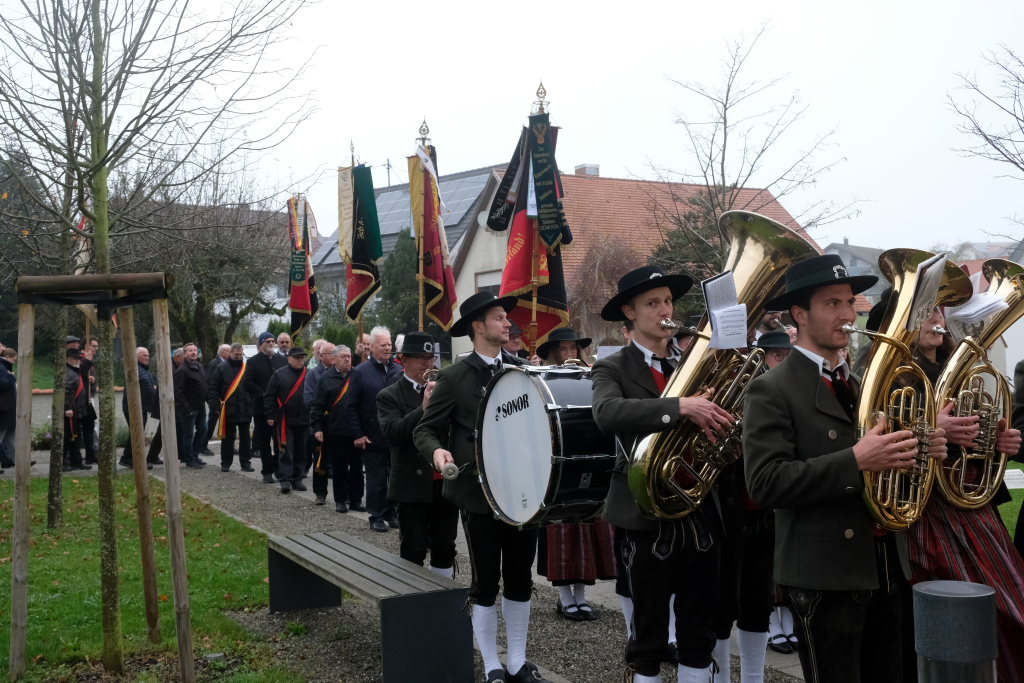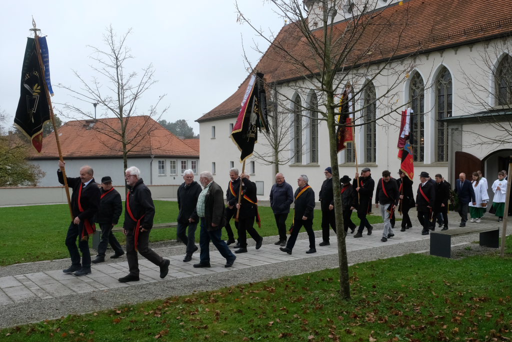 Angeführt von der Musikkapelle Eggmannsried zogen die Fahnenabordnungen der verschiedenen Kriegervereine aus der Umgebung vom 1921 zum Andenken an die Unterschwarzacher Gefallenen des Ersten Weltkrieges errichteten Kriegerdenkmals bei der Aussegnungshalle zum Gottesdienst in die Kirche.