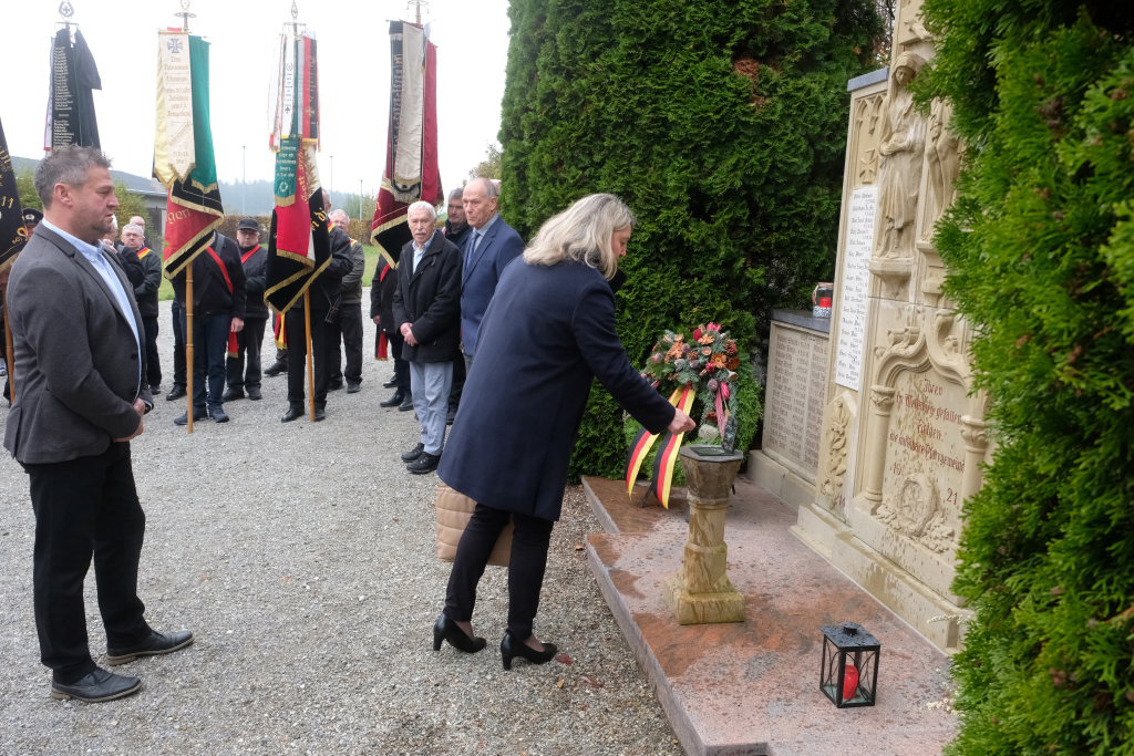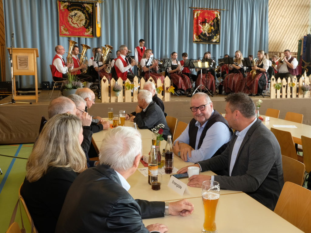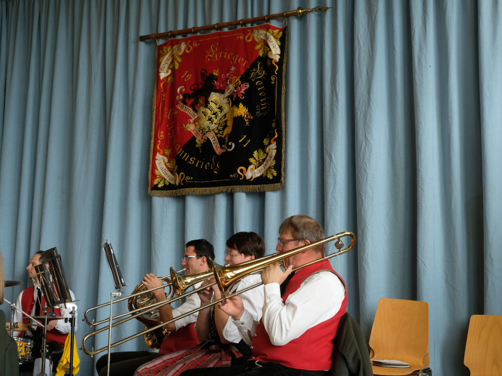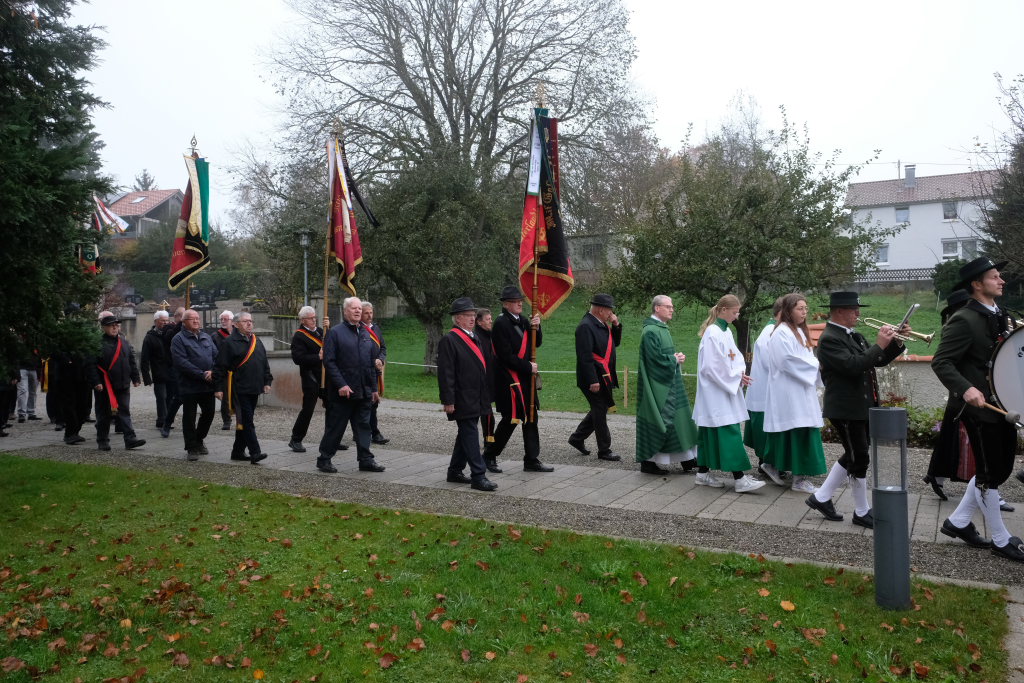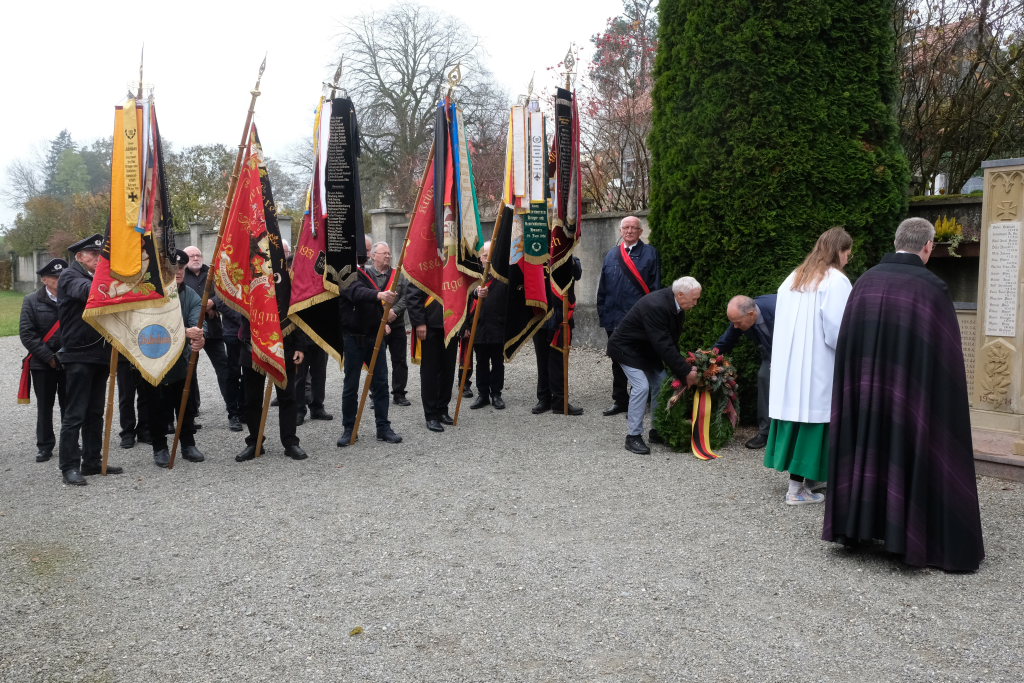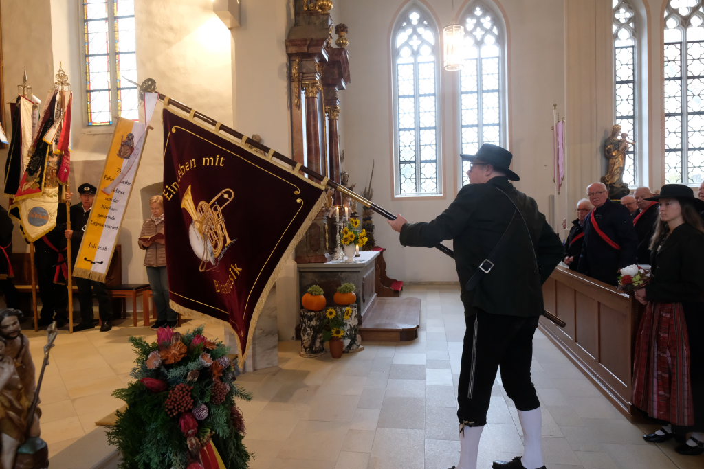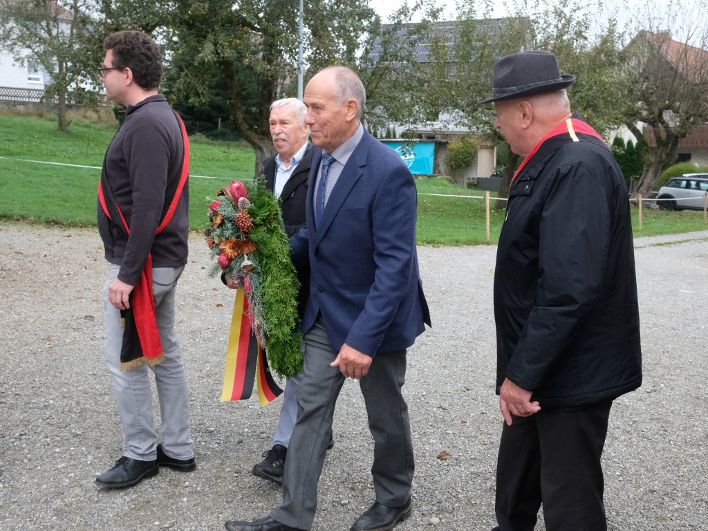 Nachdem die Fahnenabordnungen und die anderen Gottesdienstteilnehmer, allen voran Bürgermeisterin Alexandra Scherer, den Gefallenen der Kriege ihre Ehrerbietung erwiesen hatten, zog die nunmehr weltliche Prozession in die Festhalle hinauf, wo die Musikkapelle zum festlichen Frühschoppen mit einigen überraschenden lukullischen Genüssen aufspielte.