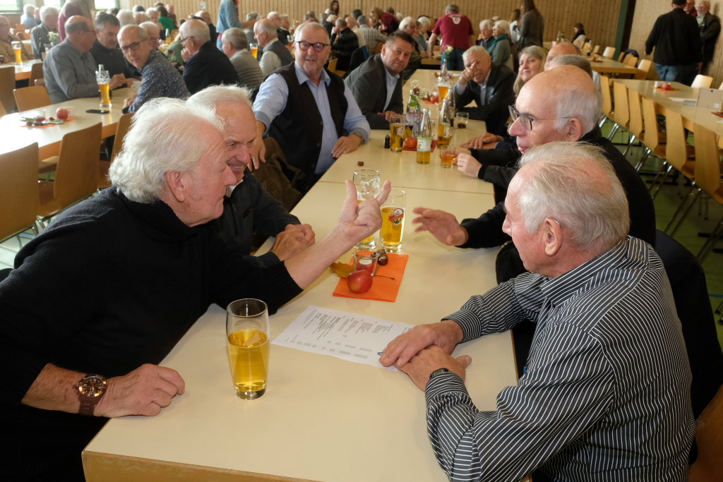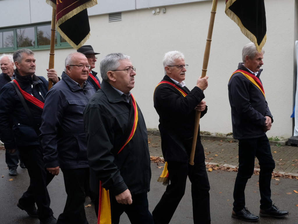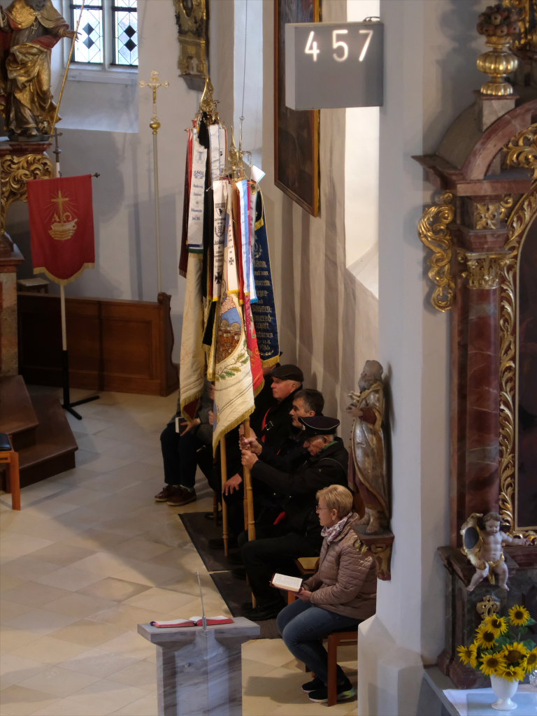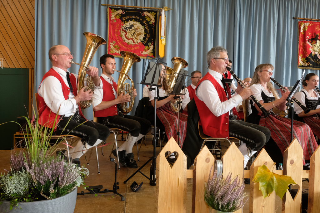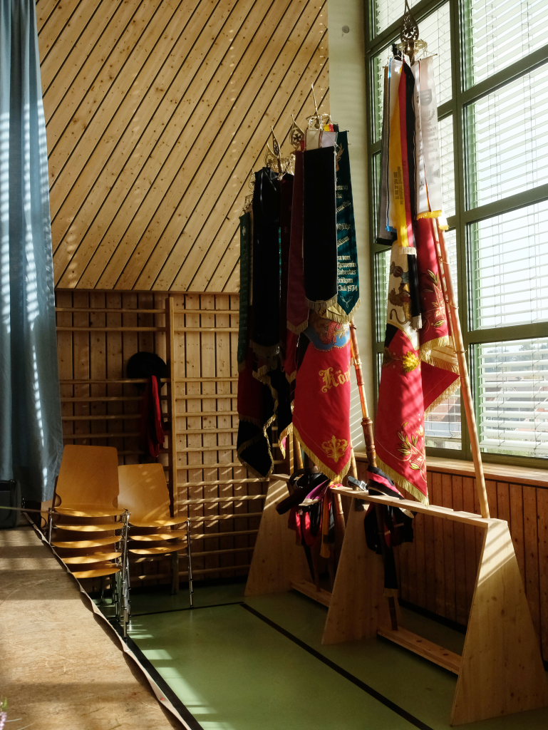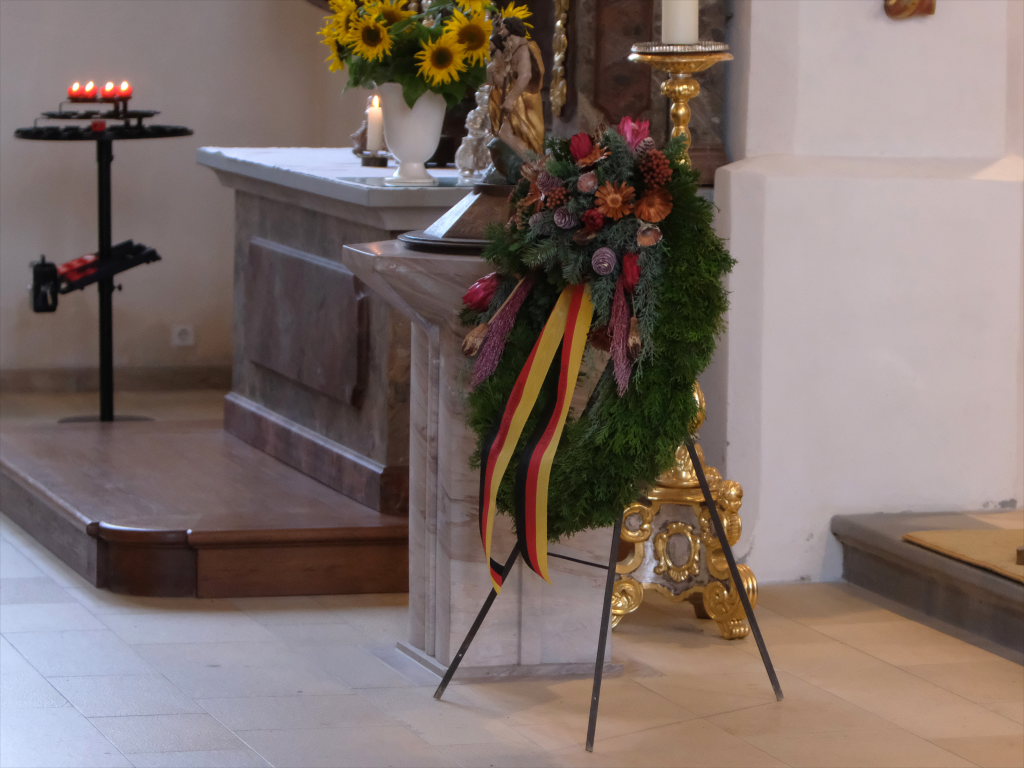 Nachdem die Fahnenabordnungen und die anderen Gottesdienstteilnehmer, allen voran Bürgermeisterin Alexandra Scherer, den Gefallenen der Kriege ihre Ehrerbietung erwiesen hatten, zog die nunmehr weltliche Prozession in die Festhalle hinauf, wo die Musikkapelle zum festlichen Frühschoppen mit einigen überraschenden lukullischen Genüssen aufspielte.