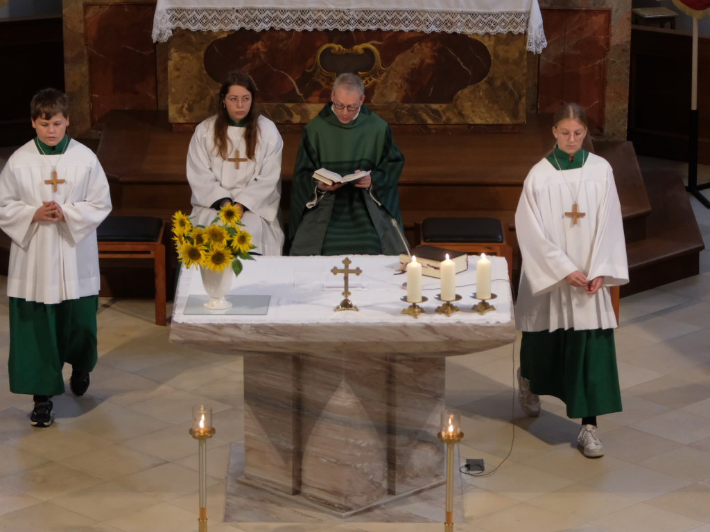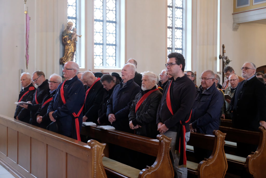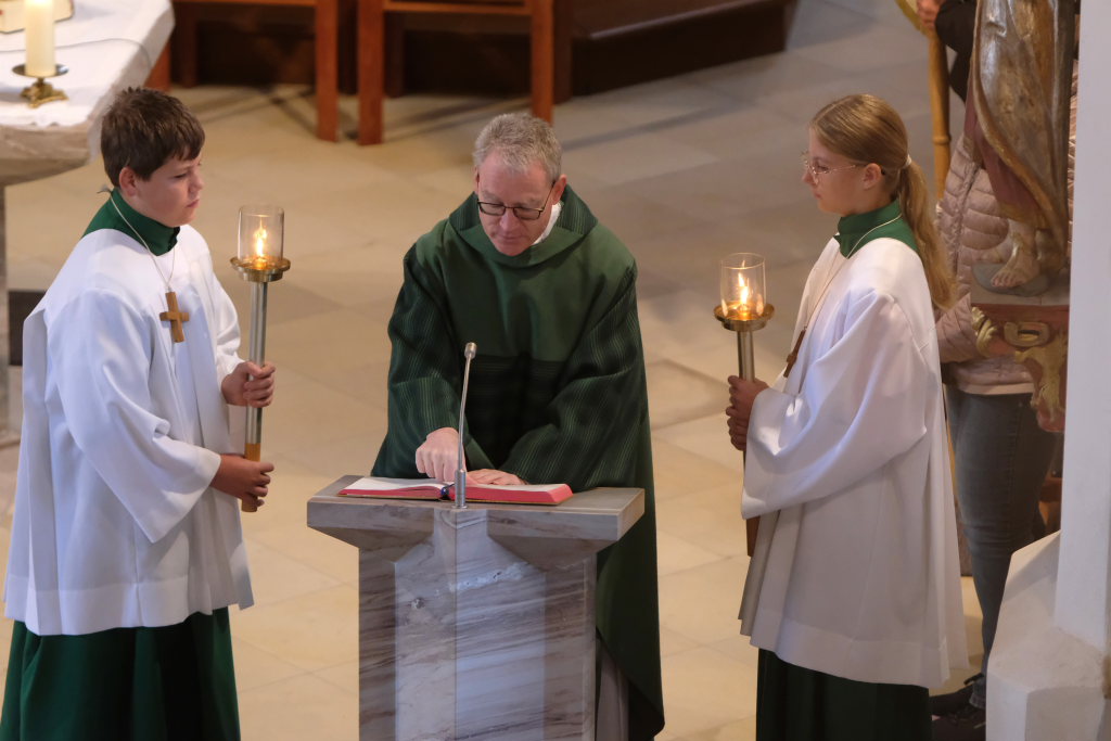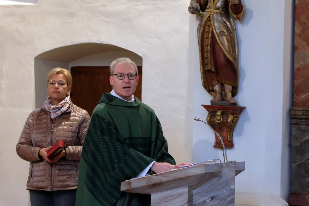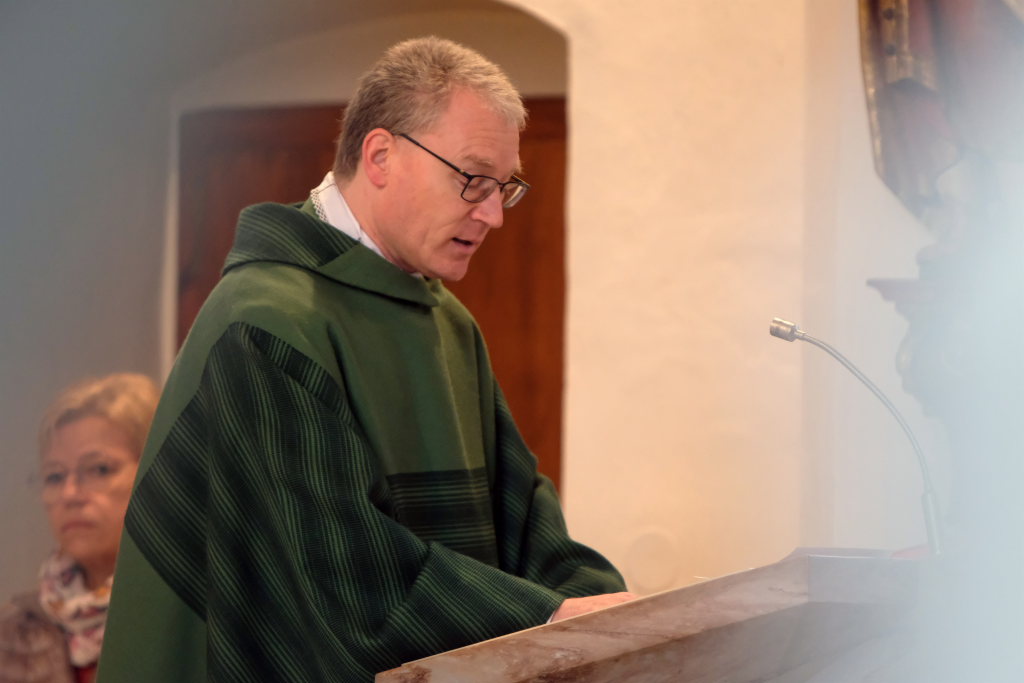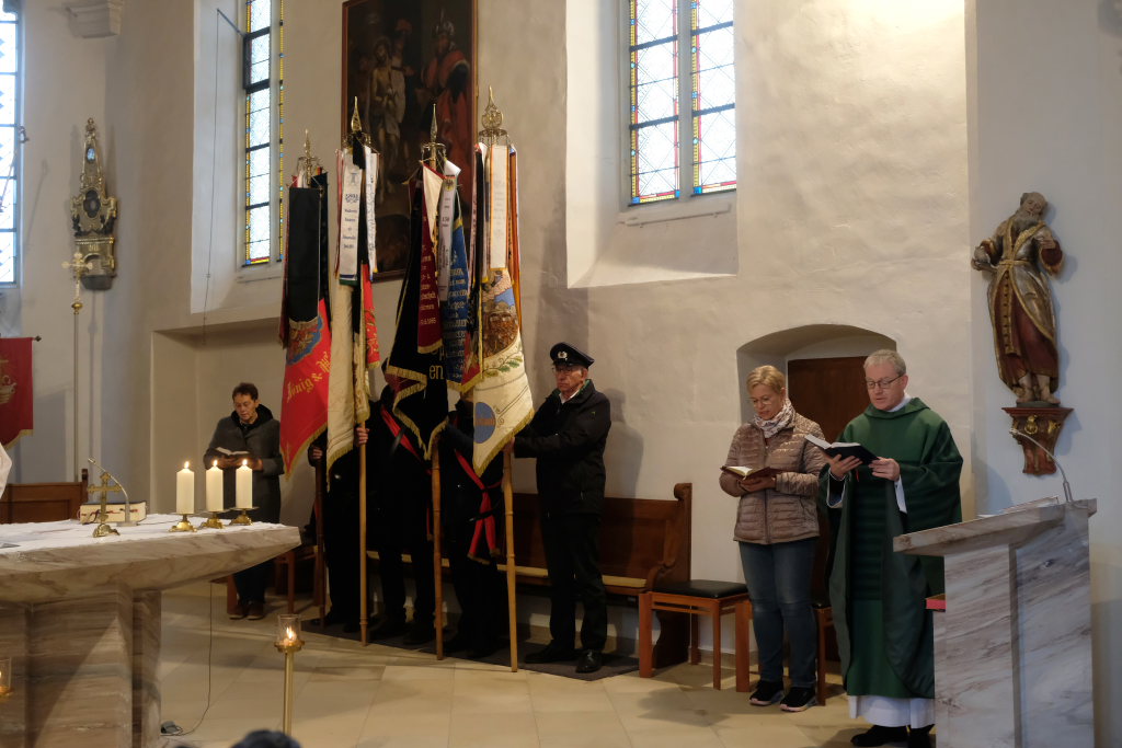 Pfarrer Meschenmoser nahm in seiner Predigt Bezug auf das Evangeliumswort des Markus-Evangeliums, als der Jesus den blinden Bartimäus in Jericho heilt. Dieser sieht trotz aller Widerstände als Einziger, wer Jesus wirklich ist, nämlich der Sohn Gottes. Unbeirrt verfolgt er sein Ziel, mit Jesus zu sprechen und ihn um die Heilung zu bitten. „Was willst du, was kann ich für Dich tun?“, fragt Jesus den Blinden und damit uns Christen. „Er lädt uns ein, auf ihn zuzugehen“, erläutert Pfarrer Meschenmoser in seiner Predigt. „Was hoffst Du bei mir zu finden?“ Als Jesus den Blinden berührt, kann dieser sofort sehen: „Geh! Dein Glaube hat dich geheilt!“ Und Bartimäus folgte Jesus nach.