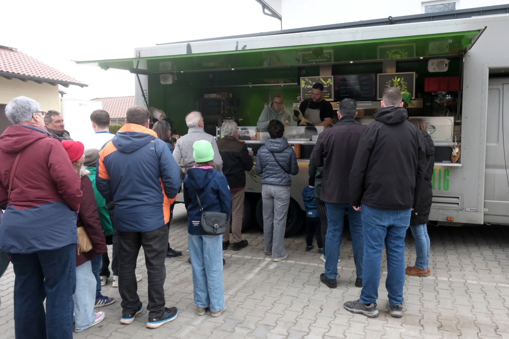 Draußen vor dem Gesundheitszentrum stand am Sonntag die „Flotte Lotte“: Bei diesem Foodtruck, der sich in den letzten Monaten bei verschiedenen Gelegenheiten (z.B. Tag der offenen Tür bei Elektrotechnik Erne) bewährt hatte, gab es neben den bei solchen Festivitäten üblichen Snacks auch Schwäbischen Döner oder die arabische Spezialität Falafel.