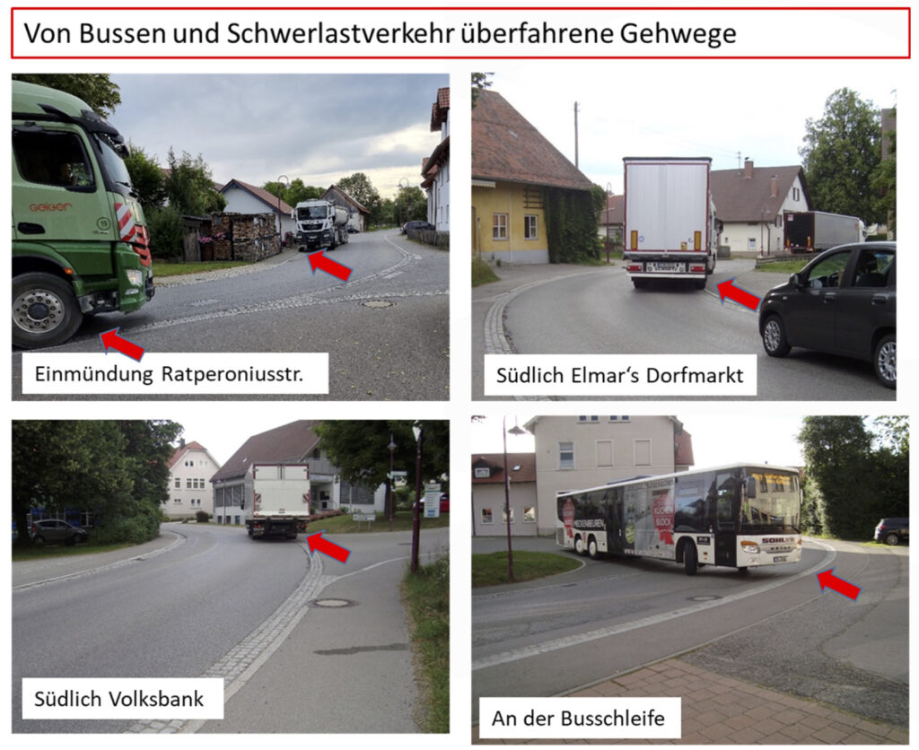 Mit vielen Bildern unterbaute Schuchert seine Defizit-Analyse; so fehlten an etlichen Abschnitten Gehwege. Ein besonderer Gefahrenpunkt sei die Busschleife. Die Busse müssten wegen des schnellen Durchgangsverkehrs – es gilt Tempo 50 – oft lange warten und dann beim Einfahren in die Hauptstraße weit ausschwenken.