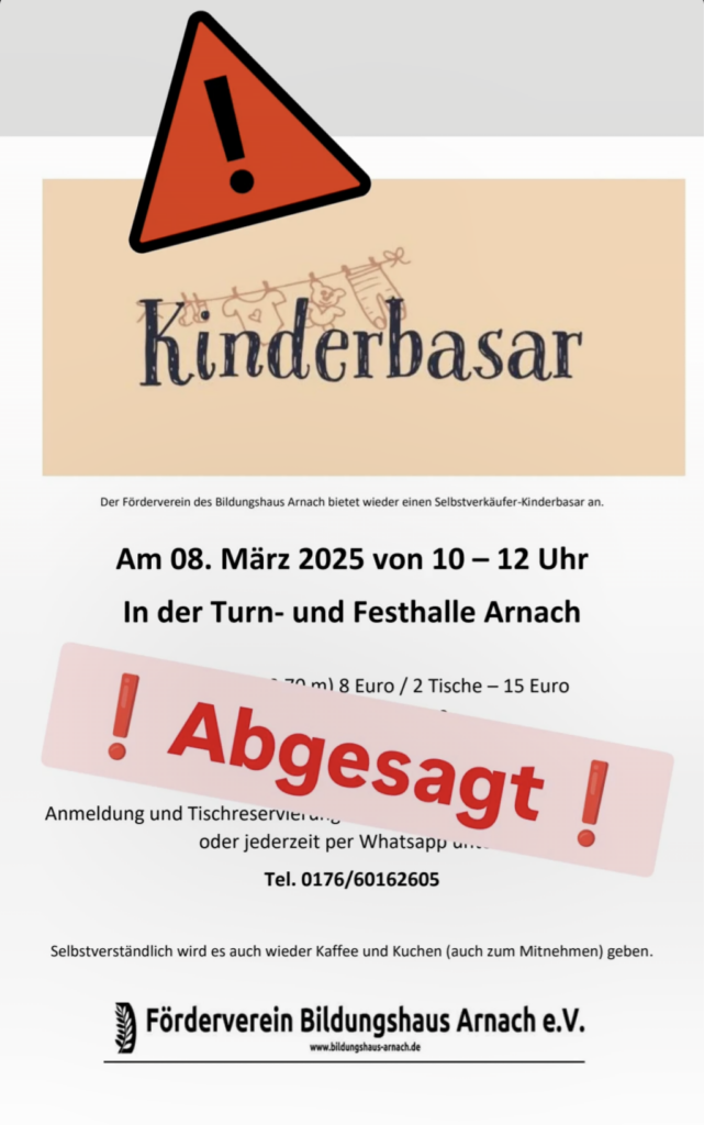 Arnach – Aufgrund mangelnder Anmeldungen wurde der auf den 8. März angesetzte Arnacher Basar leider abgesagt.