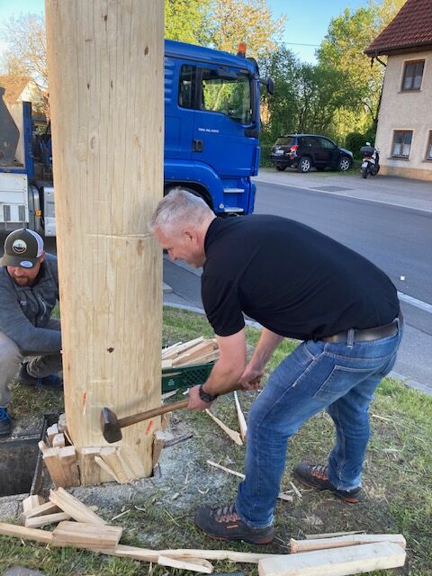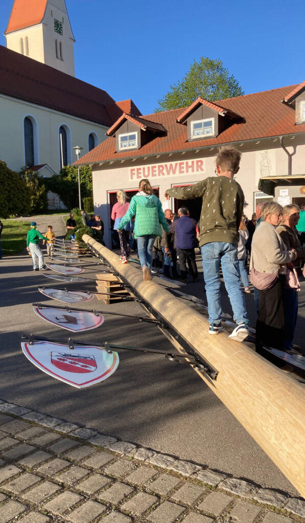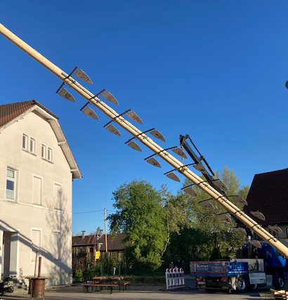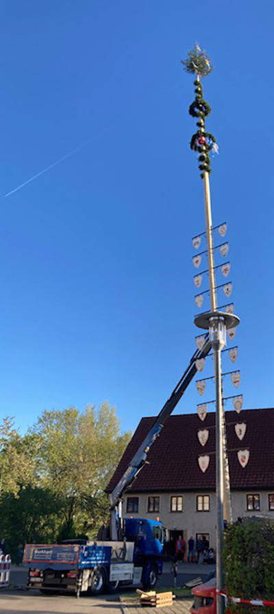 Traditionell stellt die Arnacher Feuerwehr den Maibaum – natürlich vor ihrem Gerätehaus.