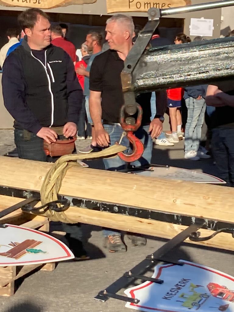 Der Maibaum wird angehängt. Die Schlaufe am Haken muss später jemand am stehenden Baum herunterholen.