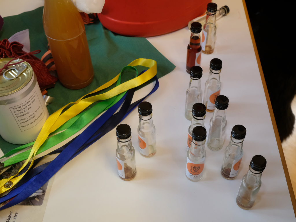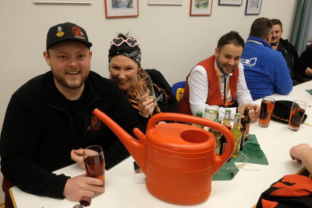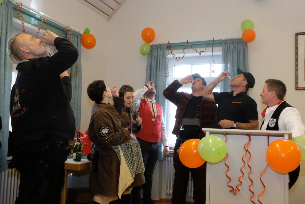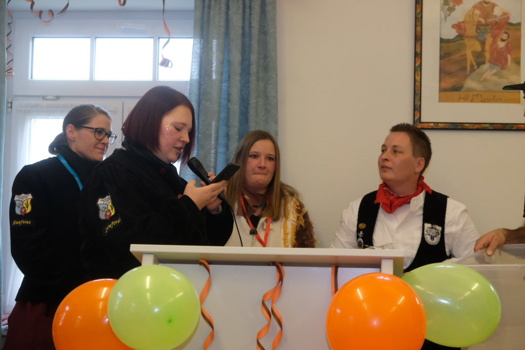 Doch auch sonst war vieles anders: Denn die einzelnen Zünfte wurden nicht nach dem Ablaufplan des Sprunges aufgerufen. Die Zunftmeisterin erklärte die Modalitäten, wie das Ganze ablaufen sollte. In einem großen Pool – einer Plastikbox – „schwammen“ viele kleine gelbe Entlein mit den Narrensprüchen der einzelnen Zünfte. Die ersten drei dieser Lotterie zogen Veser und ihre Vize Bodenmüller selbst – als Belohnung für die „Mühen“ durften diese, nachdem sie die nächsten gezogen hatten, mit diesen dann sich einen „Kurzen“ einverleiben und praktisch den Staffelstab dann an diese weitereichen. Auf diese Weise blieb die Aufmerksamkeit dem Geschehen am Rednerpult erhalten, denn keiner wusste somit, wann er dran war.