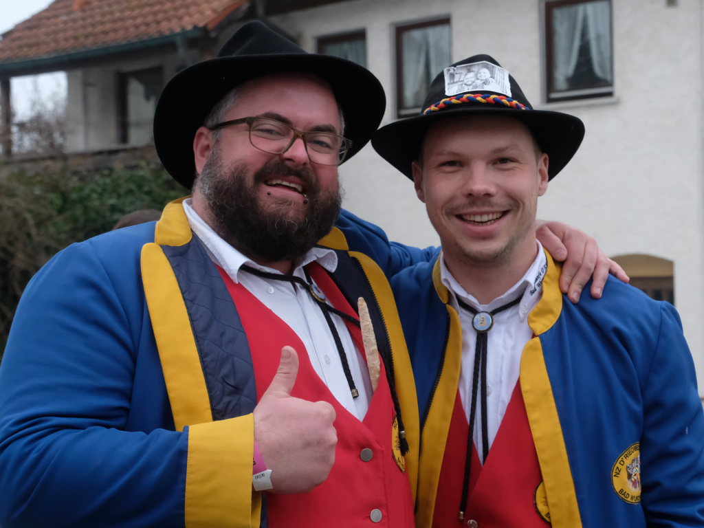 Arnachs Zunftmeister Andreas Kowalewski und Markus Wiest, der Zunftmeister der Narrenzunft Burg Hohenegg (Grünenbach), begrüßten als Umzugssprecher beim Kirchberg die Zünfte mit ihrem Fasnetsrufen und mussten, weil sie sich mitten auf der Straße postiert hatten, so manche „Konfetti-Dusche“ über sich ergehen lassen.