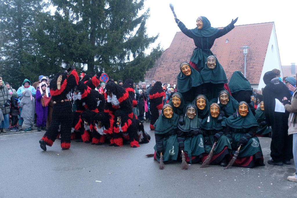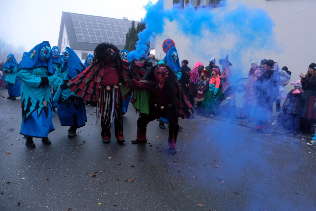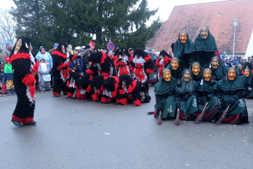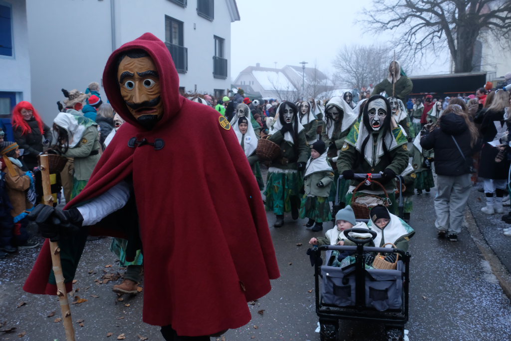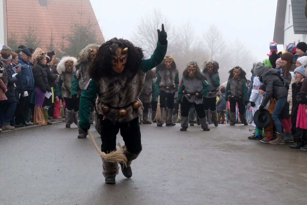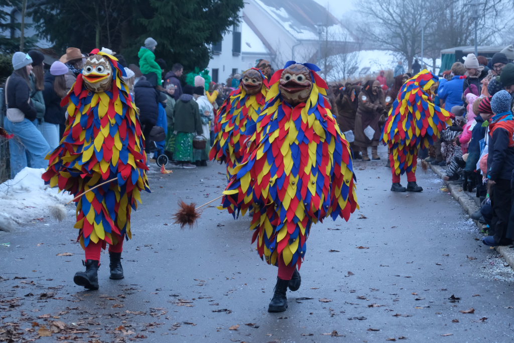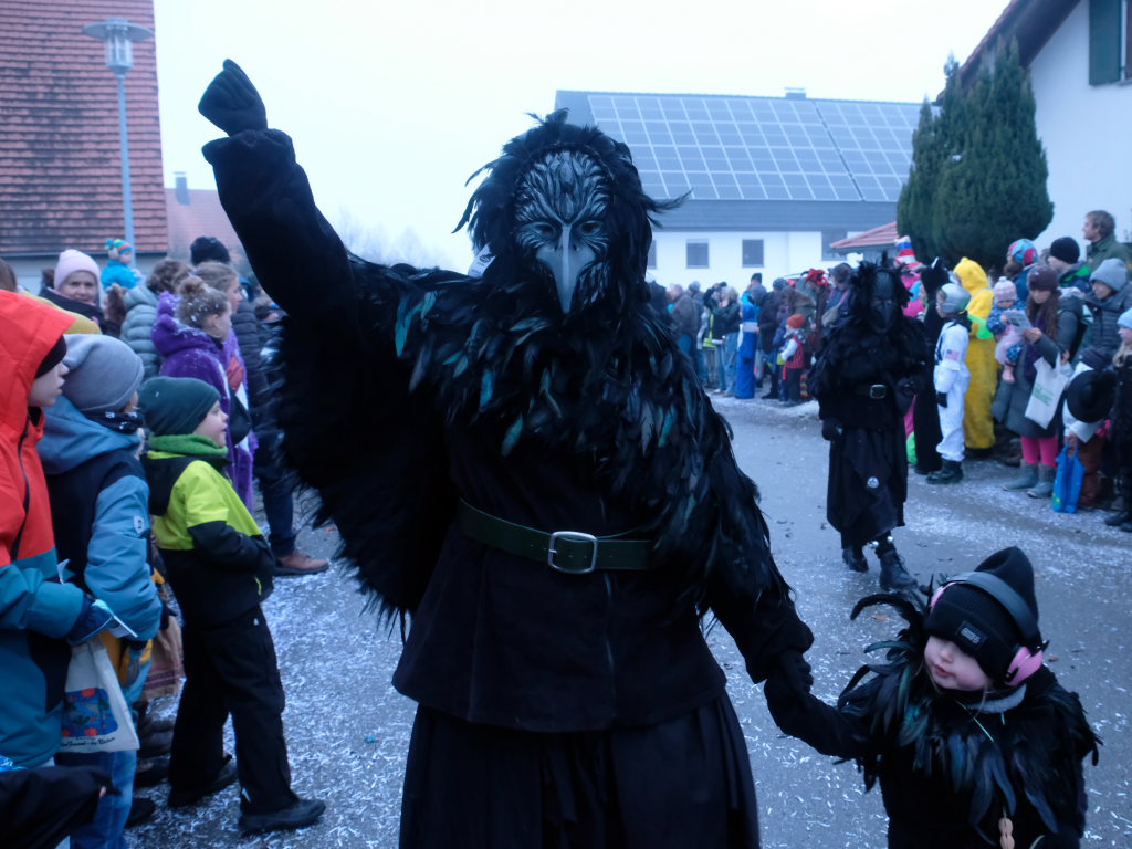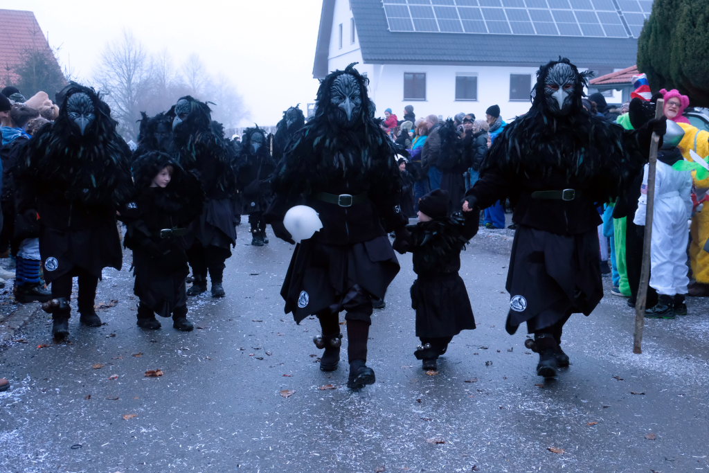 Dazu bereicherten viele Zünfte aus der Region wie Immenried, Alttann, Wolfegg, Waltershofen oder Aichstetten das närrische Geschehen auf den Straßen von Arnach. Erstmals in dieser Saison auf den Umzügen zu sehen sind die „Krähen“ aus Diepoldshofen mit ihrem Narrenspruch „D´Kräh isch munter – Tanzlaub goht unter“.