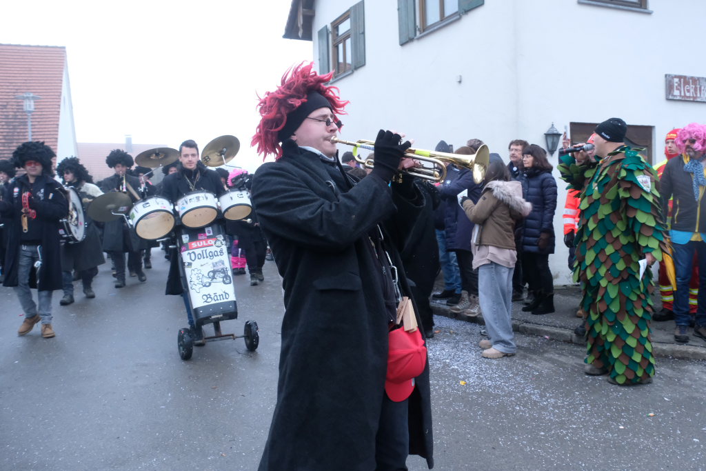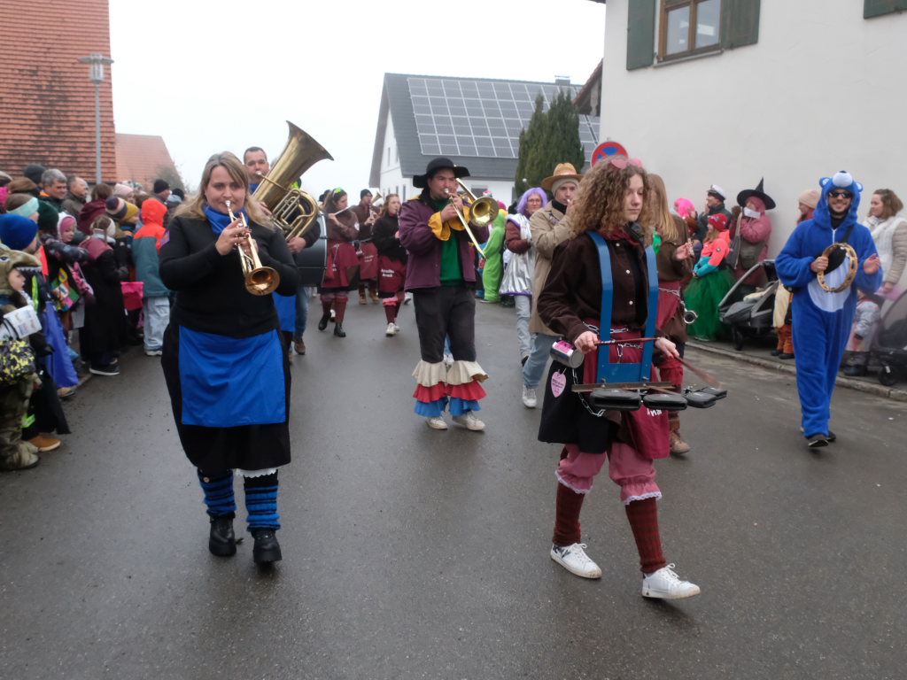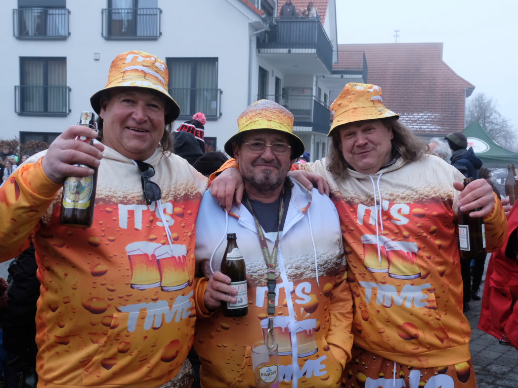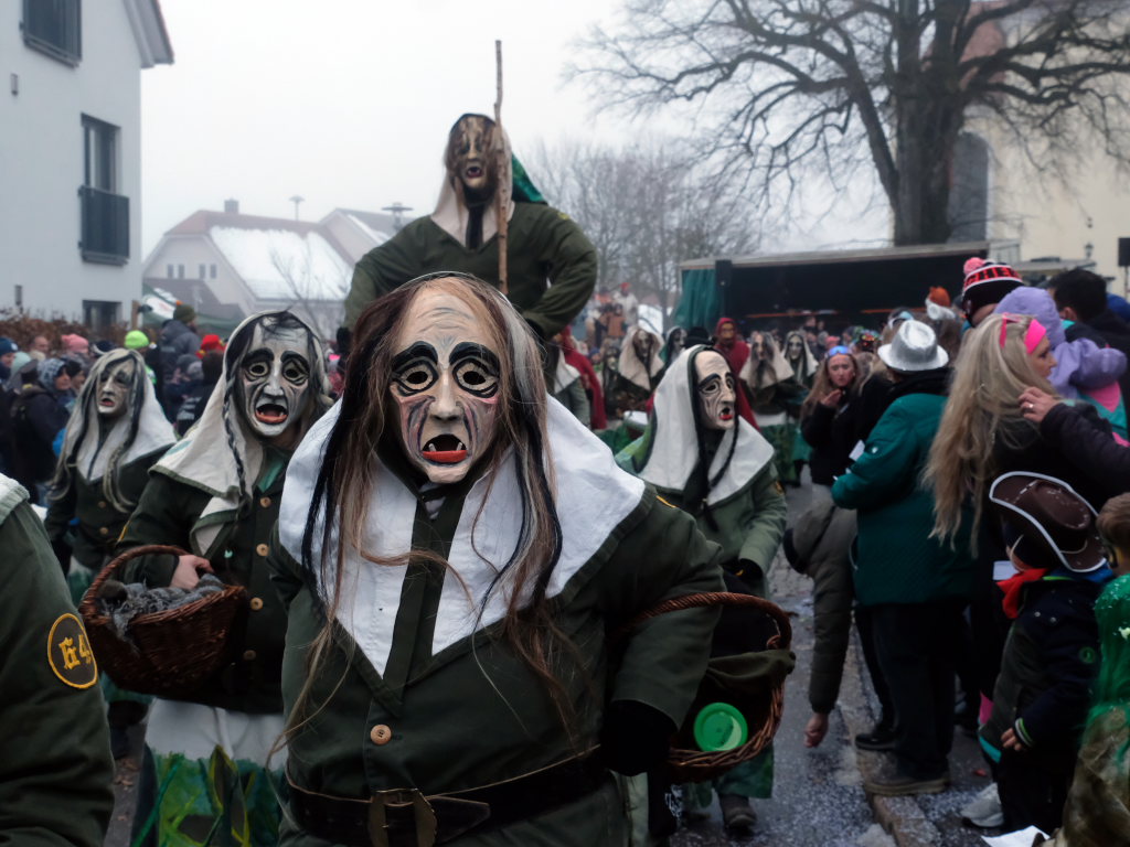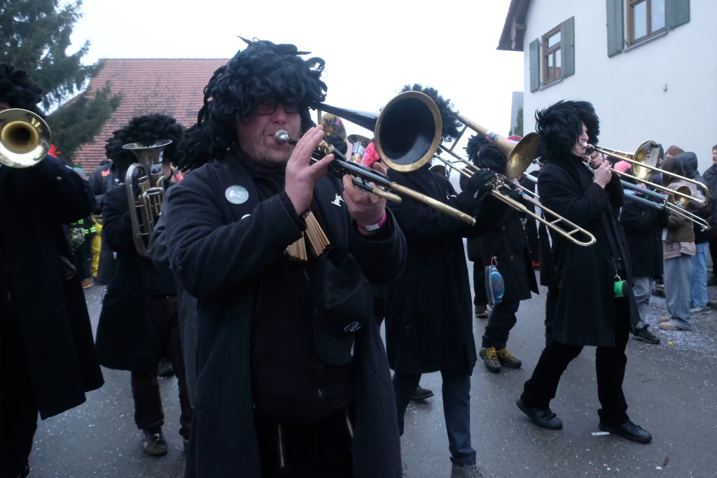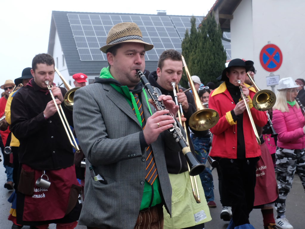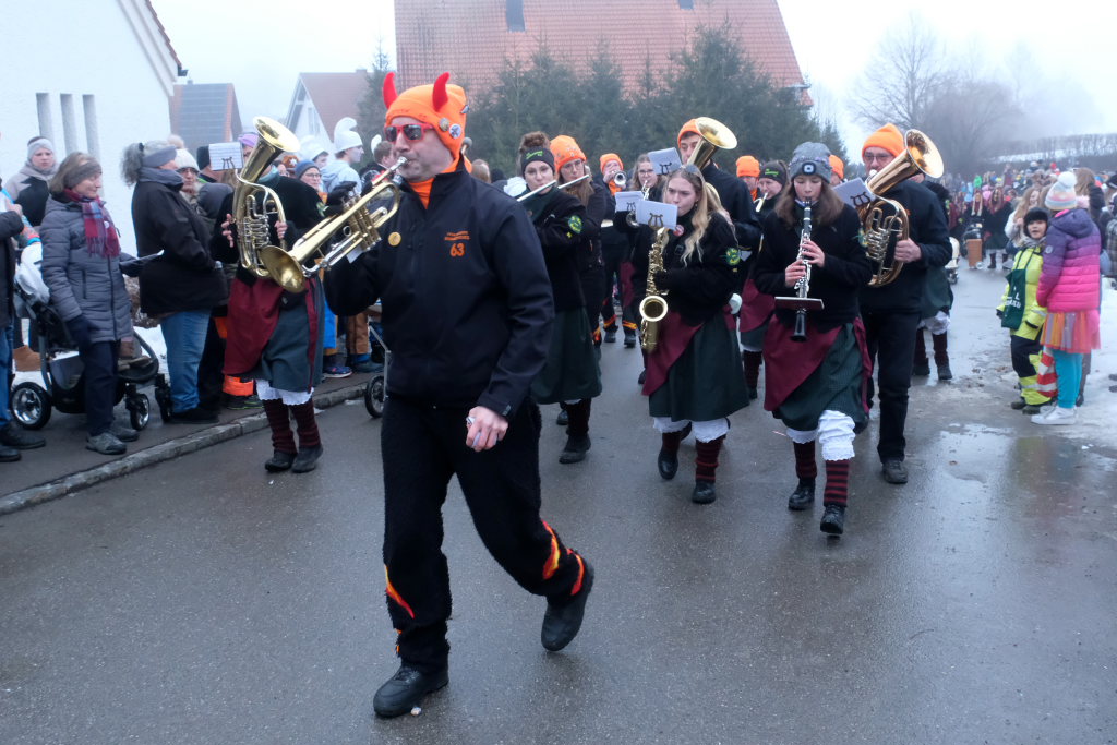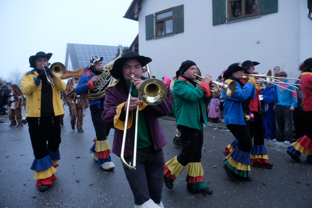 Neun der 36 Umzugspositionen – Zünfte wie die Riedmeckeler aus Wurzach oder die Eintürner Deifelsböck, die ihre drei Kilometer lange Anreise beinahe zu Fuß hätten zurücklegen können, waren aus der Großgemeinde Bad Wurzach gekommen. Immerhin acht Musikgruppen wie der Fanfarenzug Bad Wurzach, die Seibranzer Vollgas-Bänd und die Schalmeien „D´Riedpatzen– oder die Guggenmusik Röthenbach sorgten mit ihren Stimmungsliedern für ausgelassene Partylaune, Für letztgenannte war es ebenfalls ein Heimspiel, spielten darin doch viele Musiker des Musikvereiness Arnach mit. Es waren aber auch Zünfte mit längerer Anreise dabei, wie etwa die Burghexen aus Hornstein oder die traditionsreiche NZ Lachende Kuh aus Isny, die sich dann im Partyzelt ordentlich etwas auf die Ohren gaben.