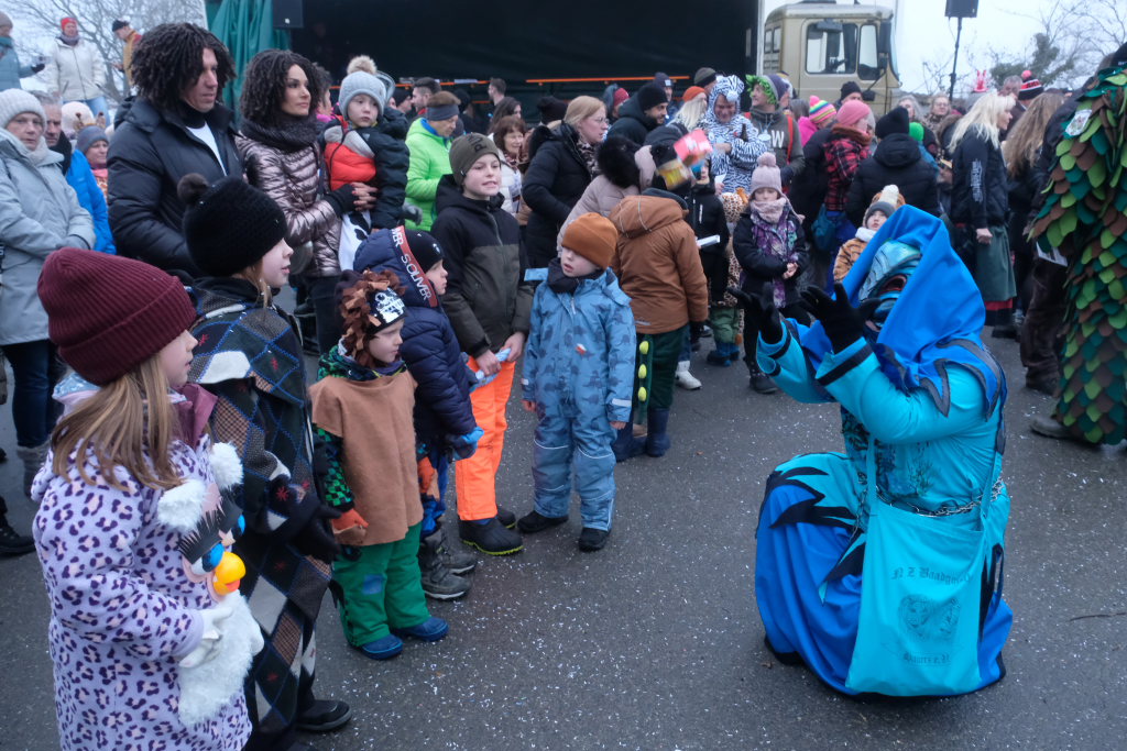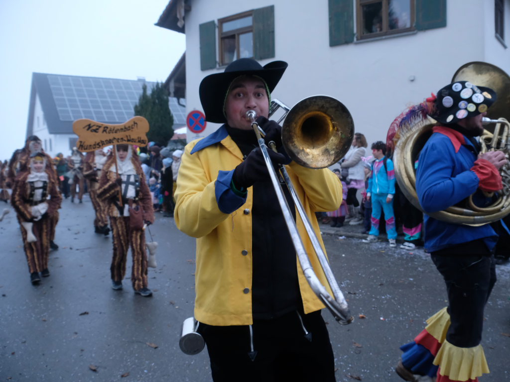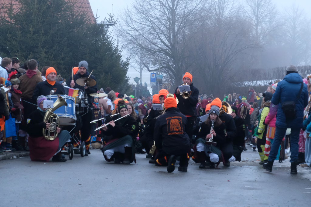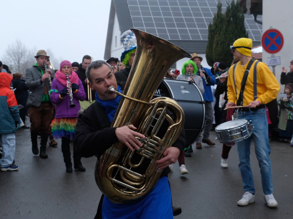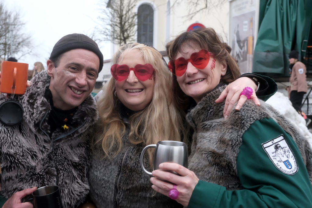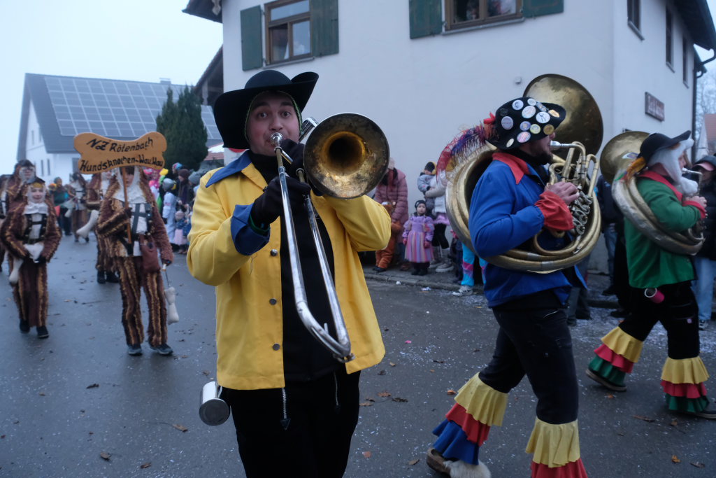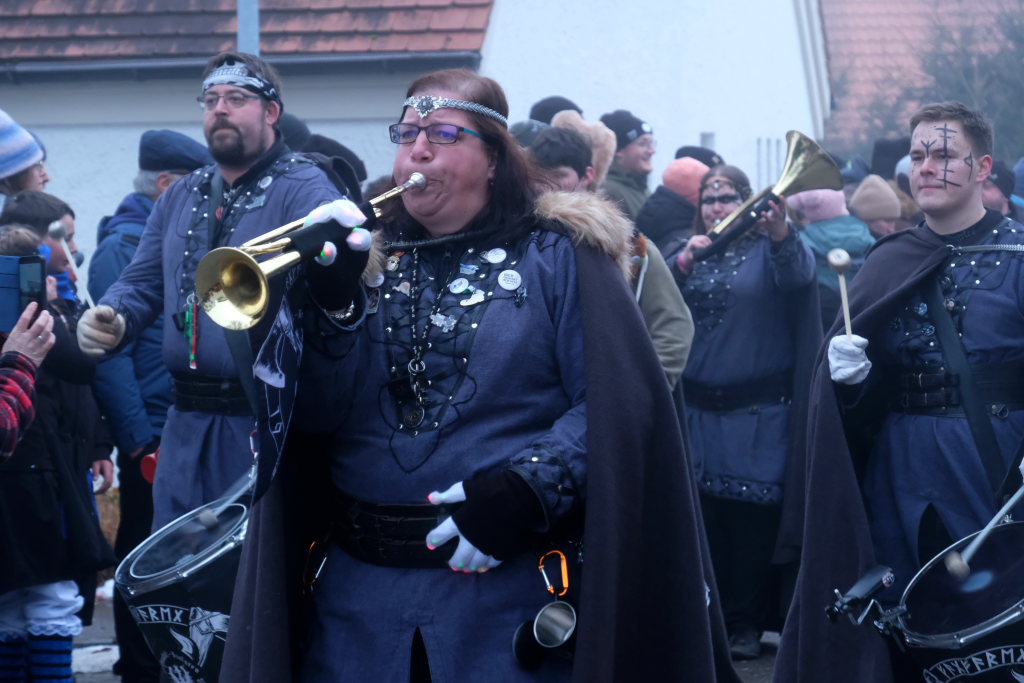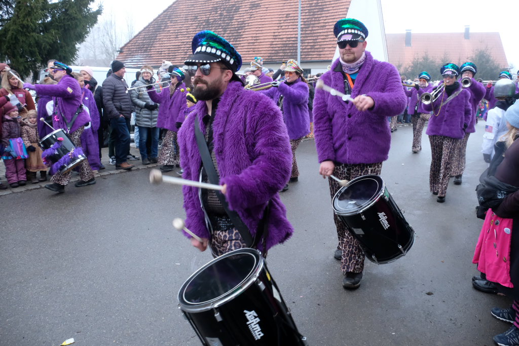 Neun der 36 Umzugspositionen – Zünfte wie die Riedmeckeler aus Wurzach oder die Eintürner Deifelsböck, die ihre drei Kilometer lange Anreise beinahe zu Fuß hätten zurücklegen können, waren aus der Großgemeinde Bad Wurzach gekommen. Immerhin acht Musikgruppen wie der Fanfarenzug Bad Wurzach, die Seibranzer Vollgas-Bänd und die Schalmeien „D´Riedpatzen– oder die Guggenmusik Röthenbach sorgten mit ihren Stimmungsliedern für ausgelassene Partylaune, Für letztgenannte war es ebenfalls ein Heimspiel, spielten darin doch viele Musiker des Musikvereiness Arnach mit. Es waren aber auch Zünfte mit längerer Anreise dabei, wie etwa die Burghexen aus Hornstein oder die traditionsreiche NZ Lachende Kuh aus Isny, die sich dann im Partyzelt ordentlich etwas auf die Ohren gaben.
