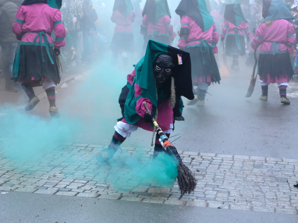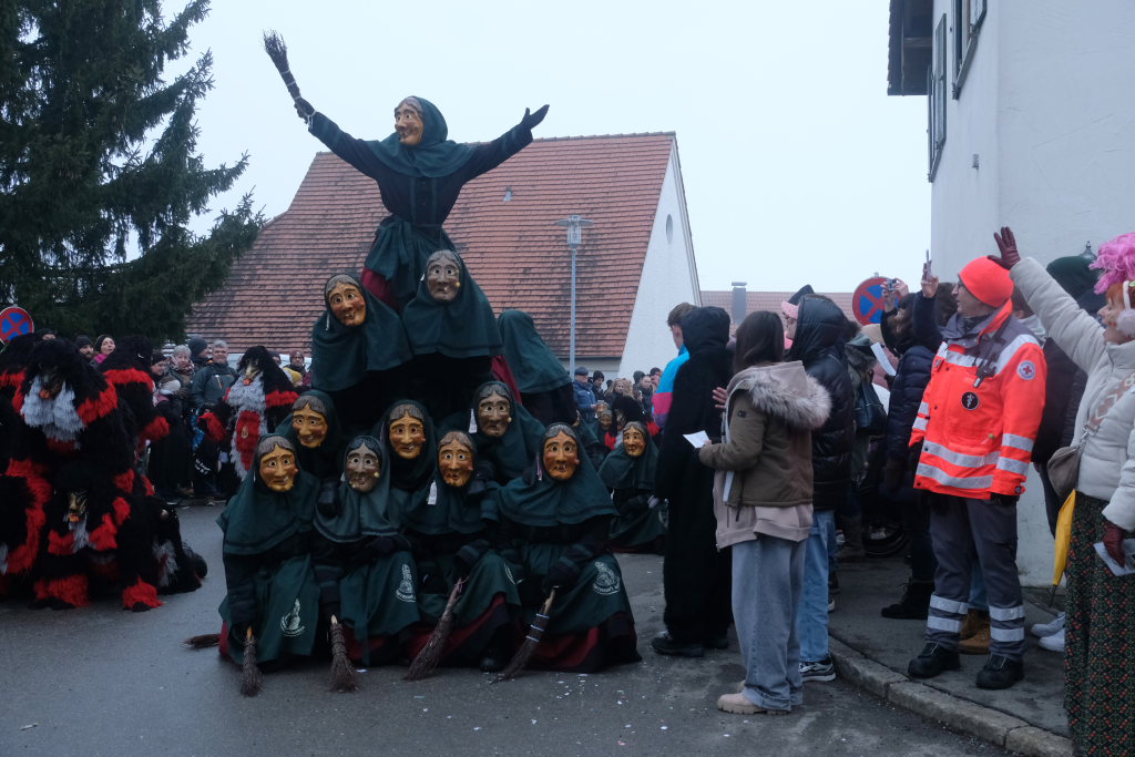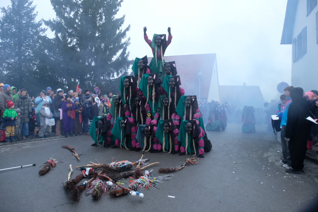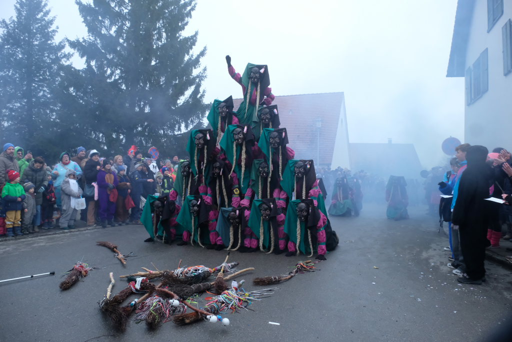 Paradiesisch dürften sich die Hästräger und Musikanten der 36 Gruppen gefühlt haben, auf ihrem Weg den Kirchberg hinauf in Richtung Festhalle: In Dreier-, ja Viererreihen drängten sich am gesamten Umzugsweg bestens gelaunte „Mäschkerle“, die fleißig die Narrenrufe wie das „Bock – Wulle“ der heimischen Zunft, „Worum – Dorum“, „Deifels-Bock“ oder „Dugget Eich D´Langjupp schleicht“ skandierten. Die Gruppen dankten ihnen mit dem Bau beeindruckender Hexen- und Narrenpyramiden. So etwa die Kresenzhexen aus Wolfegg, die ihre akrobatischen Fähigkeiten unter Beweis stellten und noch gemäß ihrem Narrenspruch „Hexaholz – raucha soll´s“ den Kirchberg in dichten Nebel tauchte, so wie später die Hauerzer Baadgoischdr diesen in ihrer Hausfarbe in Blau einhüllten.