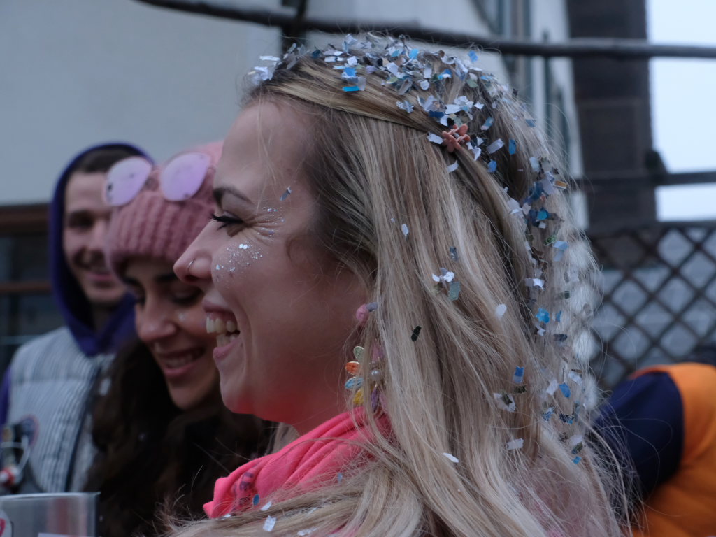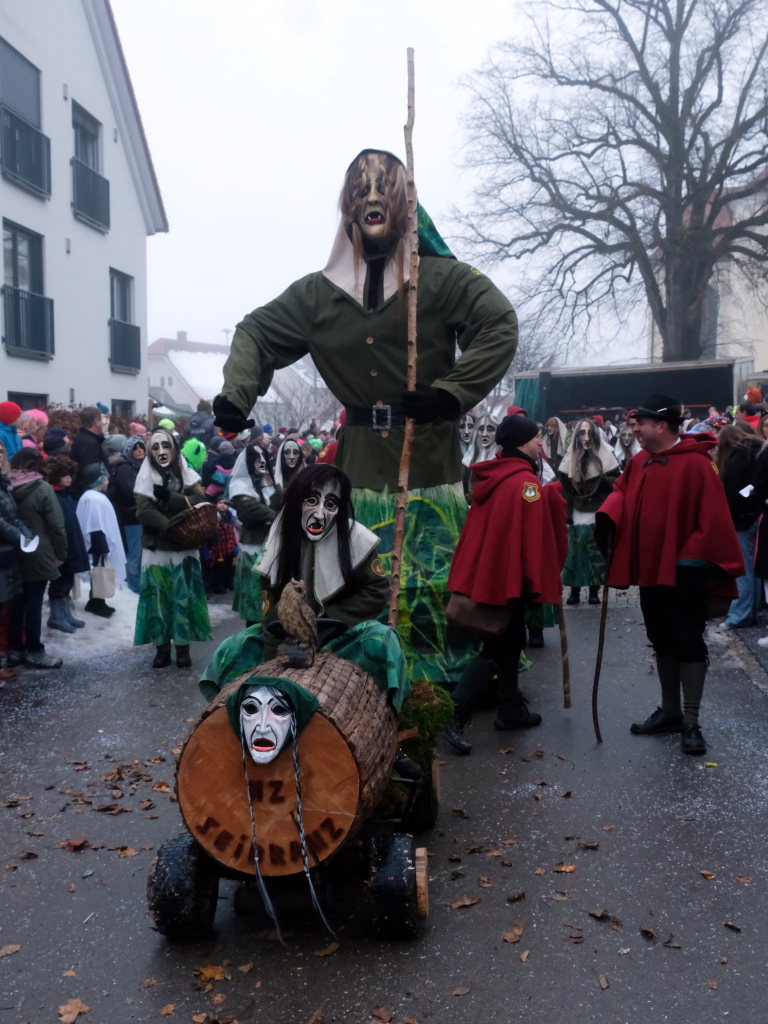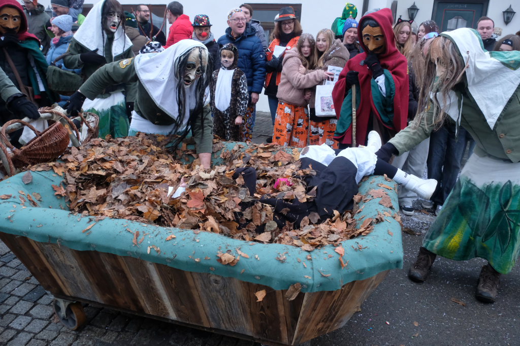 Die Seibranzer Zunft, die bei Umzügen immer ihre übergroße, namensgebende Langjupp-Figur mitführt, hatte, neben der vor kurzem eingeführten Figur des Wandersmannes, noch eine Neuerung dabei: Einen fahrbaren Gretta, gefüllt mit wunderbar feuchten Herbstblättern aus den kühlen Seibranzer Wäldern, in dem sie so manches hübsches Mädchen versenkten…