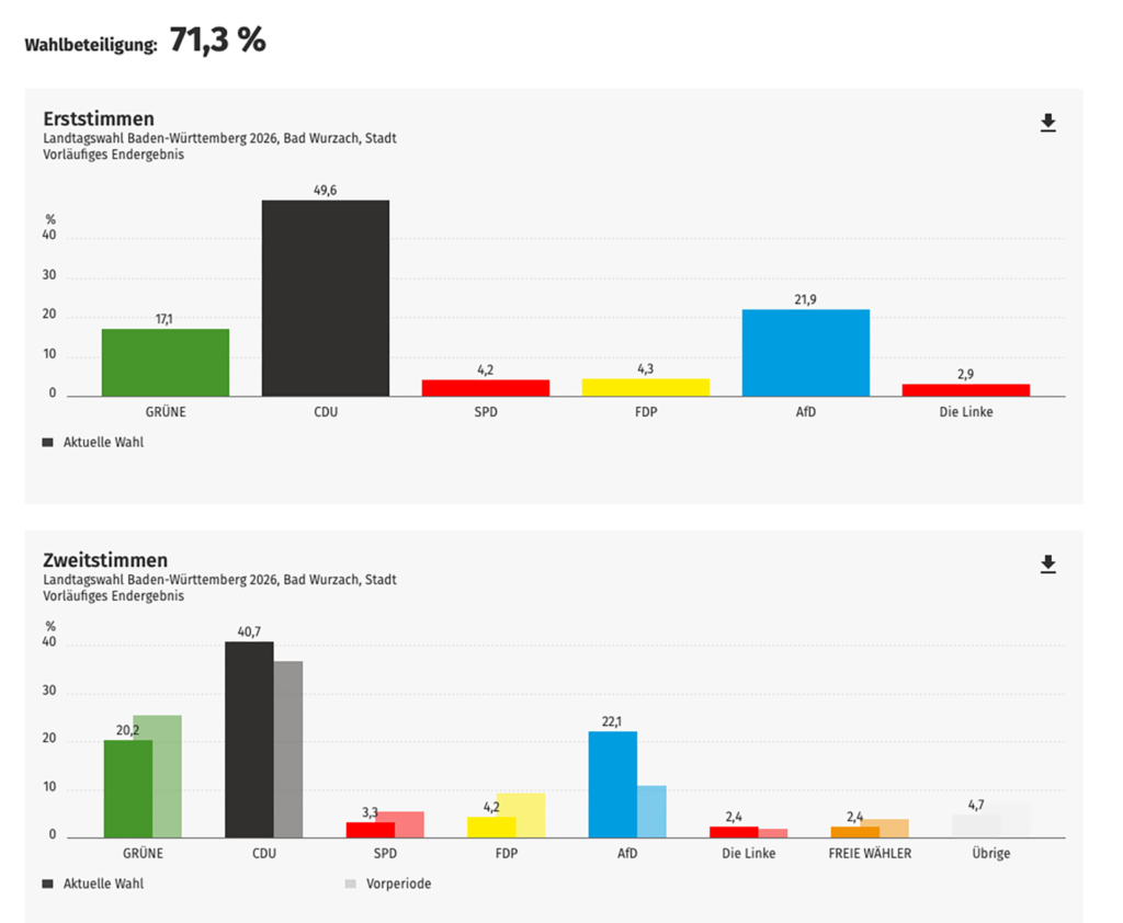 Hier das Ergebnis der Landtagswahl in Bad Wurzach (Zweitstimmen = Parteienwahl; in Klammern der Unterschied zu 2021):
