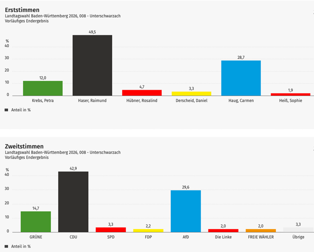 Das Bad Wurzacher Landtagswahlergebnis (Gesamtstadt). Die CDU ist bei den Zweitstimmen doppelt so stark wie die Grünen. Bei den Erststimmen (Personenwahl) kam Raimund Haser nah an die 50-Prozent-Marke heran. Grafik entnommen der Webseite der Stadt Bad Wurzach.