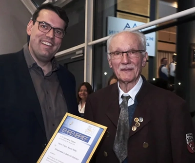 Klaus Wachter vom Blasmusikkreisverband überreichte Xare Miller 2024 die Ehrennadel in Gold mit Diamant. Foto: Uli Gresser