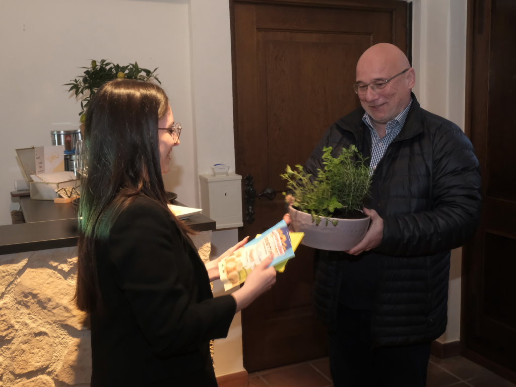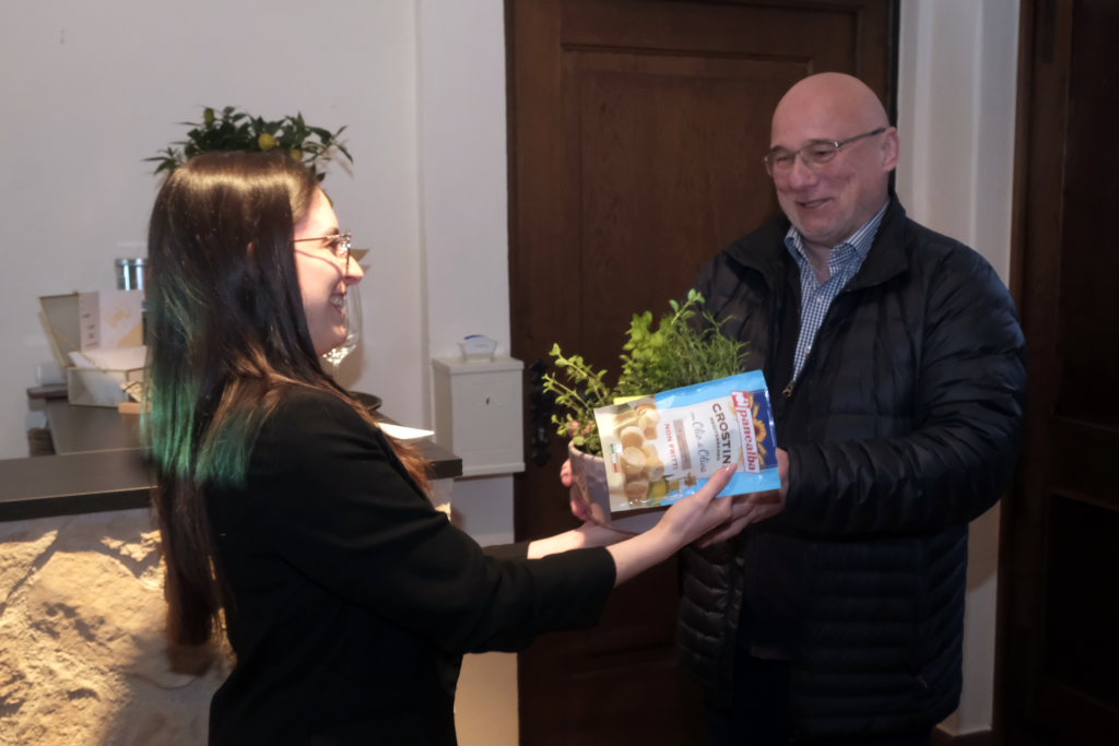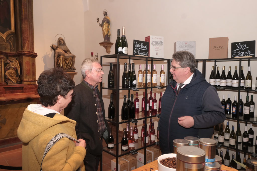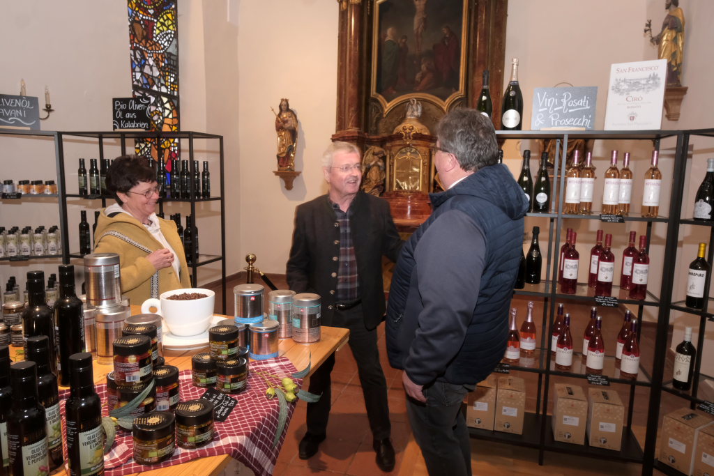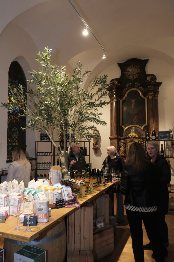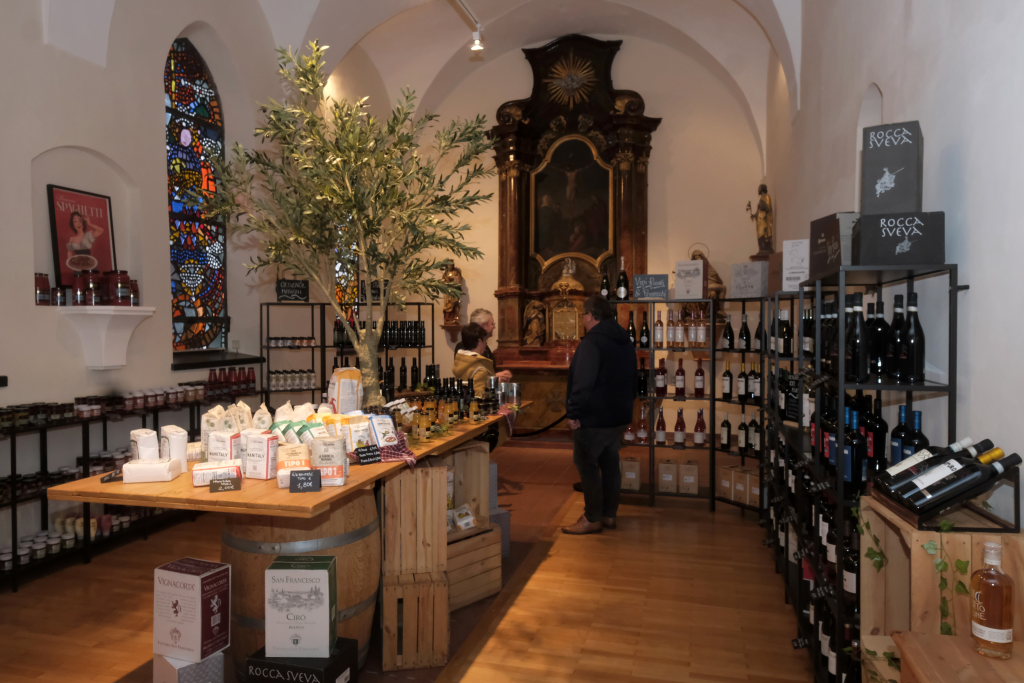 Es war ein weiter Weg, bis Mariano Nicastro und seine Partnerin Valeria Greco ihren Traum von einem Feinkostladen in der Spitalkapelle verwirklichen konnten. Ziemlich genau ein Jahr nach der Profanierung lässt sich sagen: Das Werk soll seinen Meister loben. Es ist ein gelungenes Werk, wie alle Gäste am vergangenen Freitag (20.3.) einhellig lobten. Denn der Charakter des Raumes blieb, soweit es ging, unverändert, dafür sorgte das Denkmalamt, was im Gegenzug in diesem einen Jahr viel Zeit und Arbeit für Berthold Leupolz bedeutete. Der Leiter der Abteilung Liegenschaften bei der Stadtverwaltung hatte die Herkulesaufgabe, die Vorstellungen von Mavani mit denen des Denkmalamtes in Einklang zu bringen. Der Altarraum blieb praktisch komplett erhalten, die bisher im Raum verteilten Heiligen-Figuren rückten wie die Pieta näher an den Altar heran oder wurden – hoch über den Köpfen der Kunden – auf einen Sockel gestellt. Es ist auch lobend zu erwähnen, dass der Altarraum mittels Kordel abgeschrankt ist.