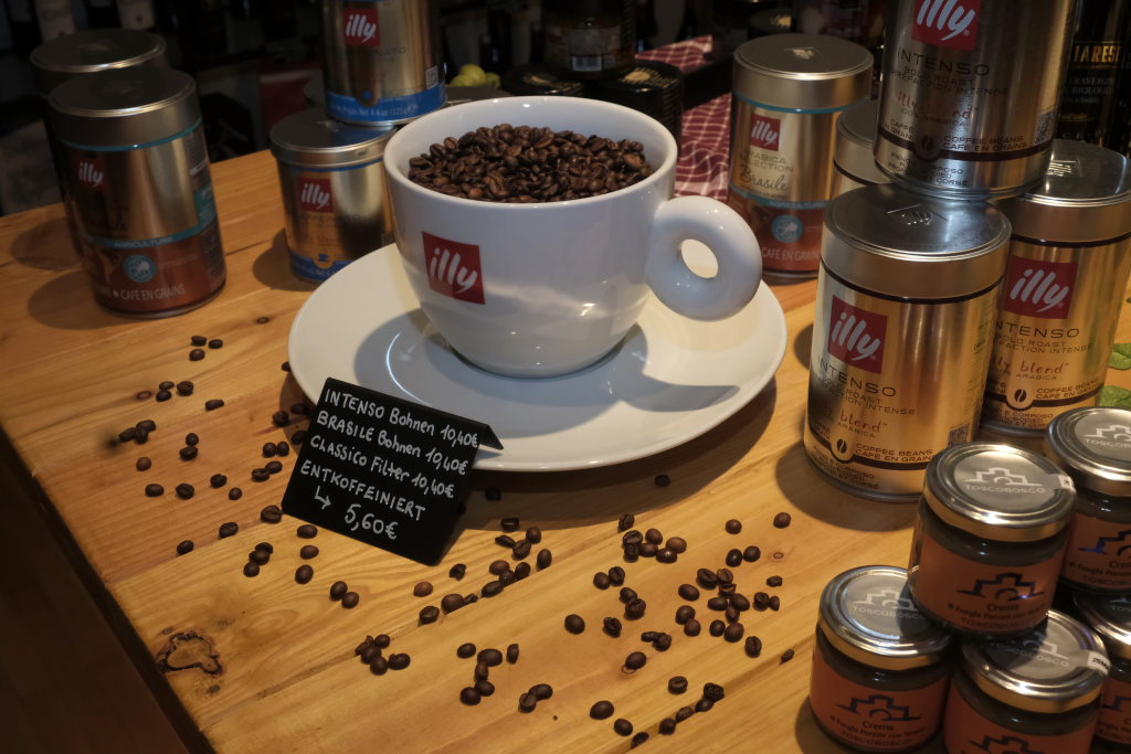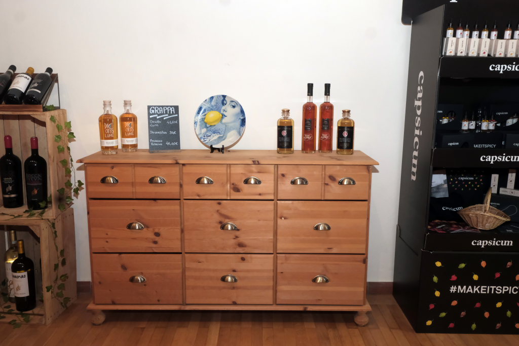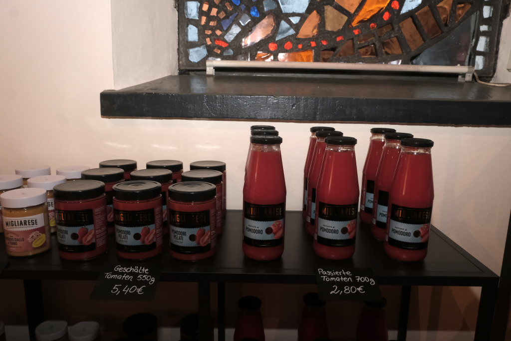 Die umlaufenden Regale, in denen die beiden Gastronomen die Produkte anbieten, die sie in der Osteria selbst verarbeiten, stehen frei und offen im Raum und sind praktisch transparent. Vor dem Altar gibt ein Freiraum den Blick auf diesen frei. Eine nach eigenen Ideen gestaltete Regalkonstruktion beherrscht die Mitte des Raumes, aus der heraus ein kleiner Olivenbaum als Symbol des „dolce vita“ herauswächst. Die Wände des Raumes mussten gemäß den Vorgaben des Denkmalamtes frei bleiben. Einzige bauliche Veränderung: Unweit des Eingangsbereichs entstand ein kleiner gemauerter Kassenbereich. Und eine direkte Verbindungstür zwischen Osteria und Feinkostladen.
