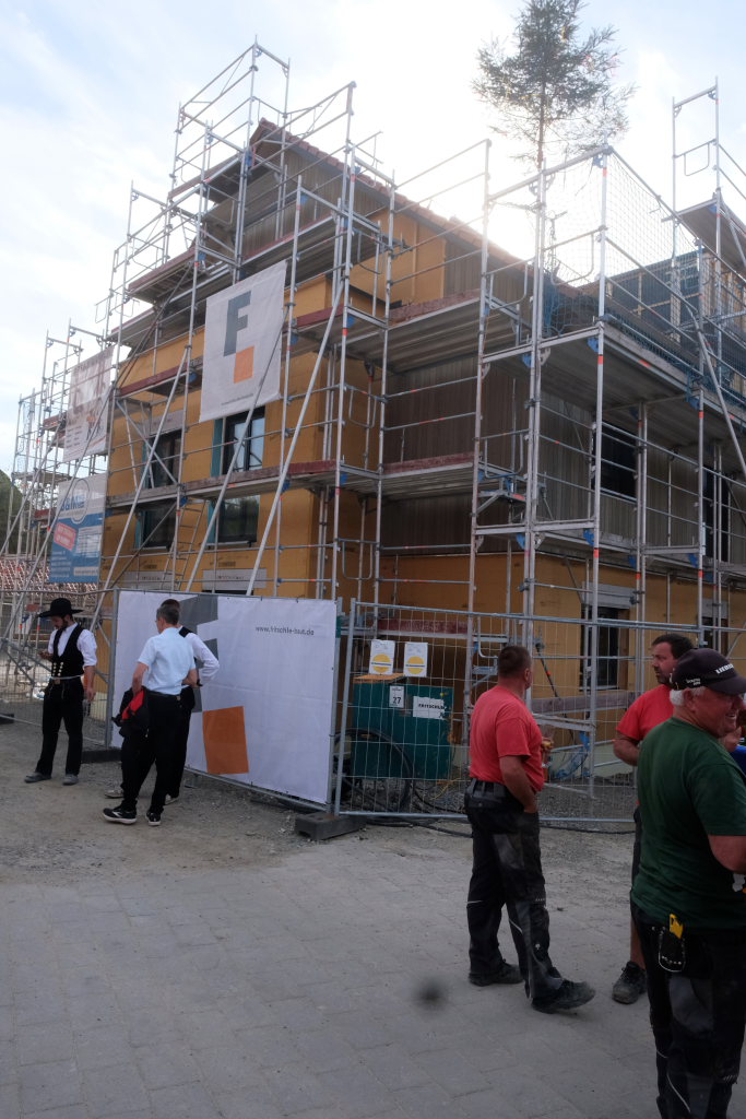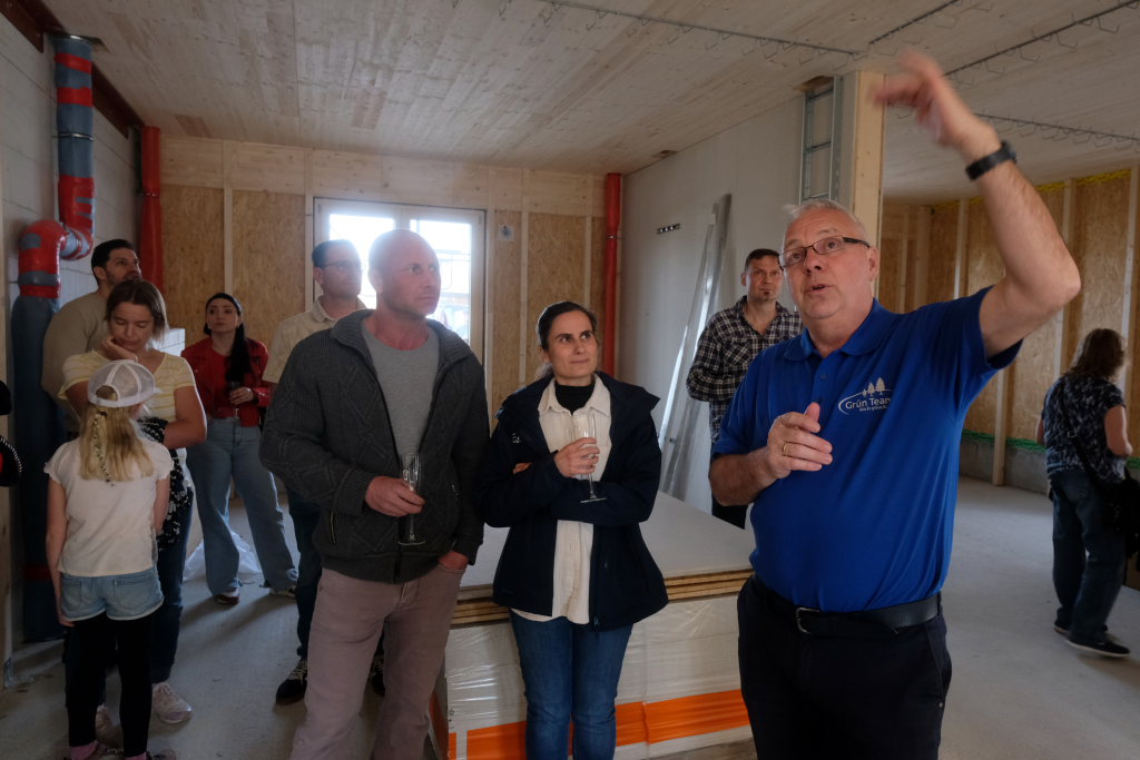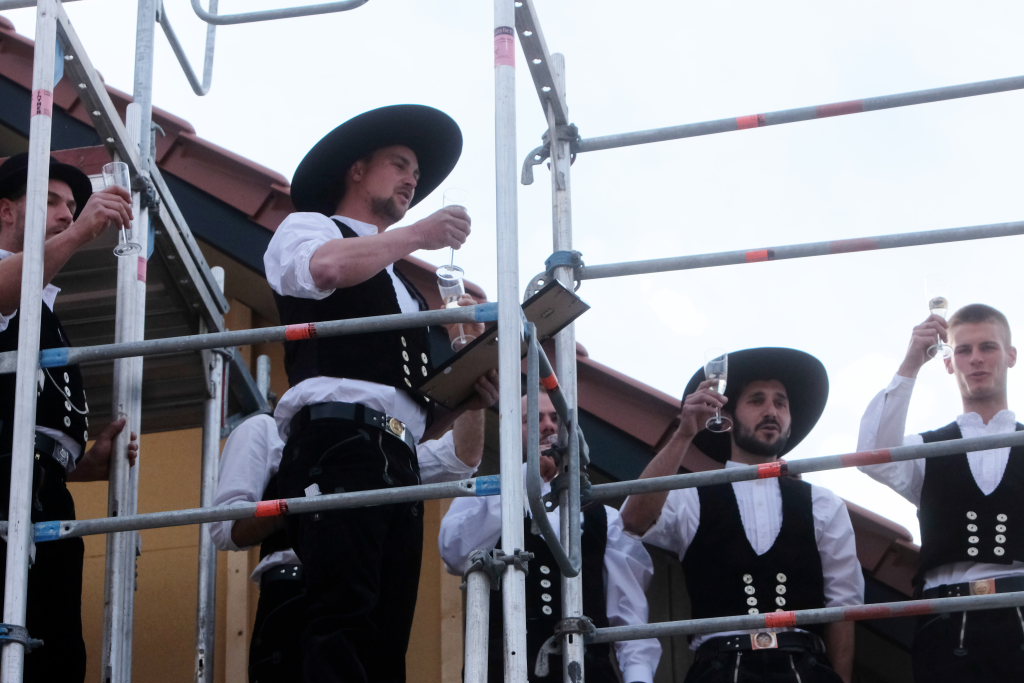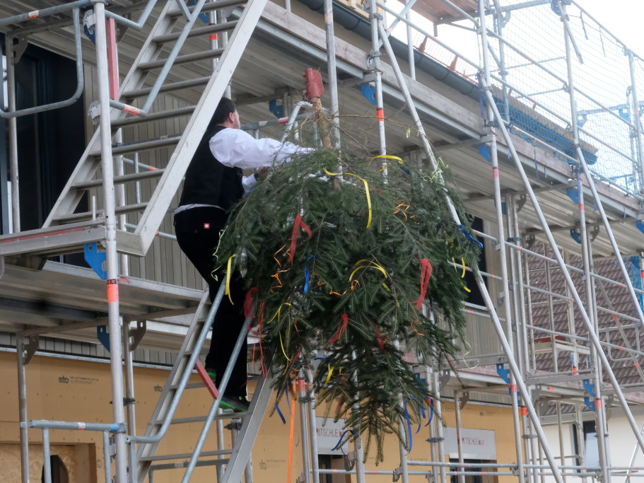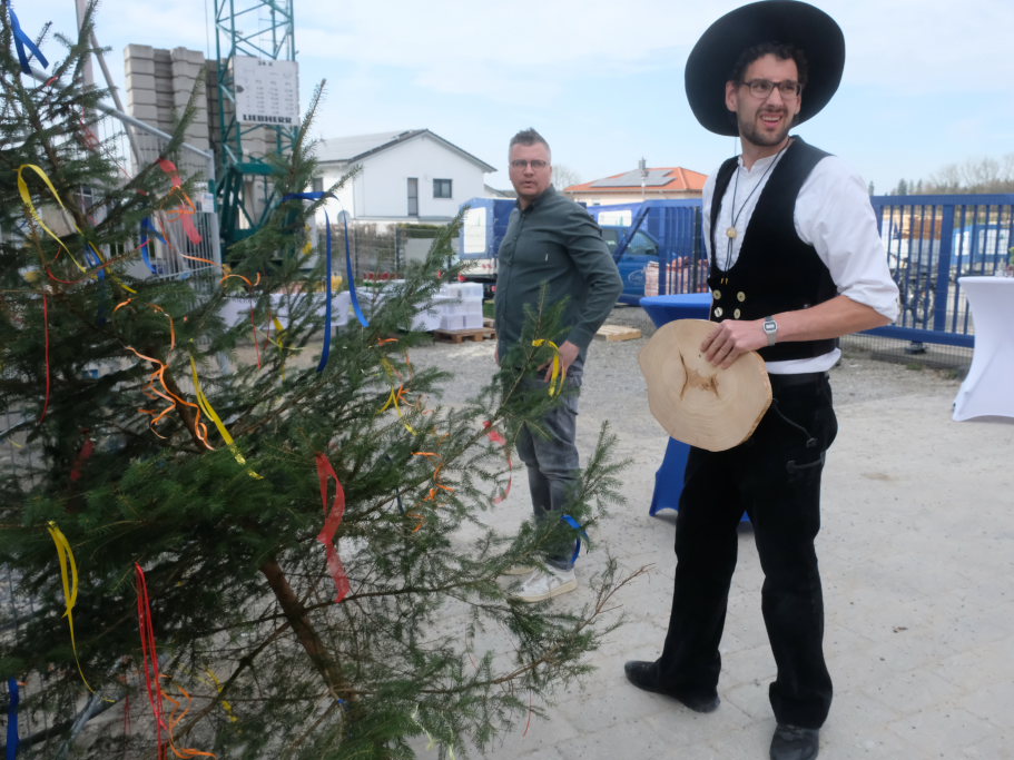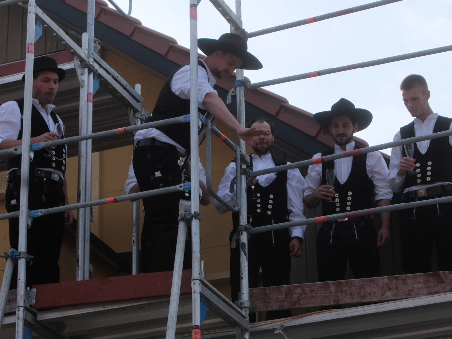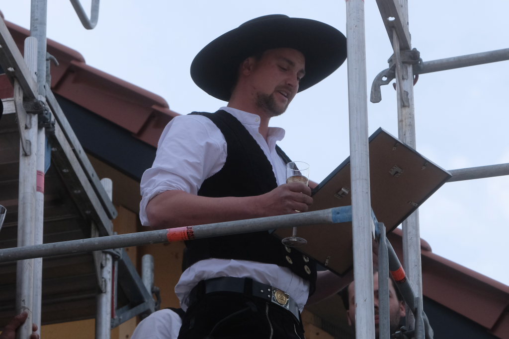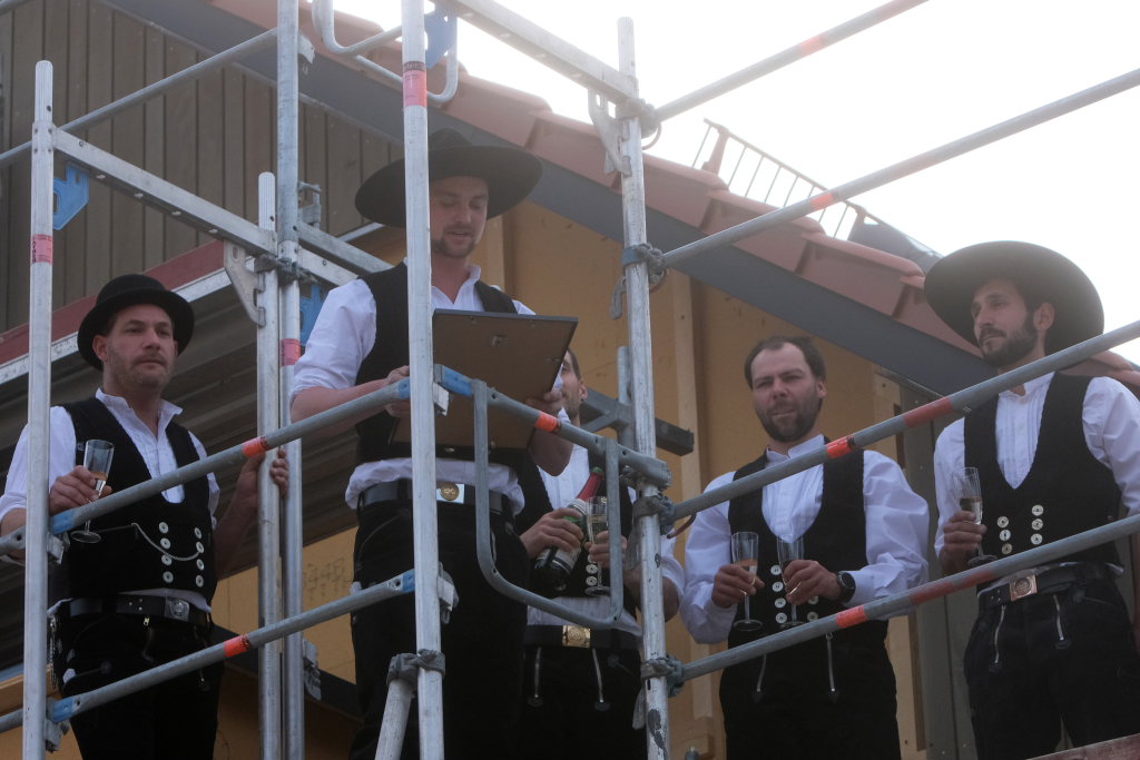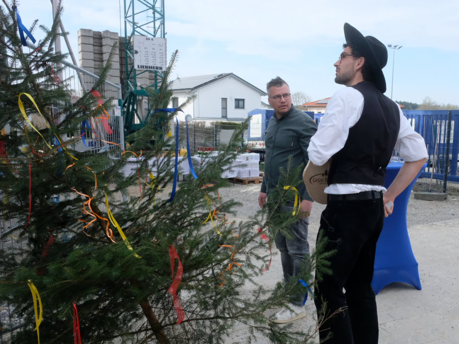 Nachdem Zimmermann Felix Branz von der ausführenden Zimmerei Merk nach dem Setzen des Richtfestbäumchens am Giebel des Neubaues den entsprechenden Richtfestspruch verlesen und die Zimmerleute ihre leeren Sektgläser den Worten in die Tiefe folgen ließen, luden Bleichner und sein Grün-Team, Nachbarn, Gäste und Mitarbeiter zu Hausführungen , aber auch zu einem Richtschmaus und gekühlten Getränken ein.