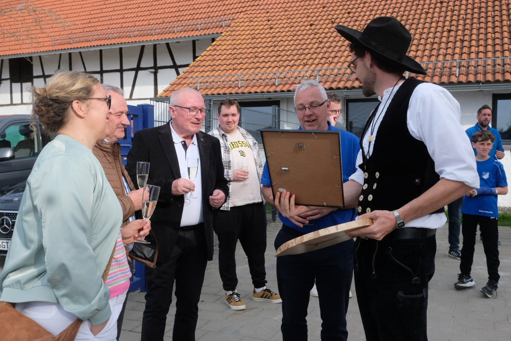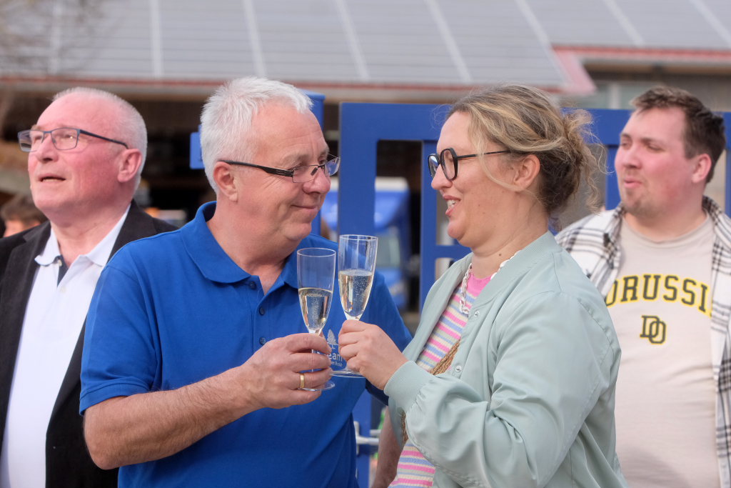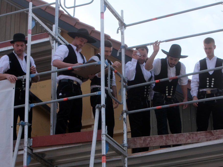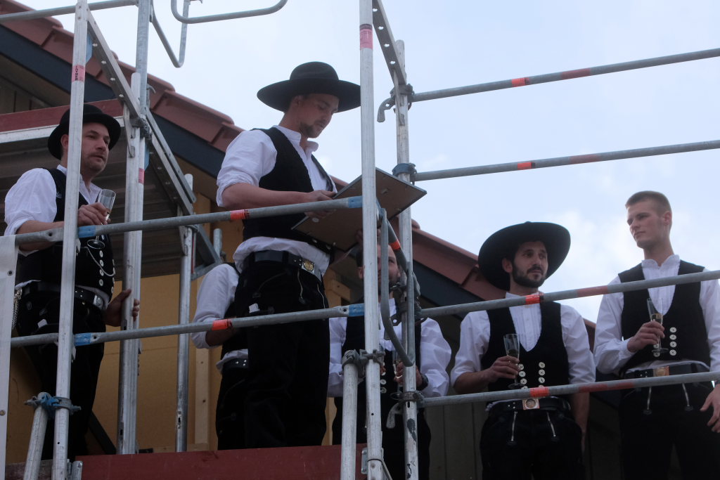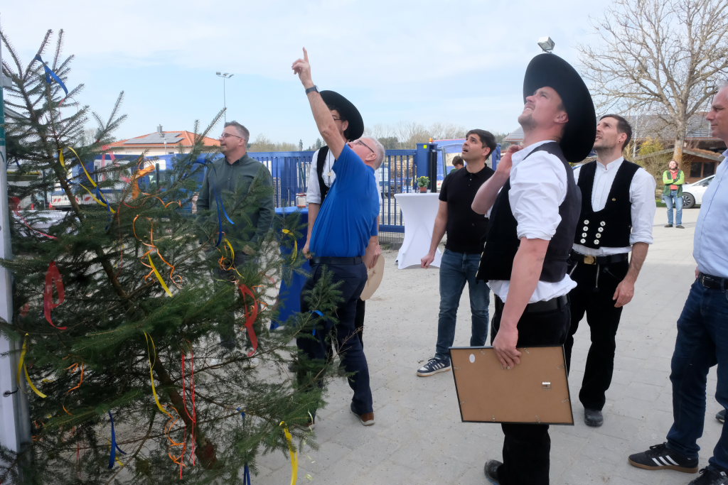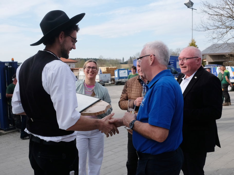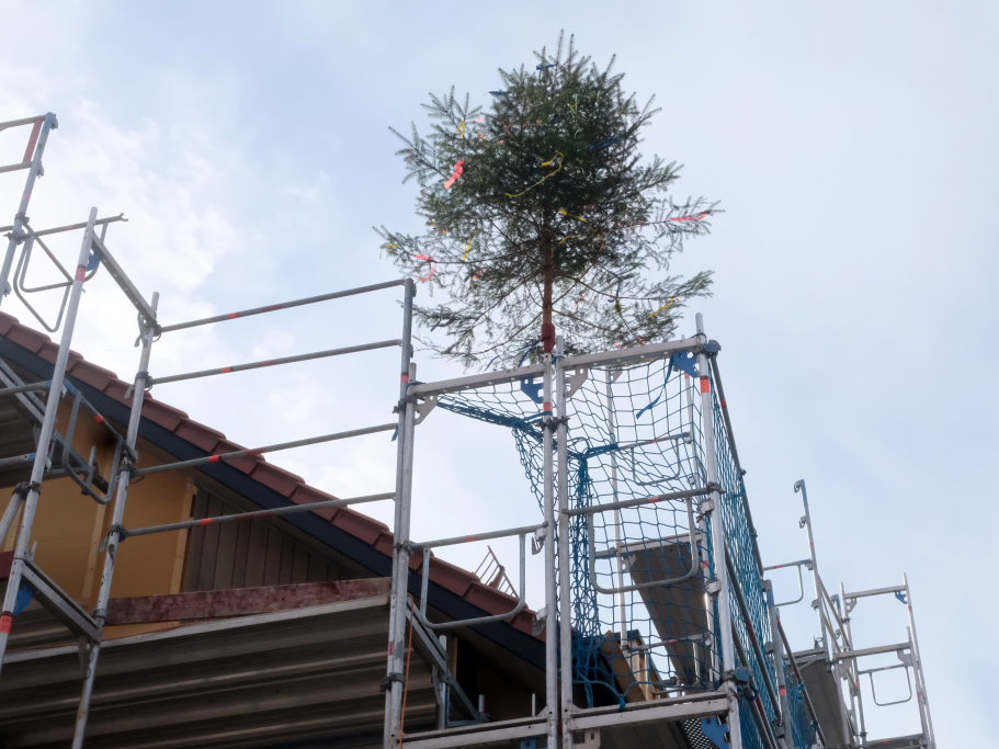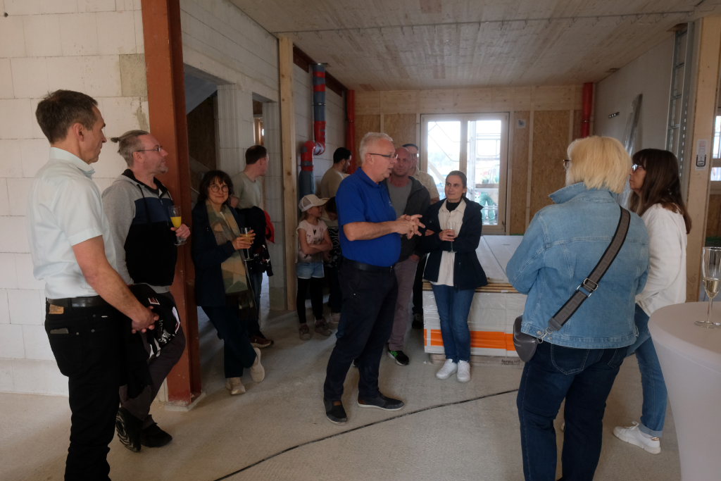 Nachdem Zimmermann Felix Branz von der ausführenden Zimmerei Merk nach dem Setzen des Richtfestbäumchens am Giebel des Neubaues den entsprechenden Richtfestspruch verlesen und die Zimmerleute ihre leeren Sektgläser den Worten in die Tiefe folgen ließen, luden Bleichner und sein Grün-Team, Nachbarn, Gäste und Mitarbeiter zu Hausführungen , aber auch zu einem Richtschmaus und gekühlten Getränken ein.