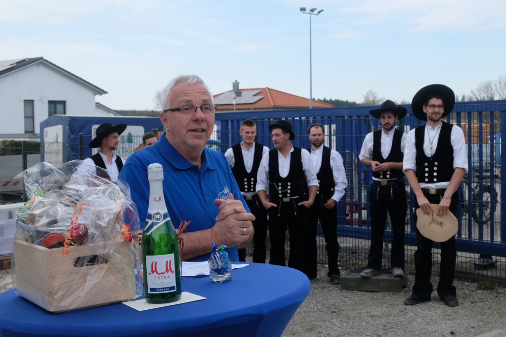 Hummertsried – Mit dem traditionellen Richtfestspruch durch die ausführenden Zimmerleute hat das Unternehmen Grün-Team am Donnerstag, 9. April, offiziell Richtfest seines neuen Firmensitzes in Hummertsried gefeiert. Rund 290 Quadratmeter moderne Bürofläche und drei altersgerechte Wohneinheiten mit ähnlich großer Fläche entstehen dort – ein Projekt mit Weitblick, wie auch die Gäste aus Politik und Gesellschaft betonten.