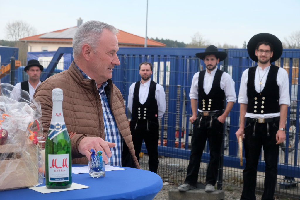 „Das Grün-Team wächst – das Grün-Team baut“, betonte Geschäftsführer Michael Bleichner in seiner Ansprache. Seit der Gründung 2003 in Hummertsried sei das Unternehmen stetig gewachsen – fachlich, personell und strukturell. Das neue Gebäude solle nun nicht nur funktionale Arbeitsplätze, sondern auch Lebensqualität bieten. Ein besonderer Fokus liegt bei dem Bau auf Nachhaltigkeit: Holz aus der Region, ein geothermisches Heiz- und Kühlsystem sowie eine Solaranlage sollen für eine energieeffiziente Versorgung im KfW-40-Standard sorgen. Damit verbunden ist auch eine Förderung aus dem Landesprogramm „Entwicklung Ländlicher Raum (ELR)“. Er bedankte sich auch bei den ausführenden Handwerksfirmen, die sehr gut zusammenarbeiteten und noch arbeiten.