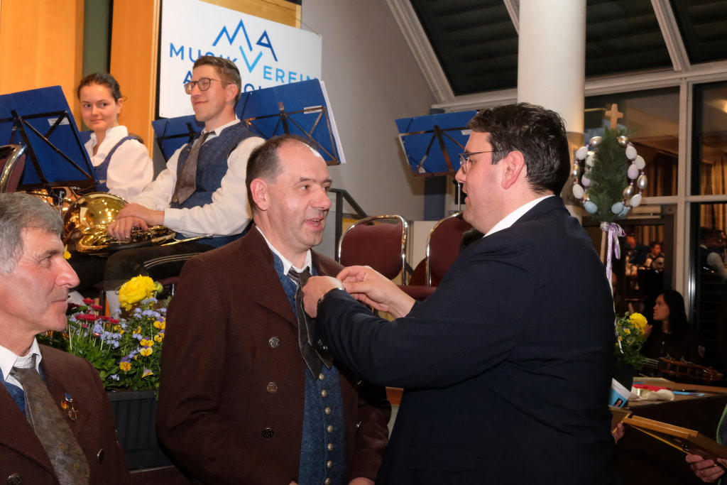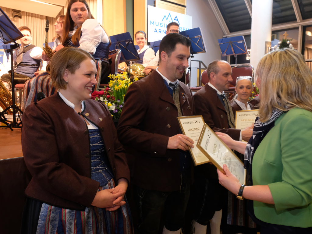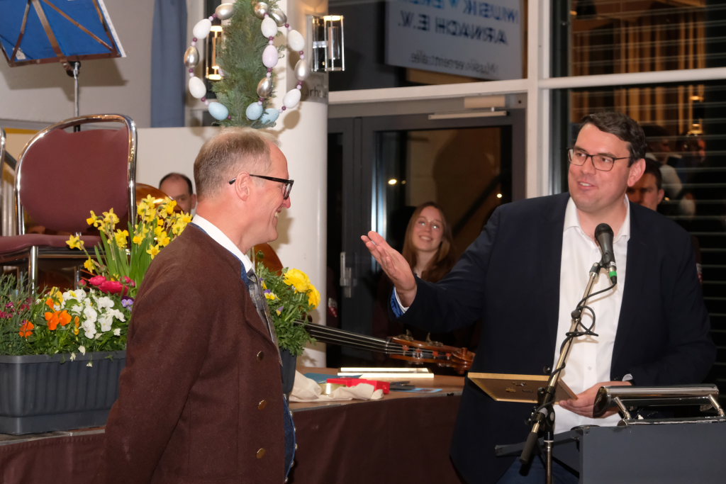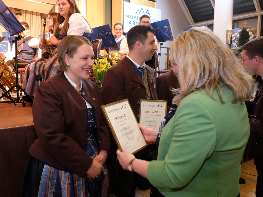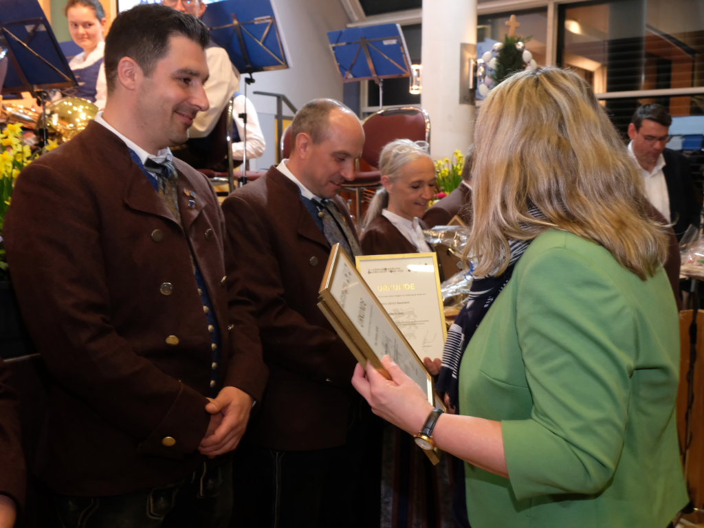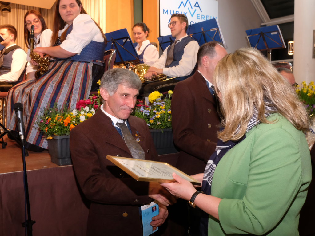 Wachter hatte an diesem Abend viel zu tun, denn er durfte Musiker ehren, die zusammen insgesamt über 500 Jahre Engagement für eine der schönsten Sachen der Welt, für die Musik, hinter sich haben. Deswegen holte er sich auch Bürgermeisterin Alexandra Scherer als Assistentin.