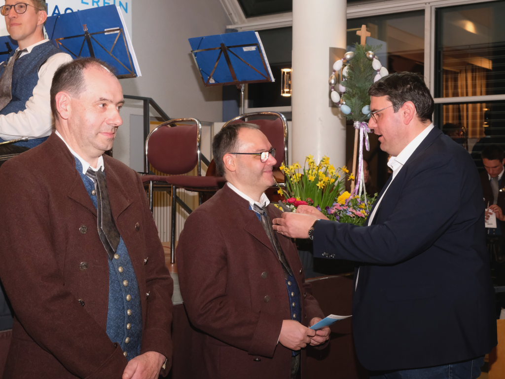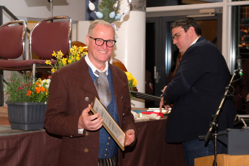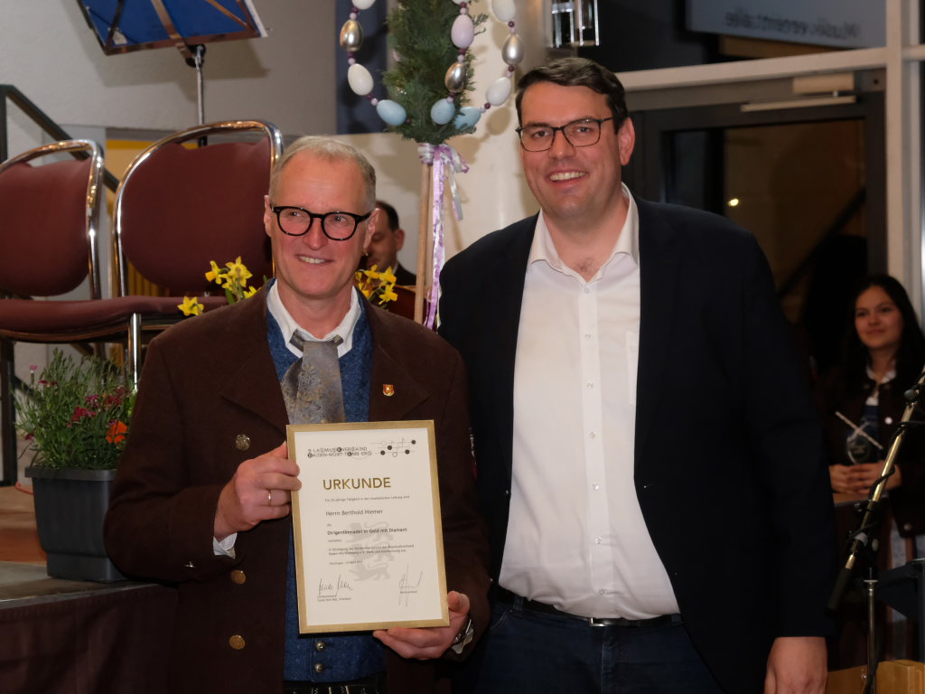 Und schließlich wurde noch Dirigent Berthold Hiemer mit der Dirigentennadel in Gold mit Diamant für 25 Jahre als Dirigent ausgezeichnet. Er begann seine musikalische Laufbahn als aktiver Musiker 1977 bei der Musikkapelle Muthmannshofen. Dort war 1989 bis 1998 zunächst Erster Vorstand sowie Dirigent von 2000 bis 2012. Danach dirigierte er von 2012 bis 2019 den Musikverein Rot an der Rot. Parallell dazu leitet er seit 1997 den Kirchenchor Muthmannshofen. Ein kleines Jubiläum (5 Jahre) feiert er als Dirigent in Arnach; er ist dort seit Januar 2020 tätig, auch wenn das erste Konzert 2020 Corona zum Opfer fiel.