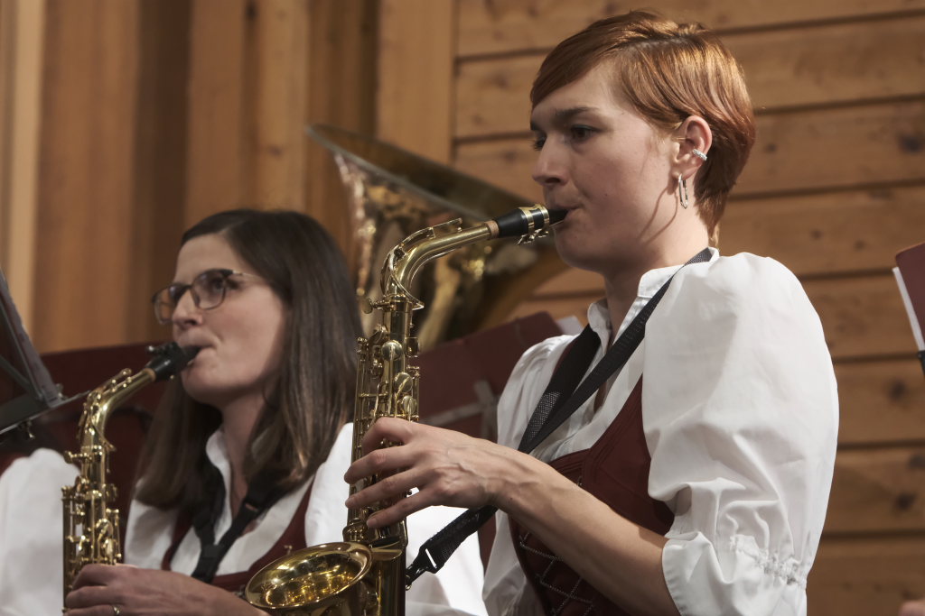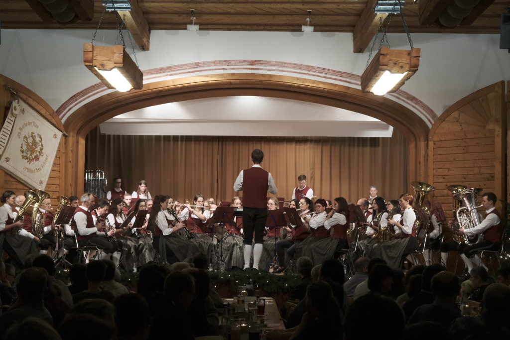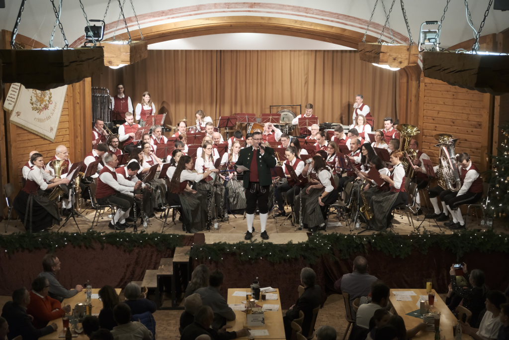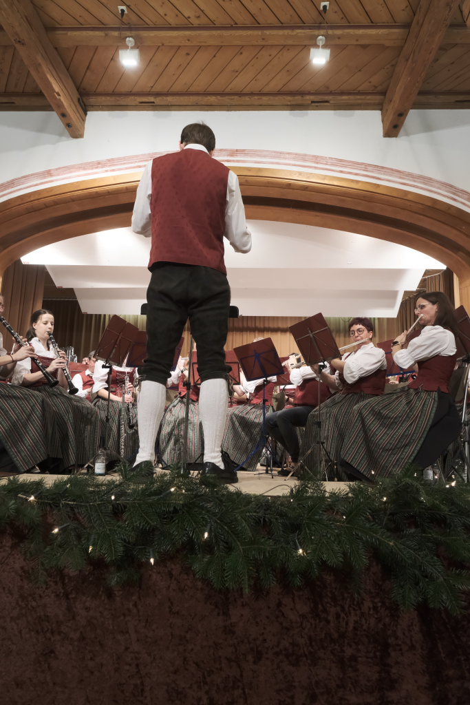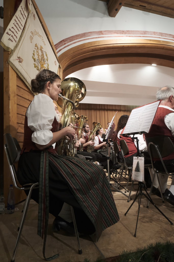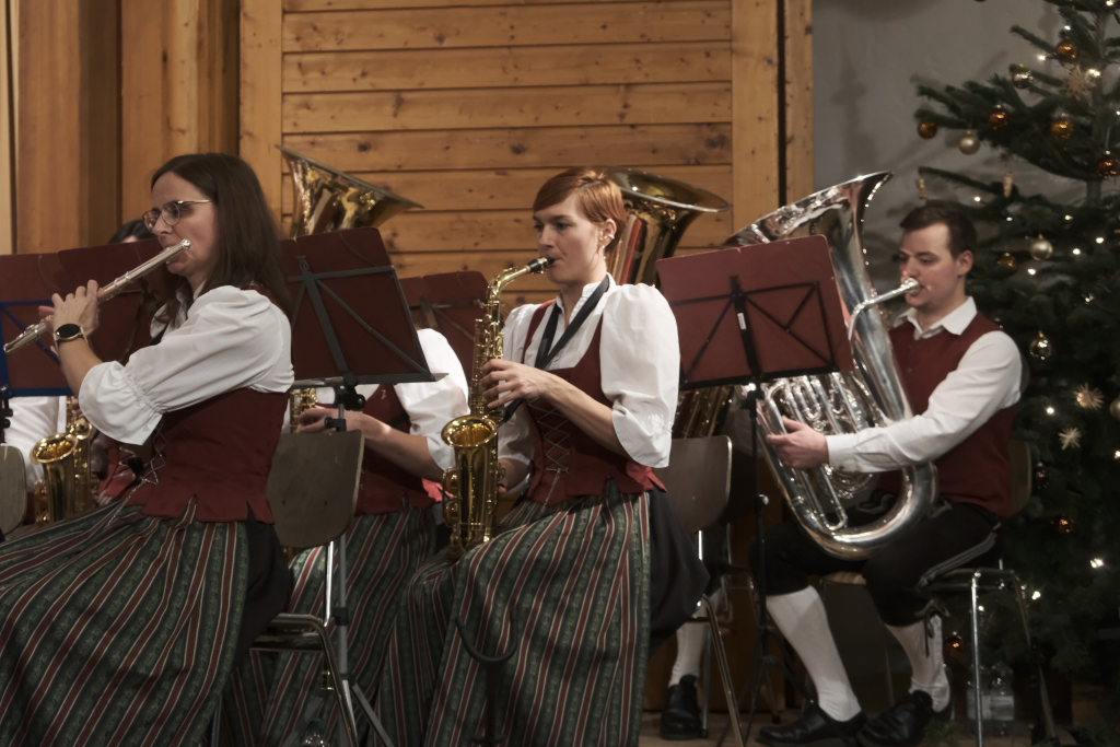 Mit dem schmissig-knackigen Konzertmarsch „Marsch vom edlen Volk“ mit einem sehr melodiösen Trio, geschrieben von Johannes Guggenmos und arrangiert von Alexander Pfluger, dem Gründer der „Schwindligen 15“, kehrten die Musiker nach der wohlverdienten Pause auf die weihnachtlich geschmückte Bühne des Dorfstadels zurück. „Heute muss es wohl heißen: Für das edle Volk gespielt“, merkte die charmante Moderatorin Heike Reichle dazu an, die gemeinsam mit Patrick Ernle durch das Programm führte.