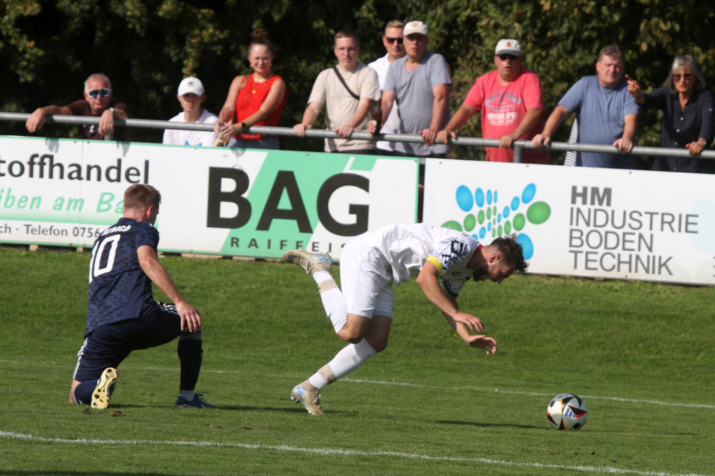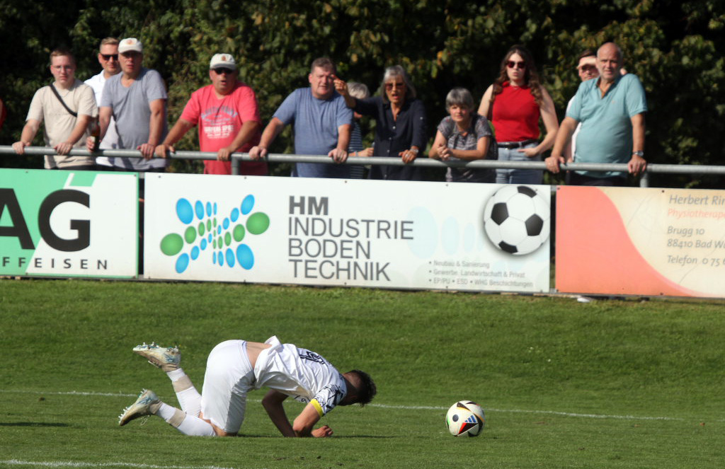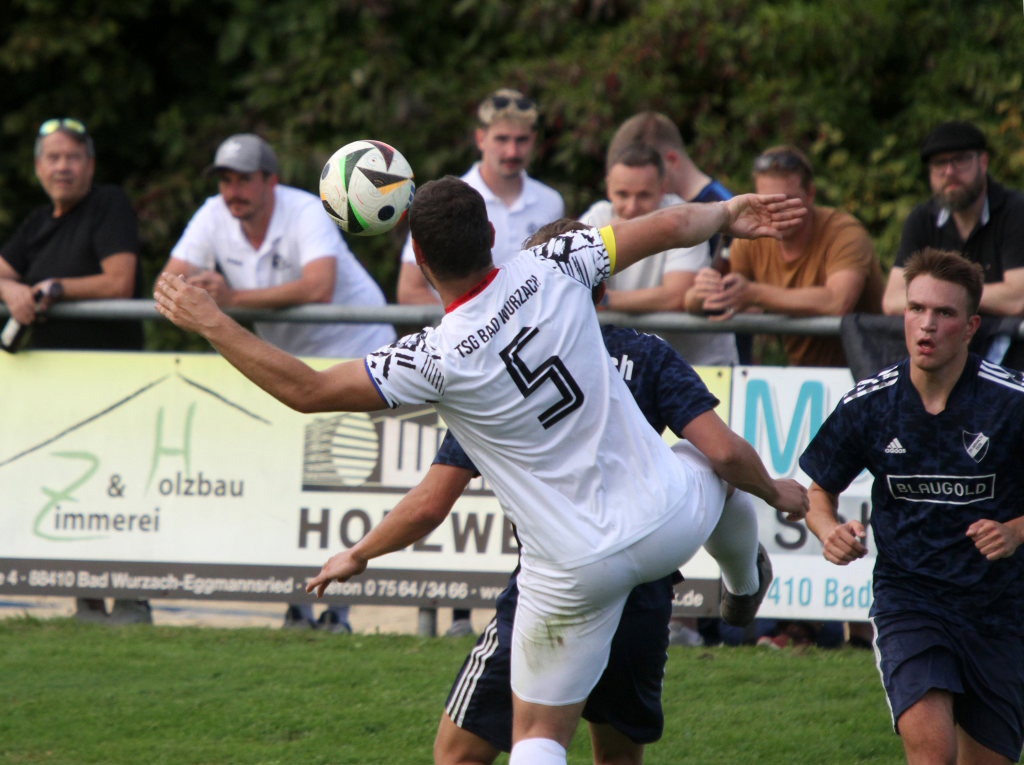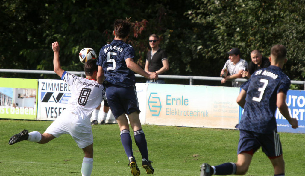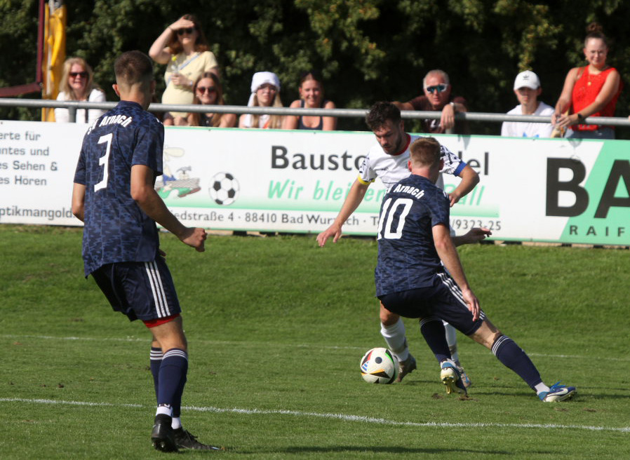 Arnach – Das erste Derby bei einem Punktspiel zwischen dem SV Arnach und der TSG Bad Wurzach seit annähernd einem halben Jahrhundert ging aufgrund ihrer großen Effizienz im Sturm mit Marvin Martello, der einen Doppelpack schnüren konnte, an die TSG. Bedanken konnten sich die Riedstädter auch bei ihrem Torwart Johannes Herrmann, der alles hielt, was auf seinen Kasten kam. Das Derby war sehr stark besucht; mehrere Hundert Zuschauer säumten den Spielfeldrand.