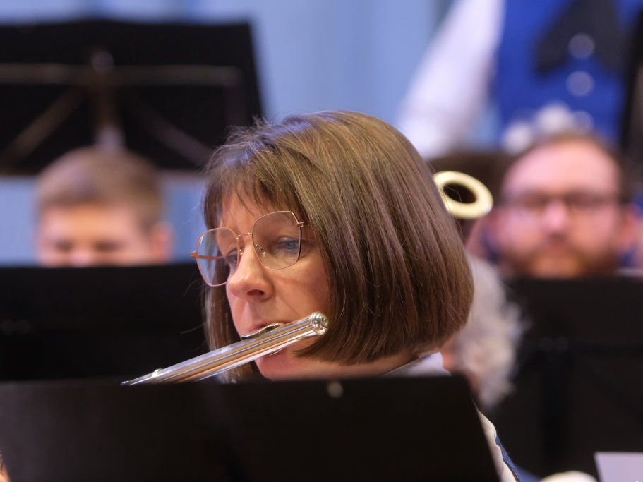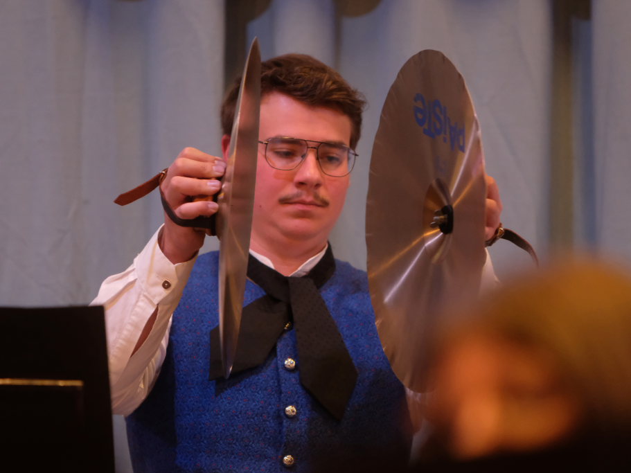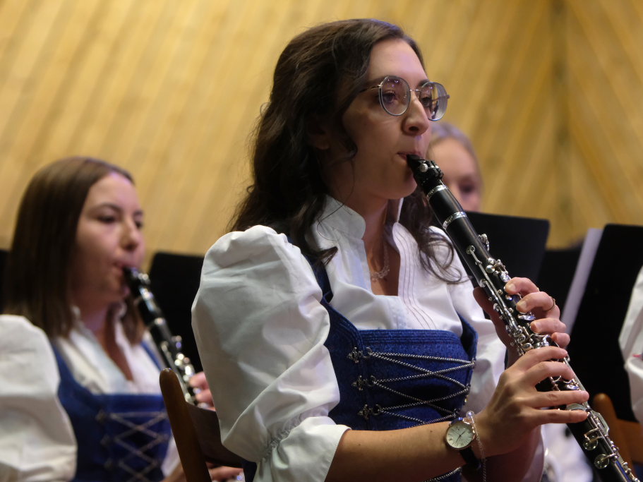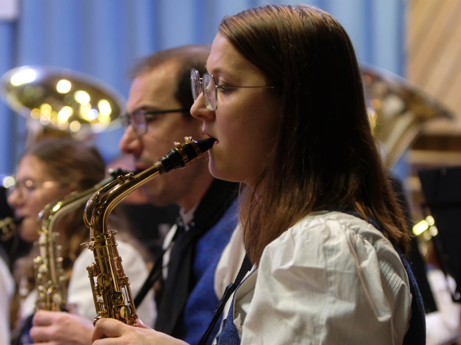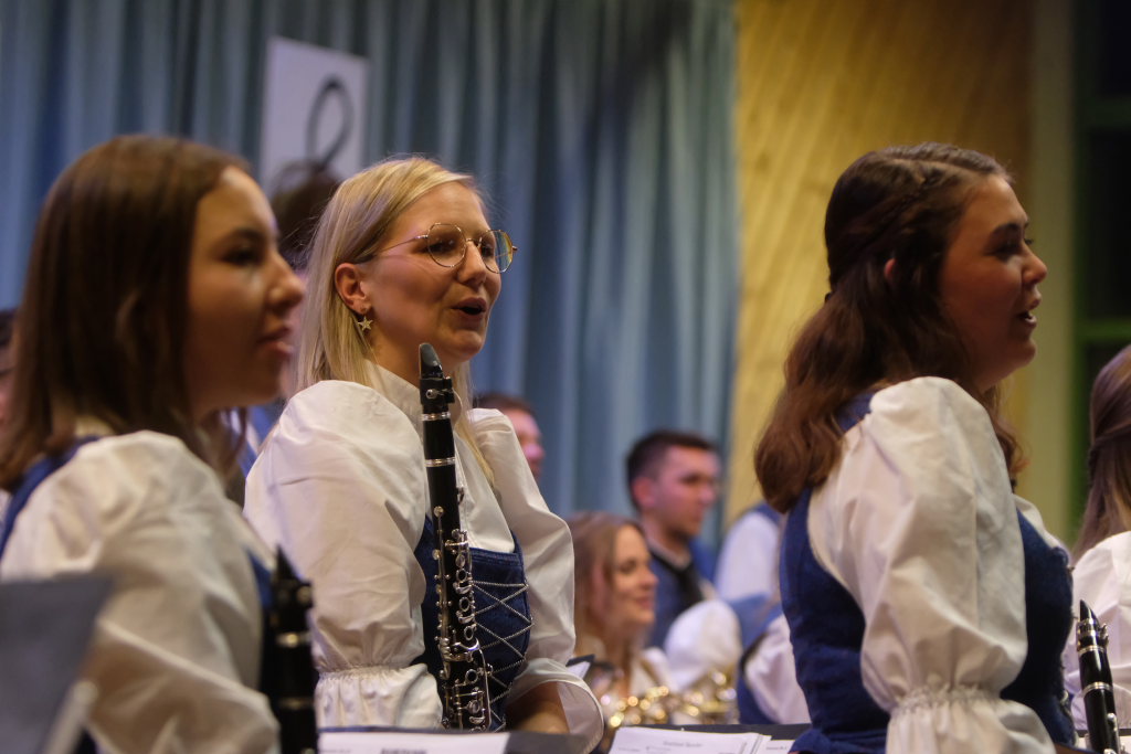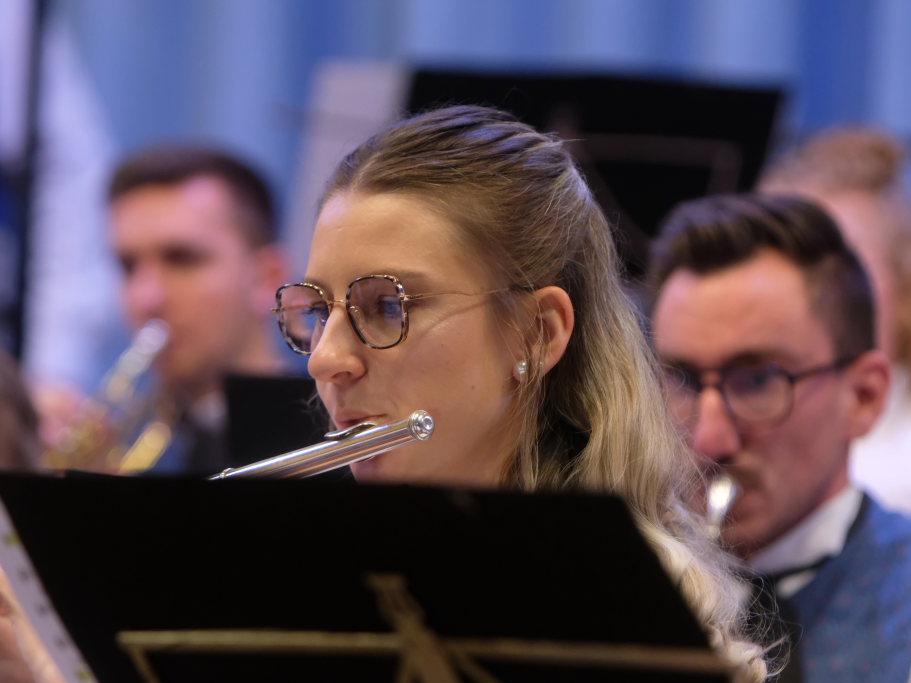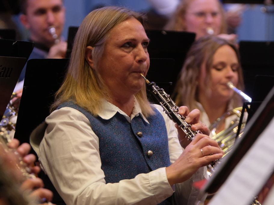 Mit Heartland Sketches des amerikanischen Komponisten Mark Camphouse startete „Pilot“ Alexander Werner in das Konzert. Es ist eine standesgemäße Eröffnungsfanfare mit Anklängen aus dem Iowa Fight Song. Ihm ließen die Musiker „Where never Lark or Eagle flew“ von James Curnow folgen. Dieses beeindruckende Werk für Blasorchester basiert auf einem inspirierenden Gedicht, das ein amerikanischer Pilot im Zweiten Weltkrieg geschrieben hat. Anna-Lena Feser, die gemeinsam mit Armin Lupfer charmant und gekonnt durchs Konzertprogramm führte, zitierte einige Zeilen aus dem Gedicht: „Auf! Auf! Entlang berauschendem und grellen Blau, hat mich mein leichter Sinn in Sturmeshöhn geführt, die keine Lerche und kein Adler je erreicht…“ Schillernde Blechbläserklänge und schwungvolle Holzbläserlinien begleiteten denn auch die Musiker auf ihrem Höhenflug. Und spiegelten die Liebe des jungen Mannes fürs Fliegen und seine Befreiung von den Sorgen der Welt wider.