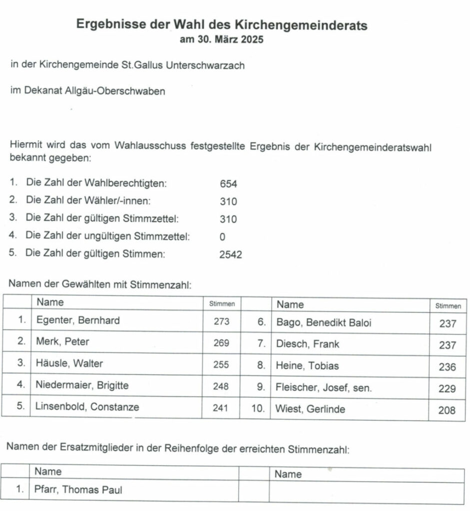 Unterschwarzach (rei) – In der katholischen Kirchengemeinde St. Gallus Unterschwarzach waren bei den Kirchengemeinderatswahlen am 30. März 654 Katholiken über 16 Jahre wahlberechtigt. Von diesen gingen 310 zur Wahl. Das ergibt eine Wahlbeteiligung von 47,4 Prozent. Von den elf Kandidaten erreichte Bernhard Egenter mit 273 Stimmen das beste Ergebnis. Das Pfarrsekretariat hat uns nachstehendes Ergebnis übermittelt: