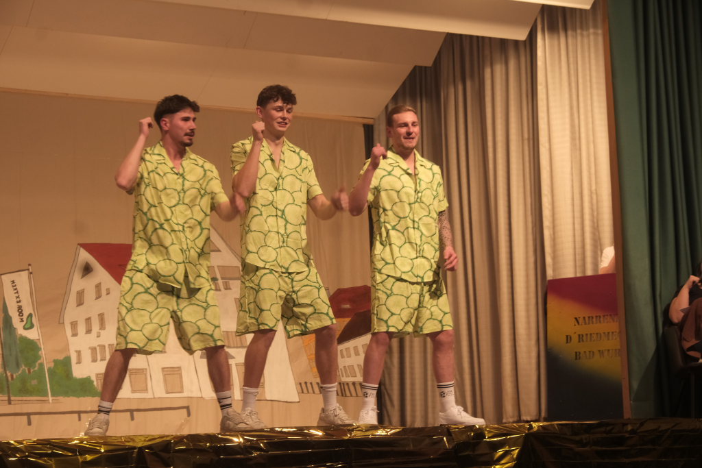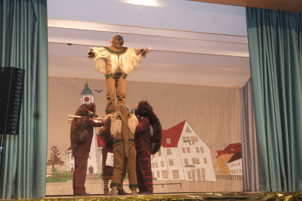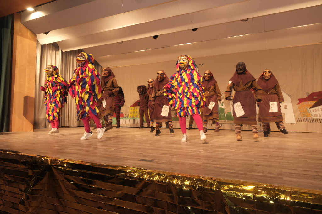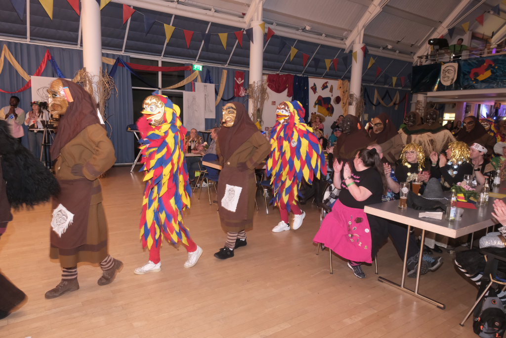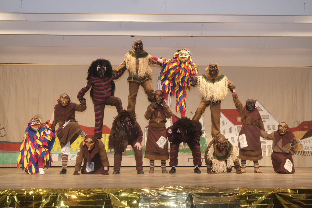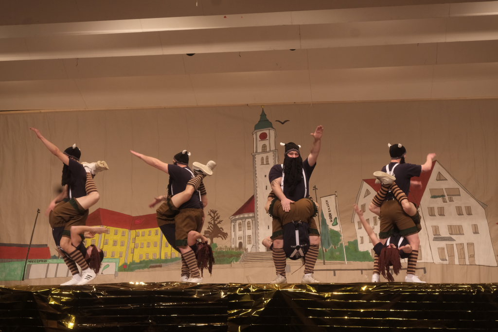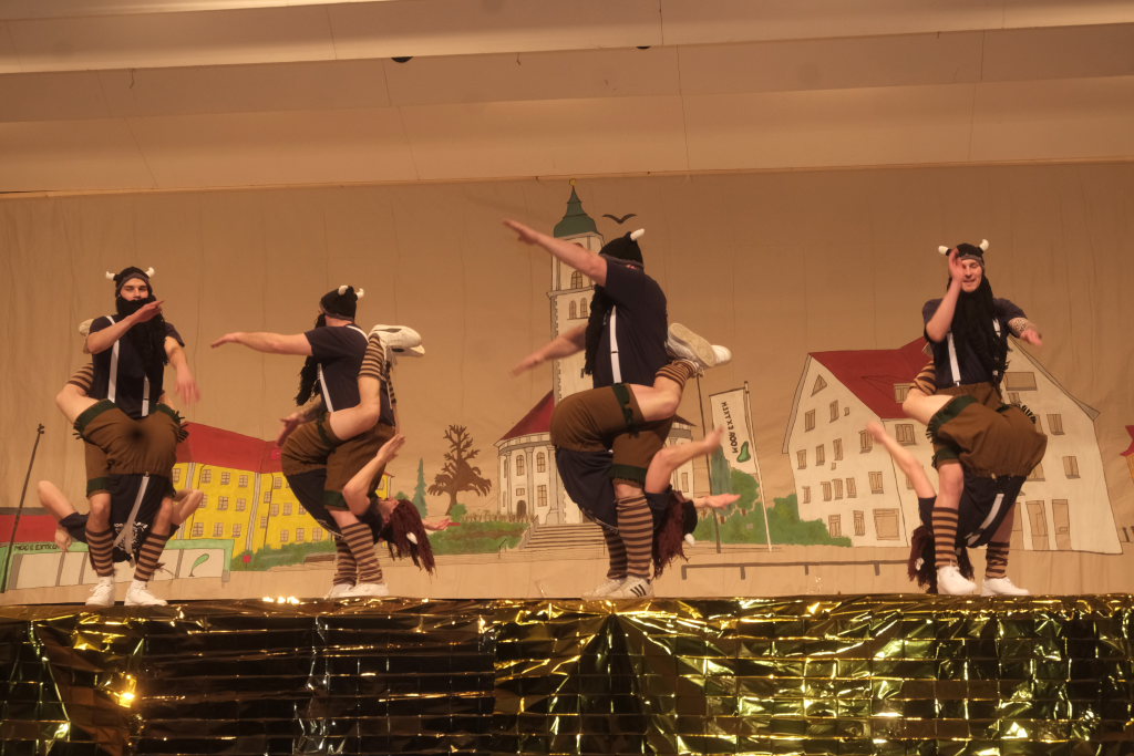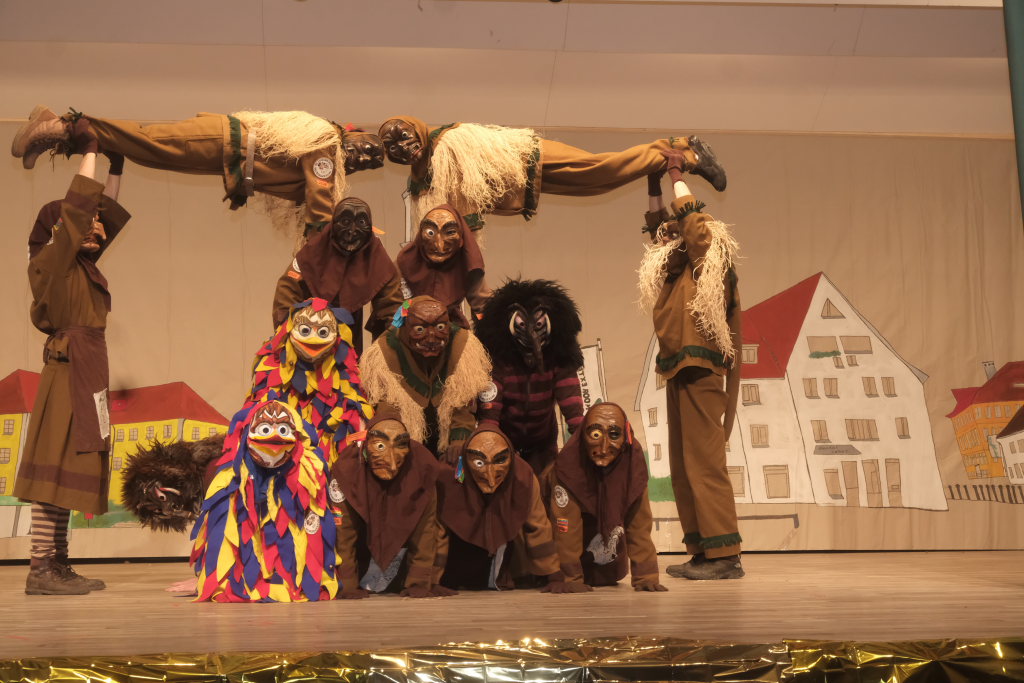 Das Programm eröffneten die Masken der Zunft mit ihrem Maskentanz. Es war eine sportlich-akrobatische Höchstleistung, die die Hästräger auf der Bühne boten. Für die obligatorische und lautstark geforderte Zugabe bauten die Tänzerinnen und Tänzer hinter dem geschlossenen Bühnenvorhang verschiedene Pyramidenkombinationen.