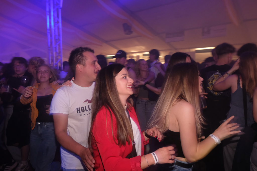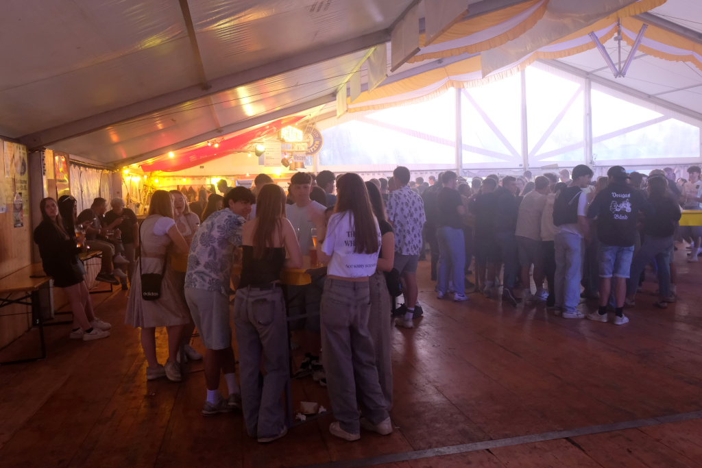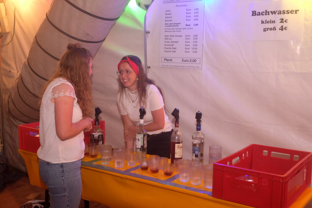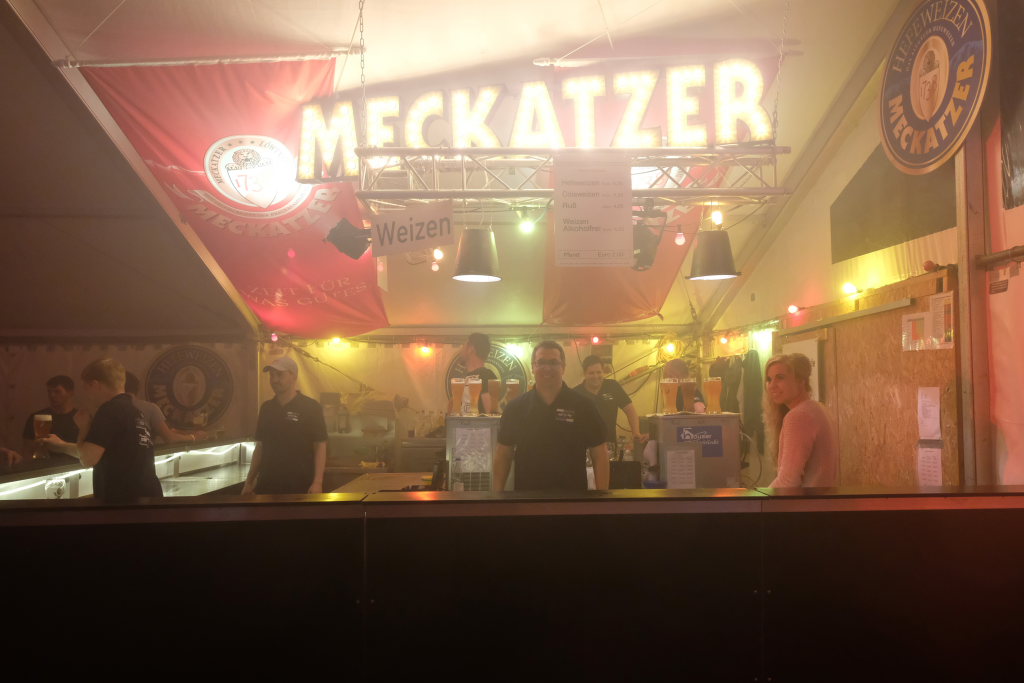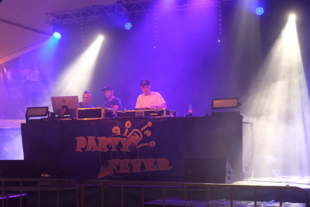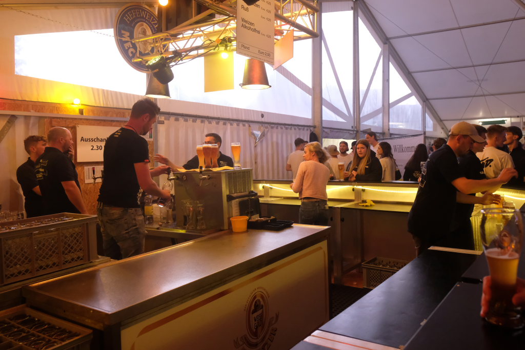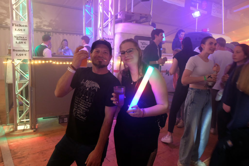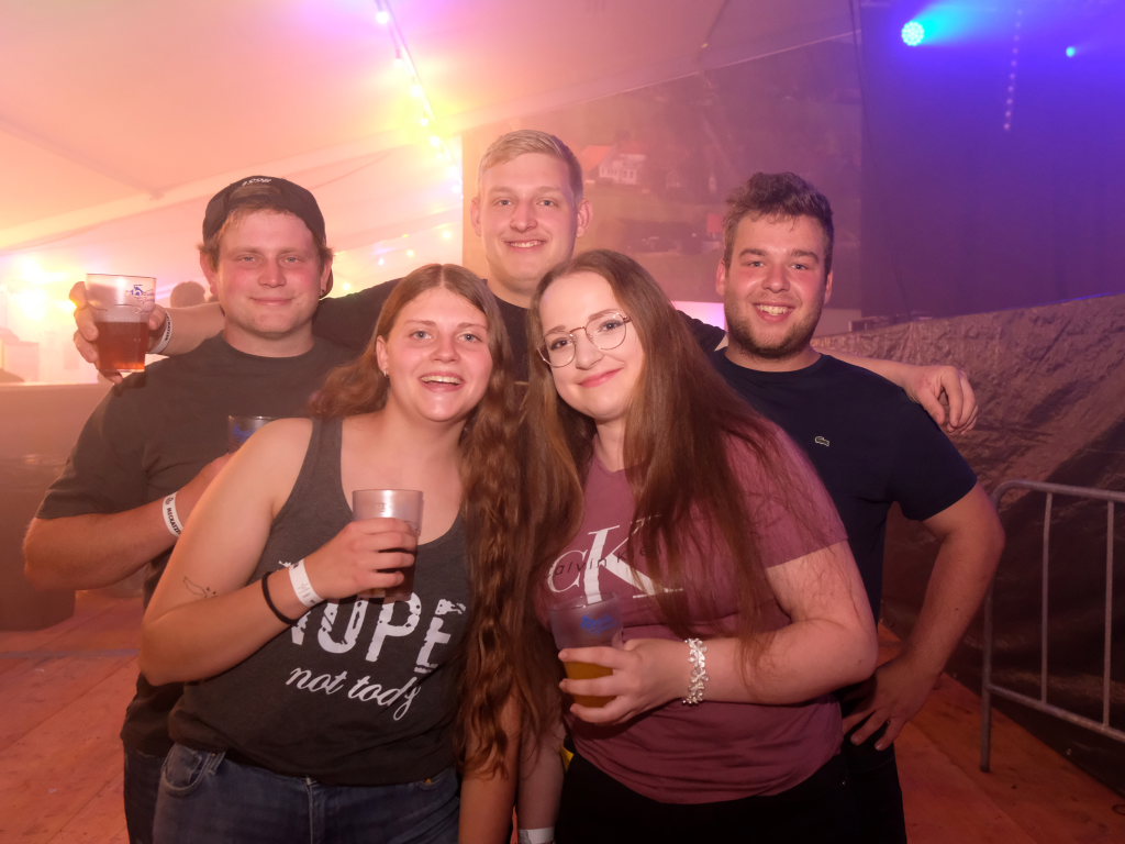 Zurück ins Festzelt: Vor der Bühne sammelten sich durch diese Aktion also die Feierwütigen, verstärkt durch die Anhänger des „Bachwassers“ das an der hufeisenförmig rund um die Bühne herum gebauten Bar ausgeschenkt wurde.