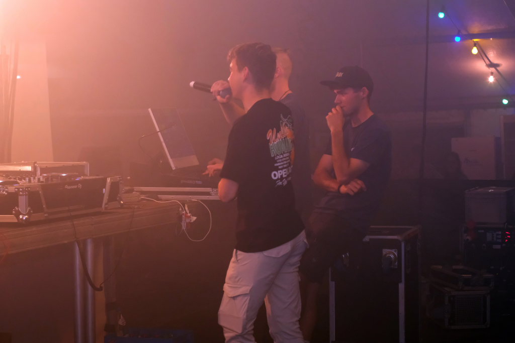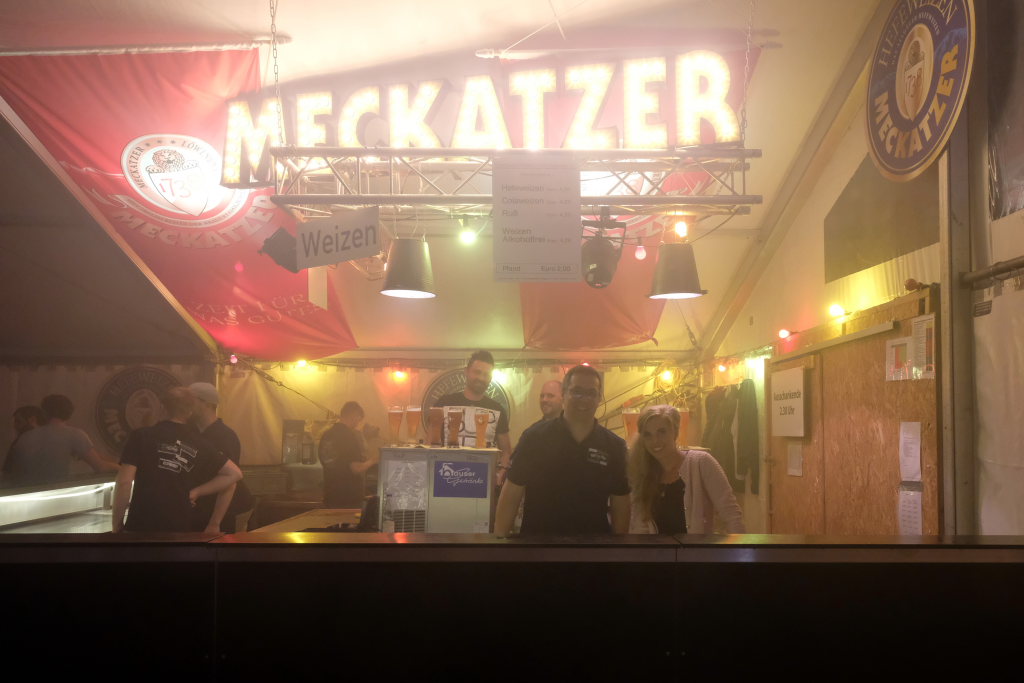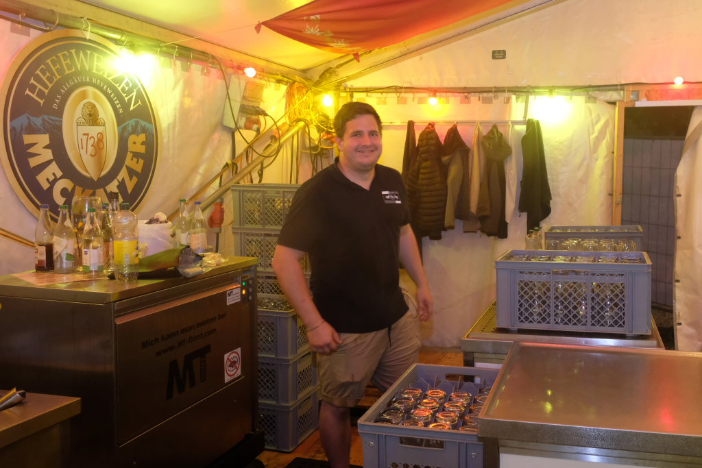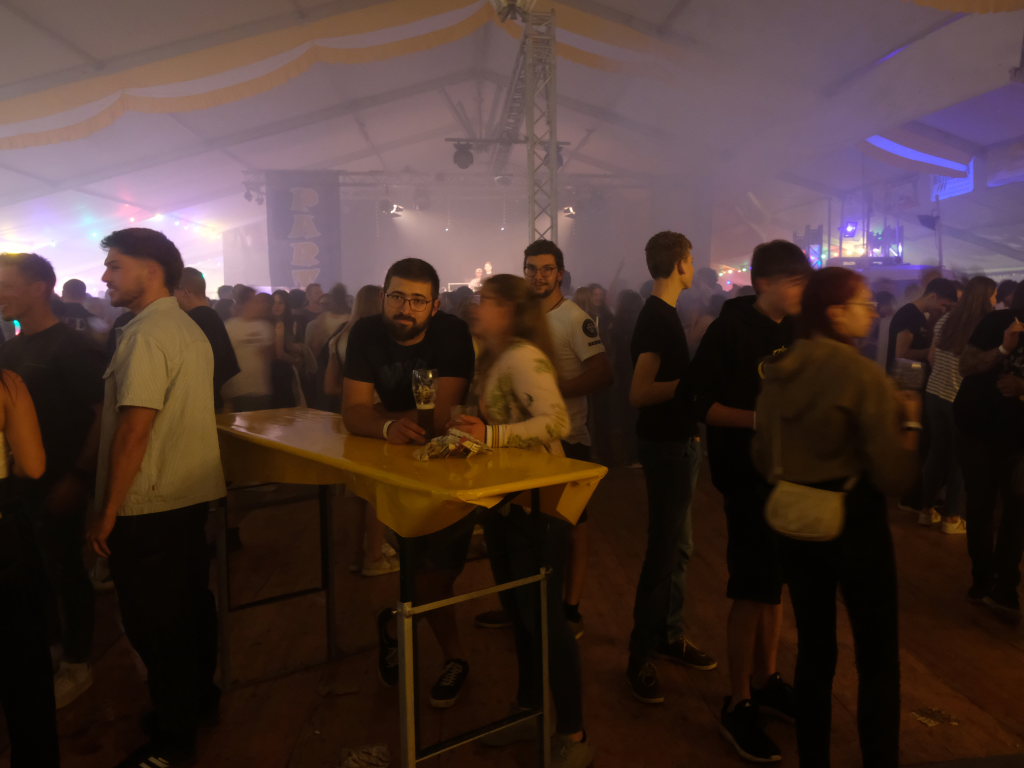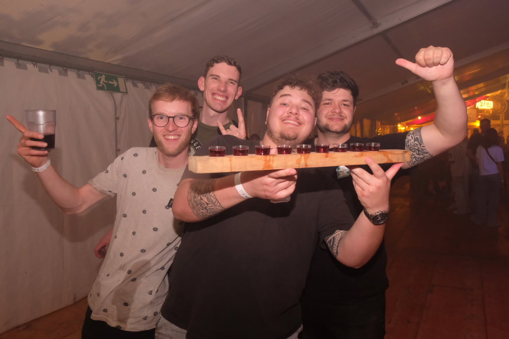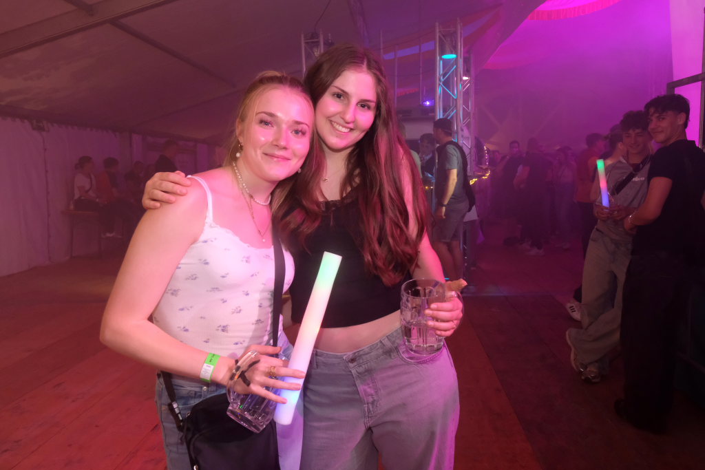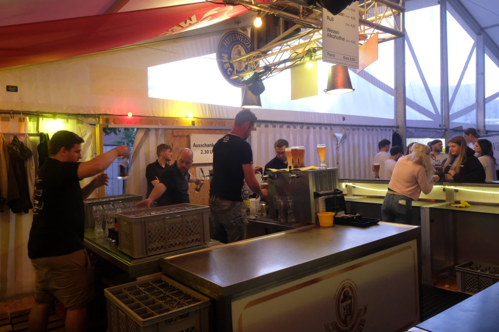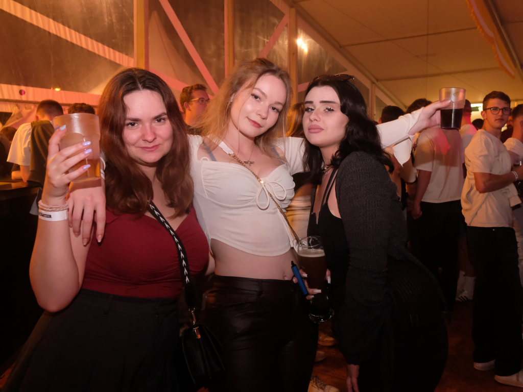 Zurück ins Festzelt: Vor der Bühne sammelten sich durch diese Aktion also die Feierwütigen, verstärkt durch die Anhänger des „Bachwassers“ das an der hufeisenförmig rund um die Bühne herum gebauten Bar ausgeschenkt wurde.