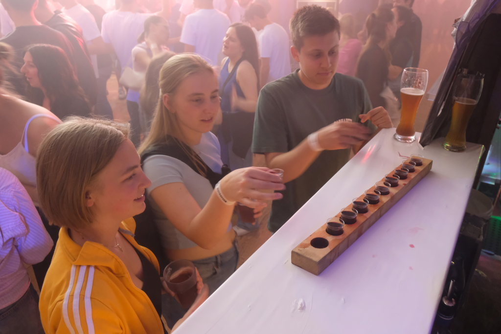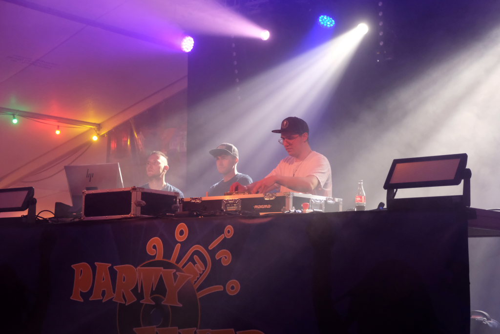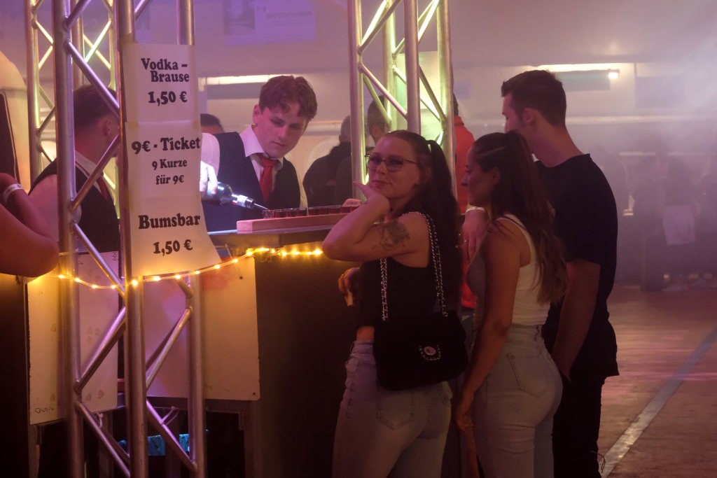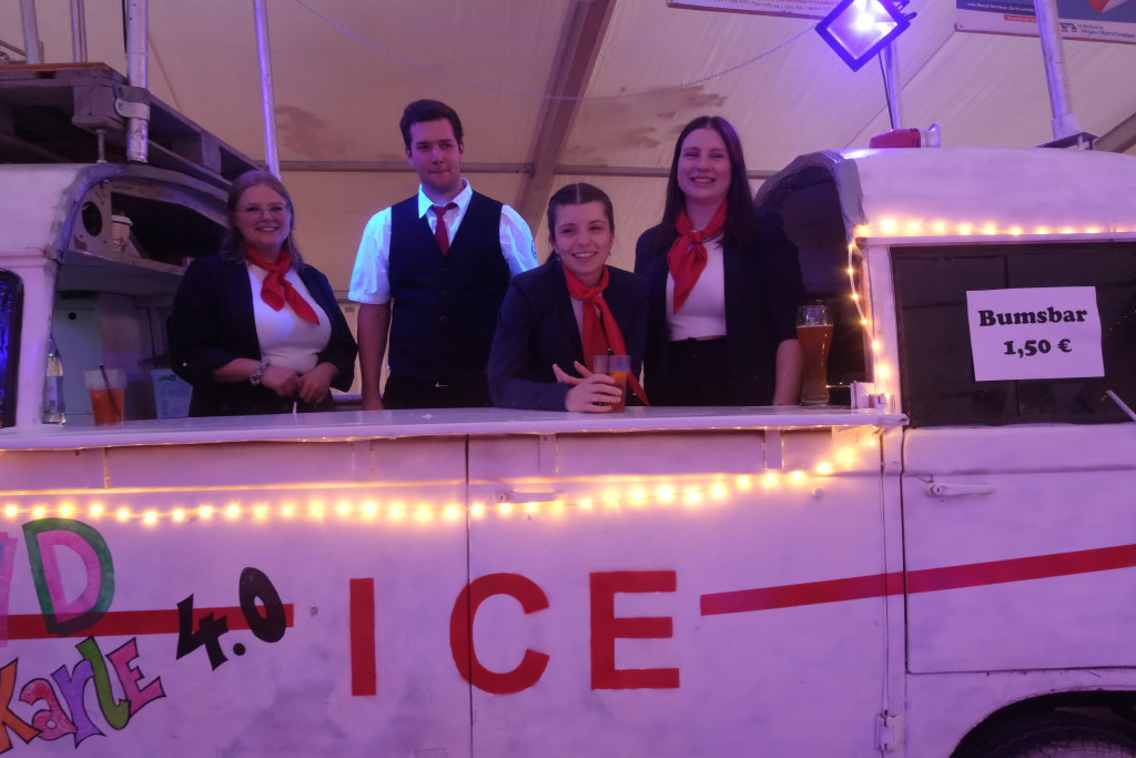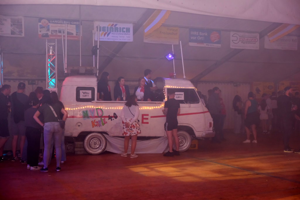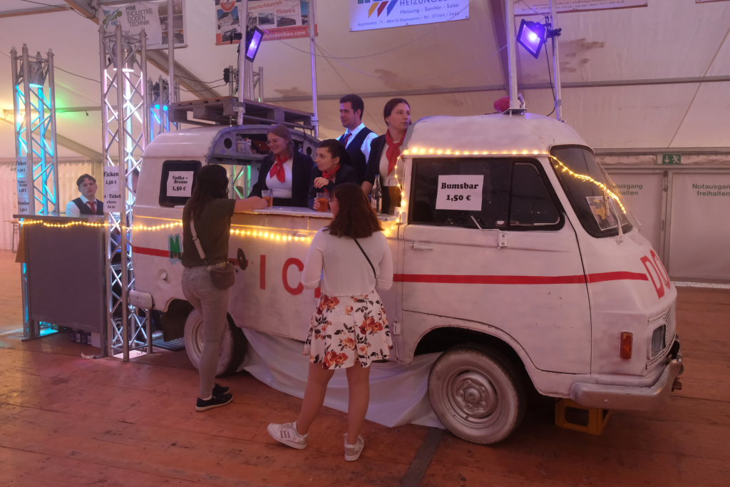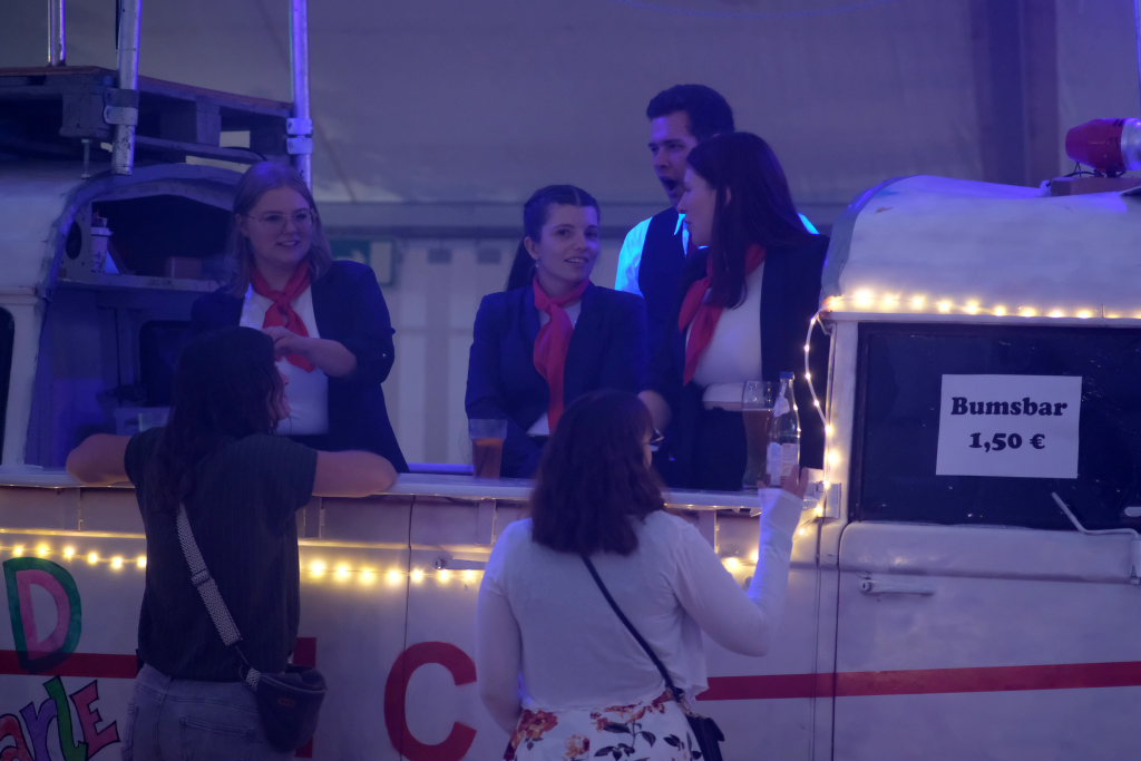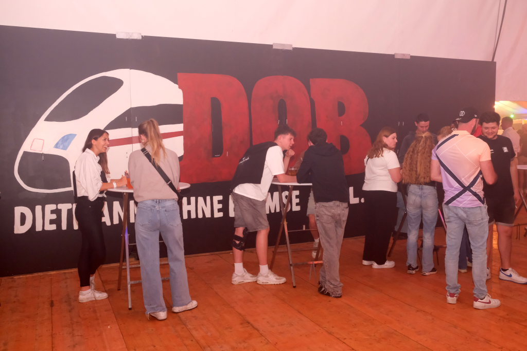 Garantiert keine Bremsen brauchte das zur Bar umfunktionierte Chassis eines alten Hanomag Hentschel, genannt Karle, mehr. Von diesem aus versorgten die im Stile des ICE-Bahnpersonals gekleideten Barkeeper das Volk mit allerlei Getränken und behielten dabei immer den Überblick über das Geschehen auf der Tanzfläche und bei den DJ´s auf der Bühne. Beim DOB gab es dann auch ganz im DB-Style ein 9 € Ticket, allerdings in flüssiger Form.