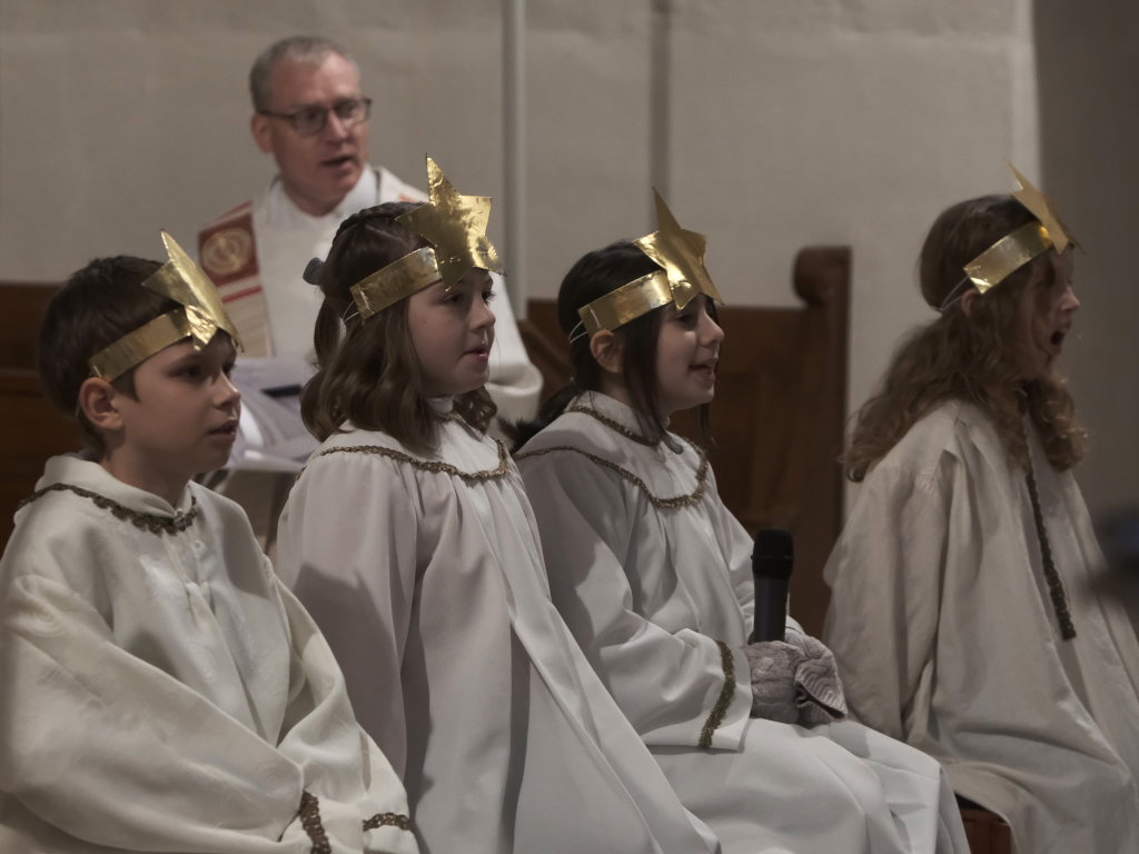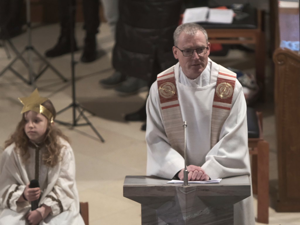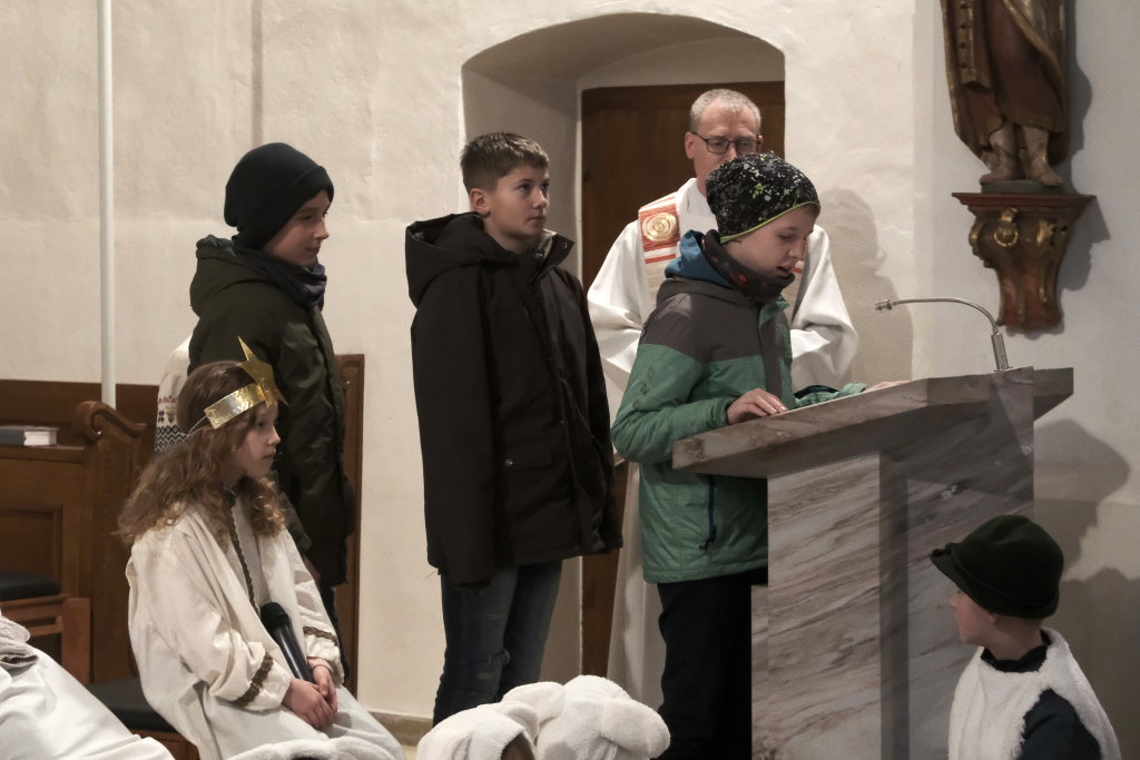 Mit „Ihr Kinderlein kommet“ lud die ganze Christengemeinde alle – nicht nur die Kinder – ein, sich dem Weihnachtswunder zu stellen. Und dass dies in Frieden geschehen möge, darum baten auch die Kinder, die die Fürbitten verlasen. Pfarrer Meschenmoser dankte vor dem Weihnachtssegen allen, die sich in irgendeiner Form am diesjährigen Krippenspiel beteiligt hatten.