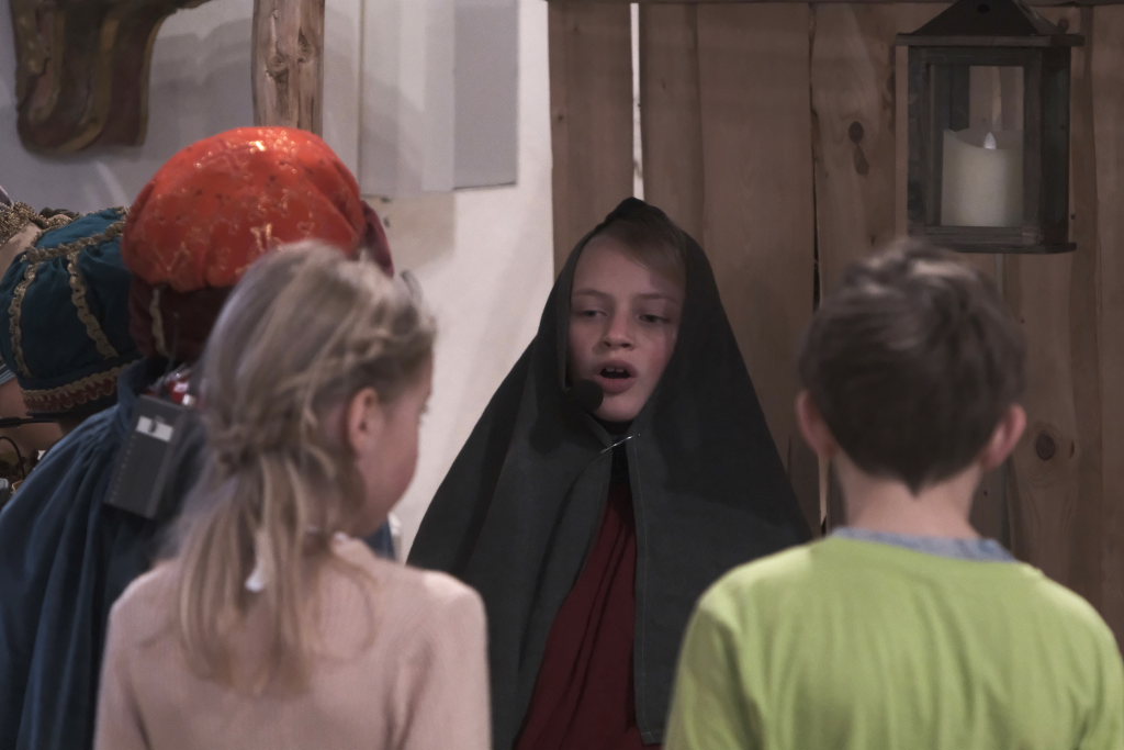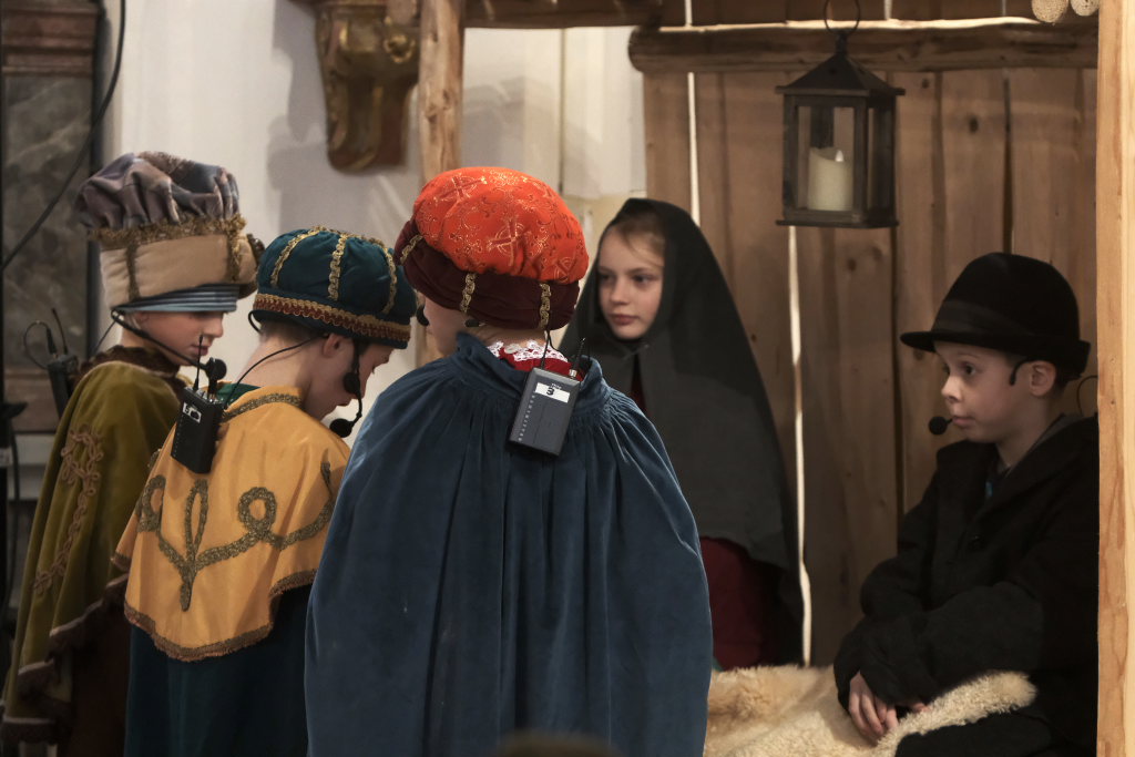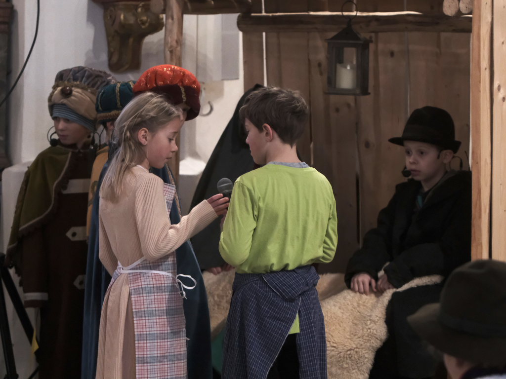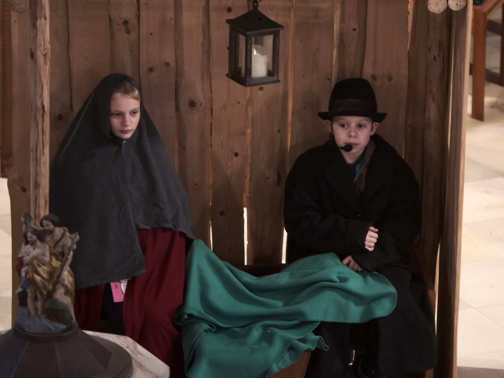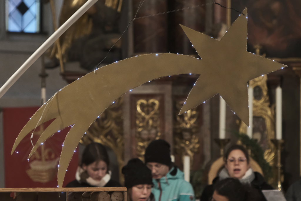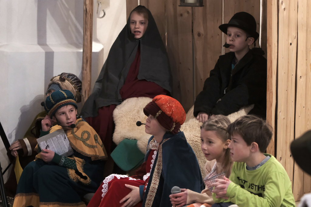„Kommet ihr Hirten“ und „Zu Bethlehem geboren“ – mit diesen Weihnachtsliedern wurde die Ankunft der Hirten, die sich auf Weisung des Engels, dem Weihnachtsstern folgend, auf den Weg gemacht und den Weg zu der Krippe gefunden hatten, musikalisch umrahmt. „Wären wird nur auch immer dem Stern gefolgt, hätten wir uns den Umweg über den Palast des Statthalters ersparen können“, so unterhielten sich die heiligen drei Könige beim Weg durch die Kirche, bis sie schließlich doch noch – wenn auch mit Verspätung – beim Christkind und dem Stall ankamen. Musikalisch begleitet wurde diese Ankunft mit dem Lied „Stern über Bethlehem“, in dem es unter in der zweiten Strophe heißt: „Stern über Bethlehem, nun bleibst Du stehn und lässt uns alle das Wunder hier sehn, das da geschehen.“