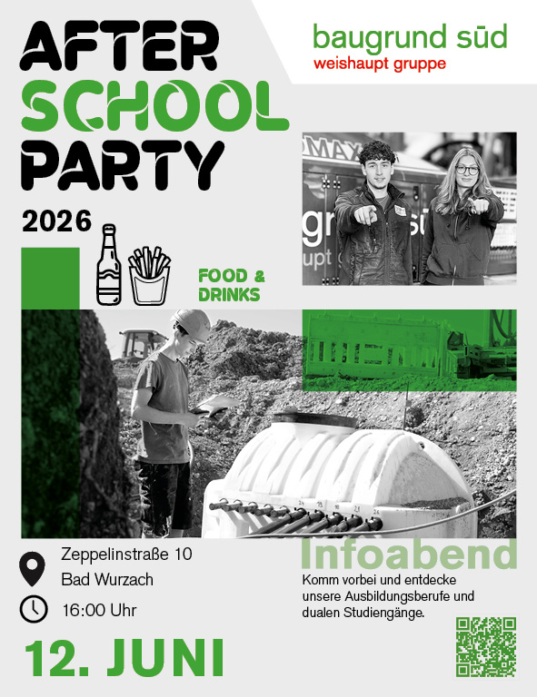 Bad Wurzach – Wie fühlt sich der Arbeitsalltag an? Welche Möglichkeiten bietet eine Ausbildung – und welcher Beruf passt zu mir? Antworten auf diese Fragen liefert die „After School Party 2026“, zu der das Unternehmen BauGrund Süd am 12. Juni um 16.00 Uhr in die Zeppelinstraße 10 in Bad Wurzach einlädt.