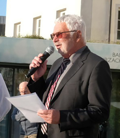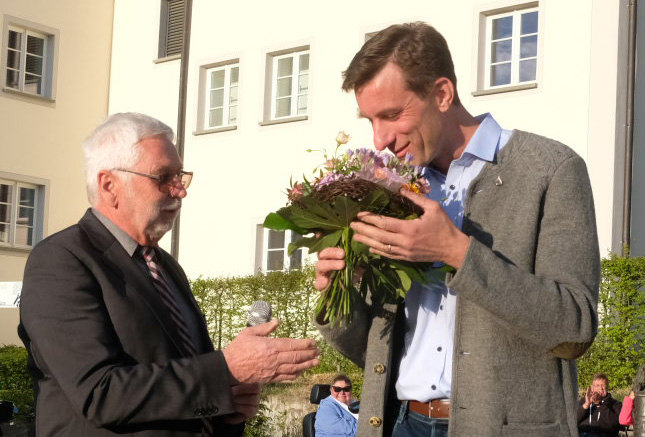 Erster Gratulant, der dem neugewählten Bürgermeister einen Blumenstrauß überreichte, war Klaus Schütt. Klaus Schütt lobte in seinem kleinen Statement die Arbeit der 150 Wahlhelfer, hob dabei besonders die hervorragende Arbeit von Wahlleiter Jan Högerle sowie von Martin Tapper hervor, der mit seinem Team vom Bürgermeisteramt die Wahl vorbereitet hatte.