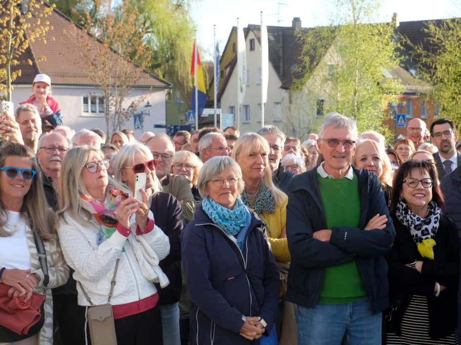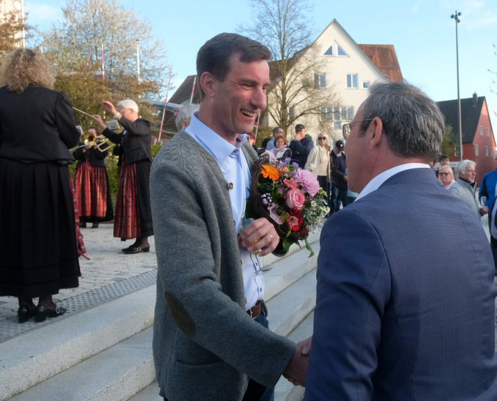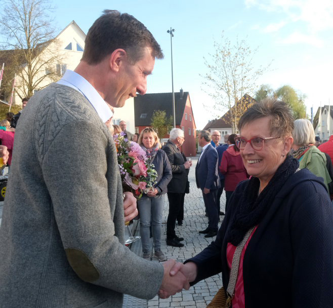 Fast eine Stunde dauerte das Defilee der Florian Schiller Gratulierenden, die bei Blasmusik und einem Glas Sekt den neugewählten Bürgermeister feierten. Gratulanten waren auch Ortsvorsteher und Gemeinderäte sowie der Landtagsabgeordnete Raimund Haser und der Bundestagsabgeordnete Wolfgang Dahler.