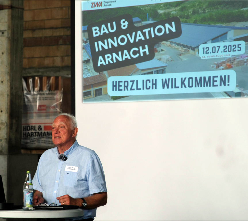 Ein Höhepunkt der Messe war der Vortrag von Bernhard Leitner, Geschäftsführer der Firma Green Code. Seit dem 1. Juli ist das Ziegelwerk Arnach Mitglied von Green Code und kann durch diese Partnerschaft den CO₂-Ausstoß in Betondecken um bis zu 20 % reduzieren. Zusätzlich ist die innovative Green Code Klimadecke zur Heizung und Kühlung vorgestellt worden. Der Vortrag stellte zentrale Zukunftsfragen in den Fokus und zeigte Wege auf, wie das Bauen schneller, effizienter, kostensparender und nachhaltiger gestaltet werden kann – mit Blick auf ökonomische, ökologische und soziale Nachhaltigkeit.
