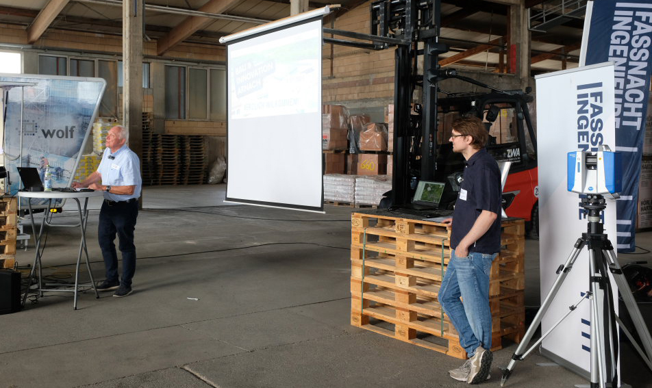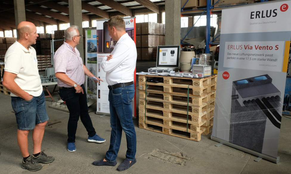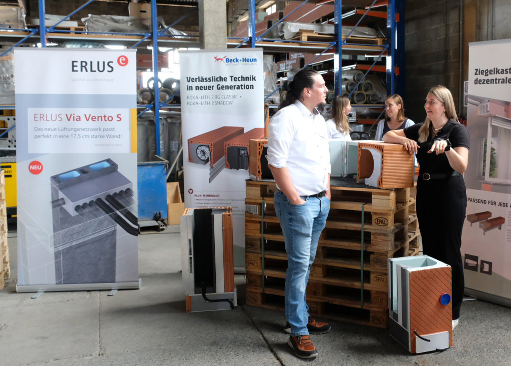 Darüber hinaus präsentierten verschiedene Firmen aktuelle Produkte und Innovationen: Fa. Wolf (Produkt Thepro DDS Sockelabdichtung) reiste mit einem mobilen Messestand an, das Ziegelwerk Arnach zeigte die hauseigene Fertigung von 3D-gedruckten Schalungen, und das entstehende „Ziegelwerk Areal“ mit modularen Büro- und Produktionsflächen wurde vorgestellt (Info: ziegelwerkareal.de). Die Firmen Erlus und Beck+Heun präsentierten neben den Kaminsystemen (Erlus) neue Lösungen für ein besseres Raumklima sowie zum Energiesparen durch Lüftungssysteme.