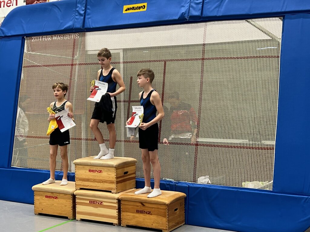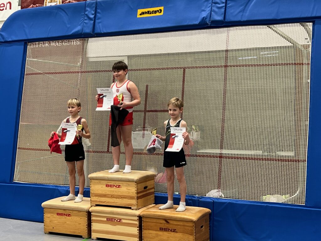 Den Auftakt machten die jüngsten Teilnehmer der Allgemeinen Klasse. Für Julius Berle (Jahrgang 2018) war es der erste Wettkampf auf dem Doppelmini-Trampolin – und der verlief äußerst erfolgreich: Mit sauber ausgeführten Sprüngen erkämpfte er sich direkt einen starken dritten Platz. Ebenfalls auf dem Treppchen landete Gabriel Herdrich (Jahrgang 2015), der in seiner Altersklasse einen hervorragenden zweiten Platz belegte.