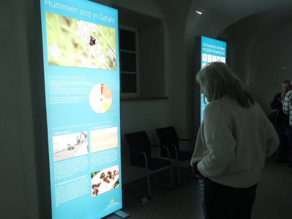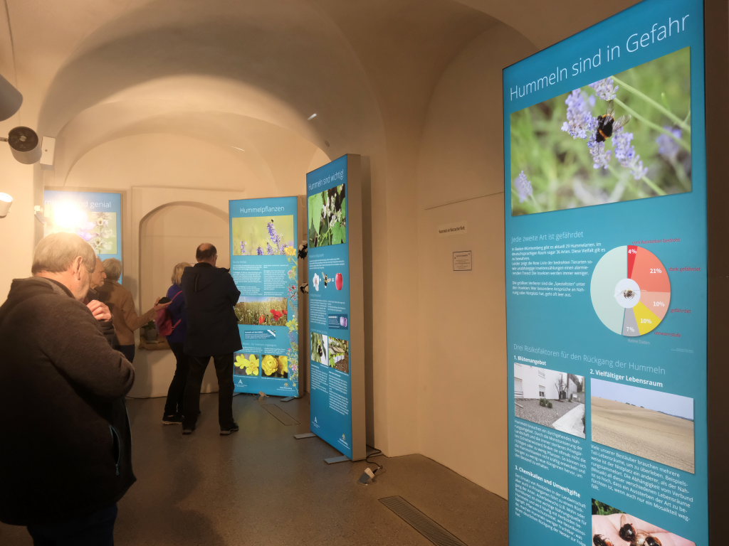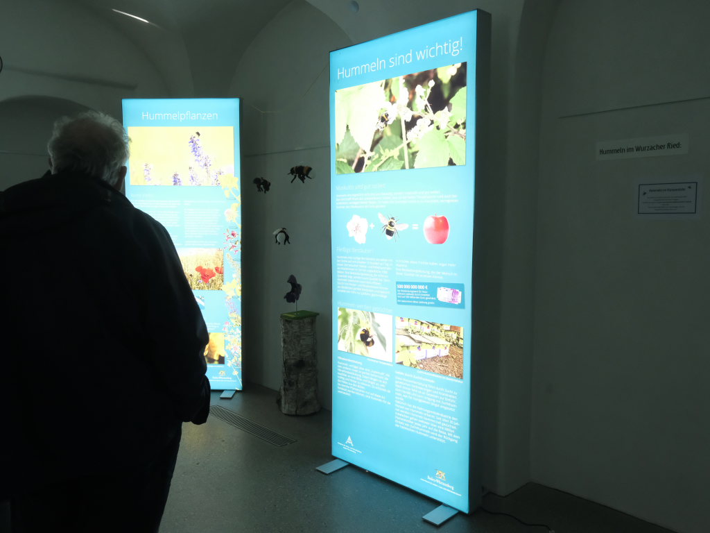 Bad Wurzach – Unter dem Titel „Muskulös und gut isoliert – Hummeln, die Superhelden unter den Insekten“ lädt das Naturschutzzentrum Wurzacher Ried Besucher zu der aktuellen Wechselausstellung im Gewölbegang ein, auf zehn großformatigen, beleuchteten Tafeln sich näher mit dem Leben dieser „Superhelden“ zu befassen. Aus privaten Gründen musste Michael Eick, der Leiter der Akademie für Natur- und Umweltschutz Baden-Württemberg, auf die Reise nach Bad Wurzach verzichten, so dass Dr. Siegfried Roth, der Leiter des Naturschutzzentrums, kurzfristig die fachliche Einführung übernehmen musste.