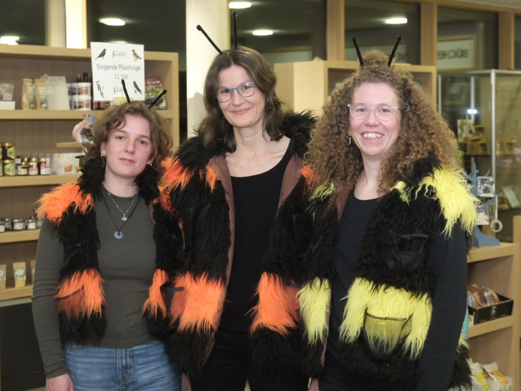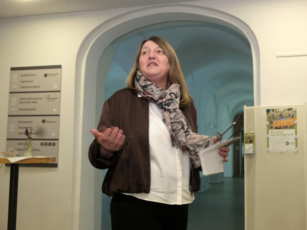Für Bürgermeisterin Alexandra Scherer, die qua Amtes Stiftungsratvorsitzende der Stiftung Naturschutz als Träger des Naturschutzzentrums Wurzacher Ried ist, war es eine große Freude, die Ausstellung zu eröffnen. „Besser kann man das Thema nicht präsentieren,“ sagte sie in ihrer Begrüßung der zahlreichen Gäste zu den drei Damen des Naturschutzzentrums, die sich als „Hummeler“ verkleidet hatten, wie die großen Insekten im Schwäbischen heißen.