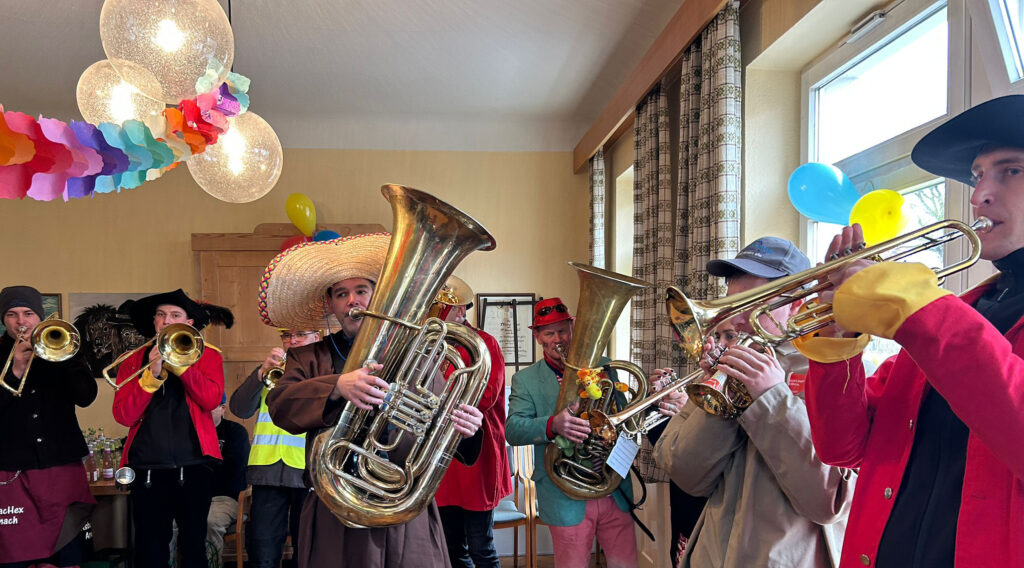 Mit Musik stürmen die Arnacher Narren den Amtssitz des Dorfoberen.