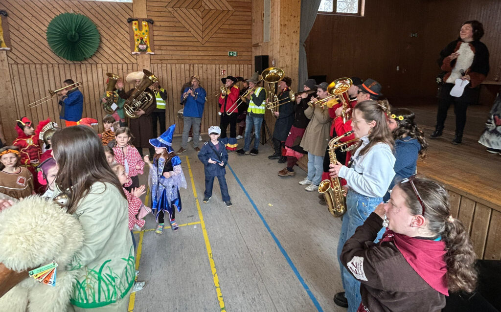 Arnach – Auch in diesem Jahr war für viele Arnacher – ob alt, ob jung, ob groß, ob klein – in der Fasnet etwas geboten. Außer dem großen Umzug der Narrenzunft (wie bereits berichtet) fand wieder der Kinderball sowie die Sportler-Party-Nacht des SV Arnach statt. Natürlich wurden am Gumpigen Donnerstag wieder die Schüler und Kindergartenkinder von den Narren befreit und auch das Rathaus von denselben gestürmt. Zum 98. Mal waren am Fasnetsamstag die Arnacher Musikanten im Dorf und dem Umland unterwegs, um die „Fasnet zu verkünden“.