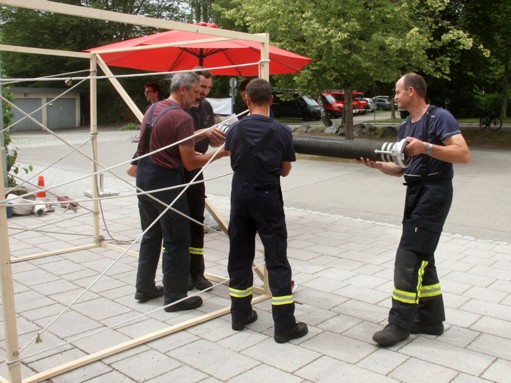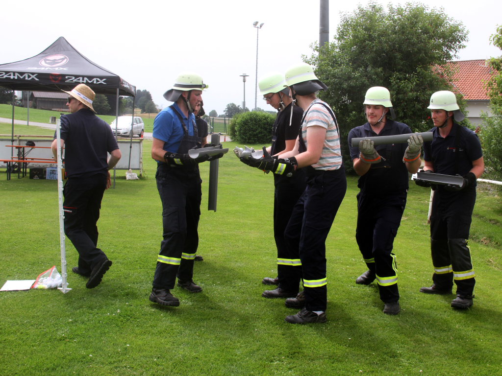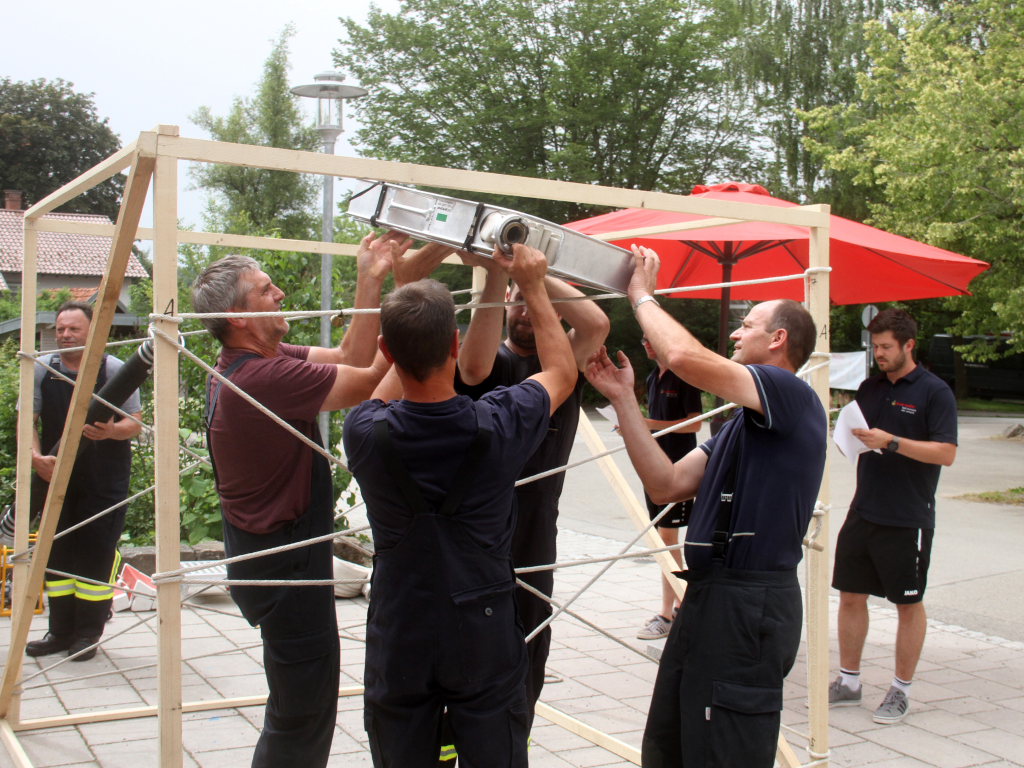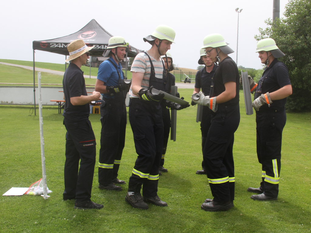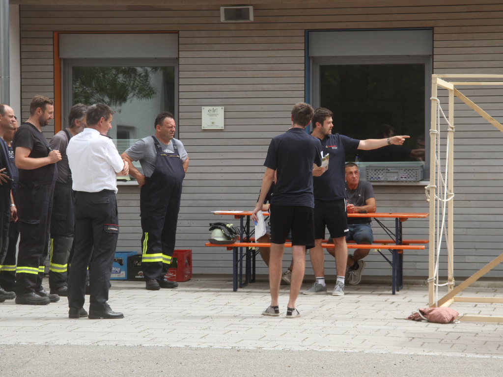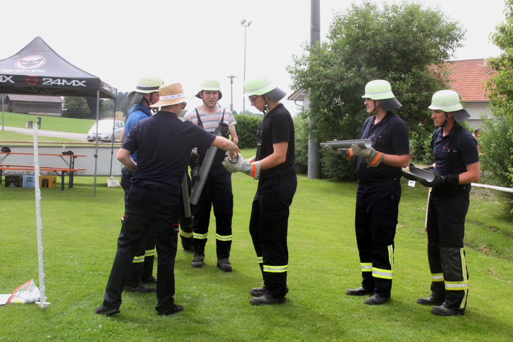 Somit machten sich zwölf Mannschaften mit Jugendfeuerwehr und als Gast die Wehr aus Diepolshofen daran, die sechs Aufgaben zu lösen. Los ging es beim Feuerwehrhaus, wo zunächst die Köpfe zu rauchen begannen, kein Wunder bei über 30 Grad im Schatten. Dabei mussten die Teams feuerwehrtechnische Fragen beantworten, aber auch Fragen der Allgemeinbildung: z.B „Wer schrieb die deutsche Nationalhymne, „Wann wurde die Freiheitsstatue gebaut?“ oder „Wie hoch ist die Zugspitze?“