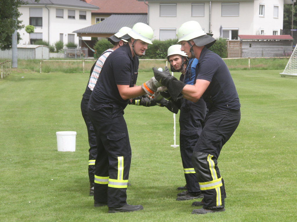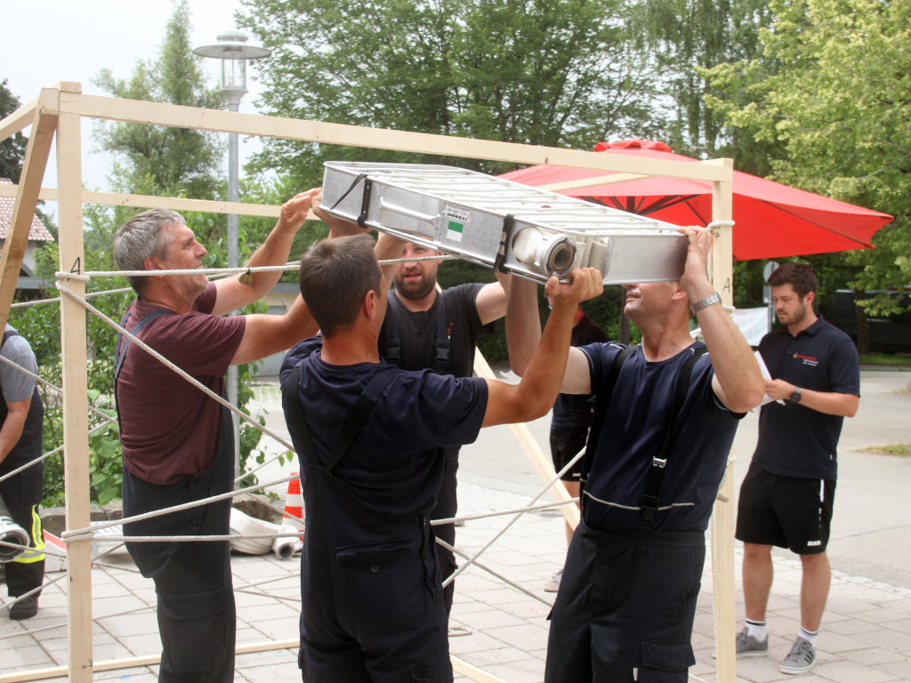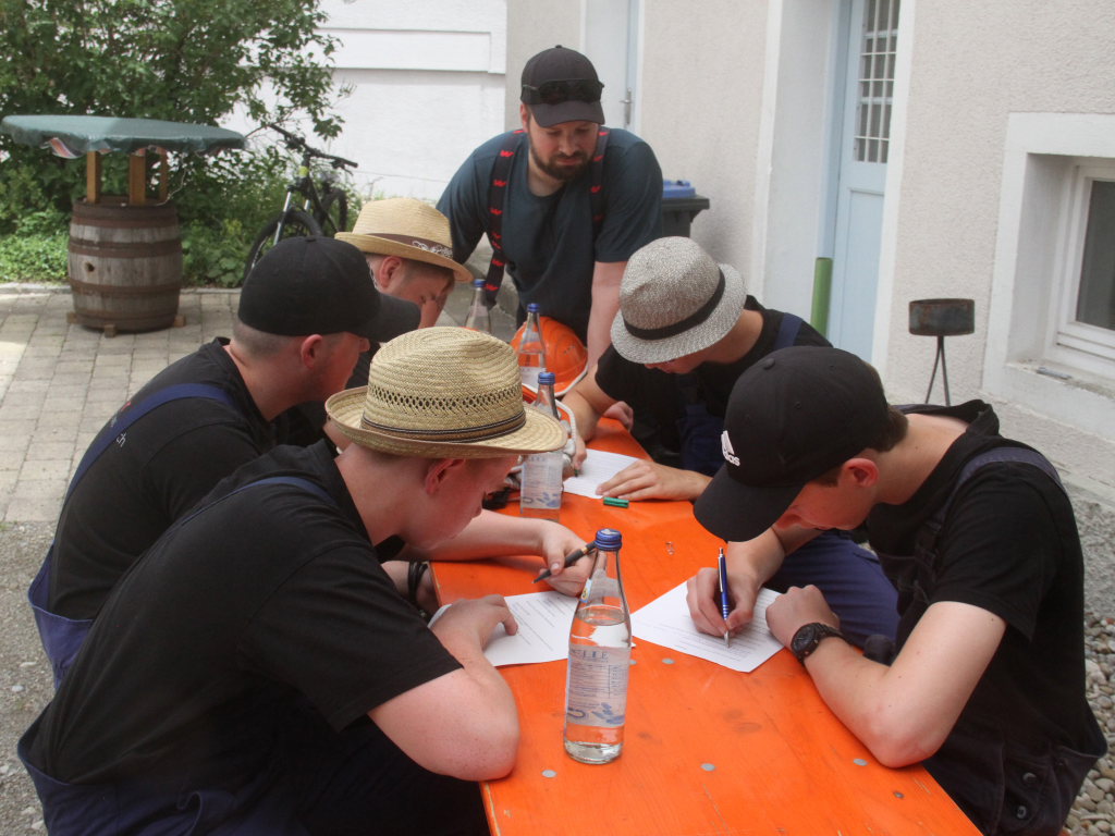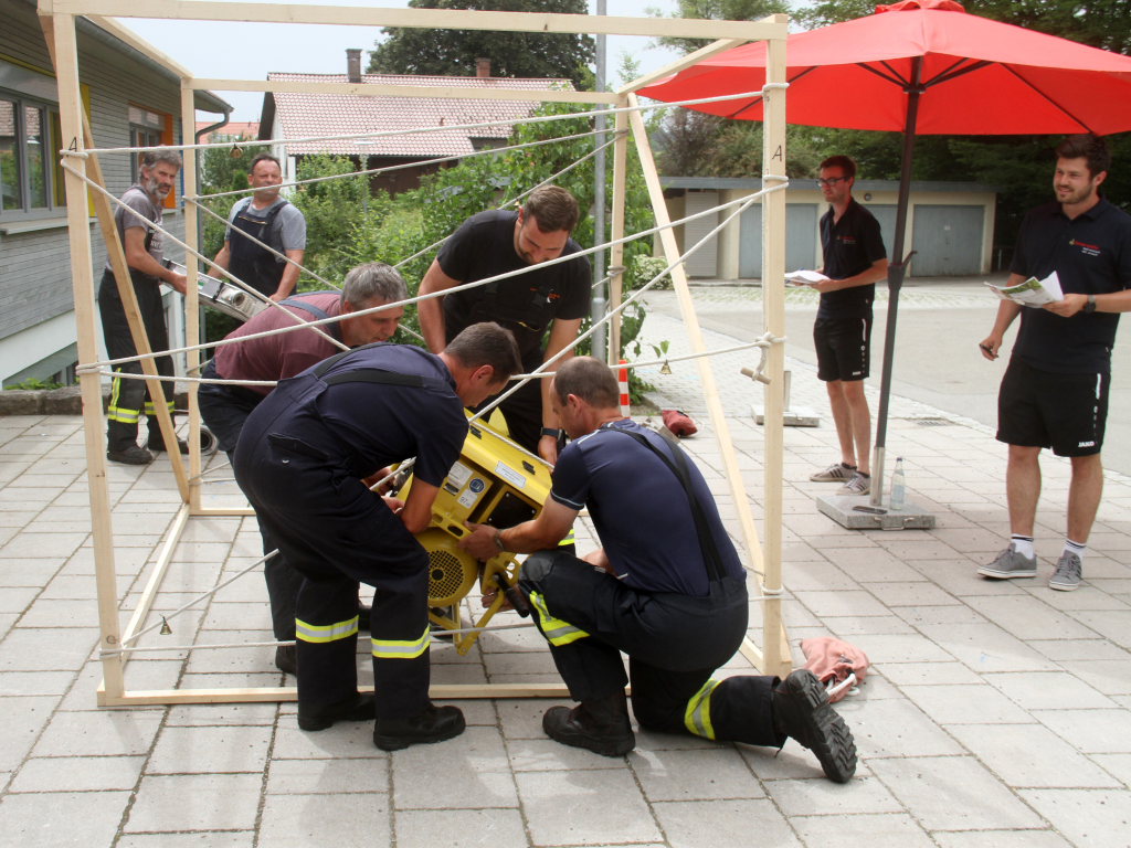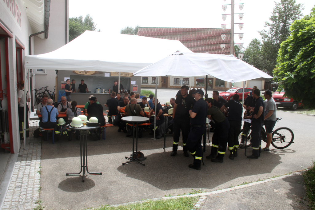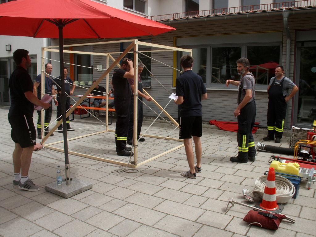 Somit machten sich zwölf Mannschaften mit Jugendfeuerwehr und als Gast die Wehr aus Diepolshofen daran, die sechs Aufgaben zu lösen. Los ging es beim Feuerwehrhaus, wo zunächst die Köpfe zu rauchen begannen, kein Wunder bei über 30 Grad im Schatten. Dabei mussten die Teams feuerwehrtechnische Fragen beantworten, aber auch Fragen der Allgemeinbildung: z.B „Wer schrieb die deutsche Nationalhymne, „Wann wurde die Freiheitsstatue gebaut?“ oder „Wie hoch ist die Zugspitze?“
